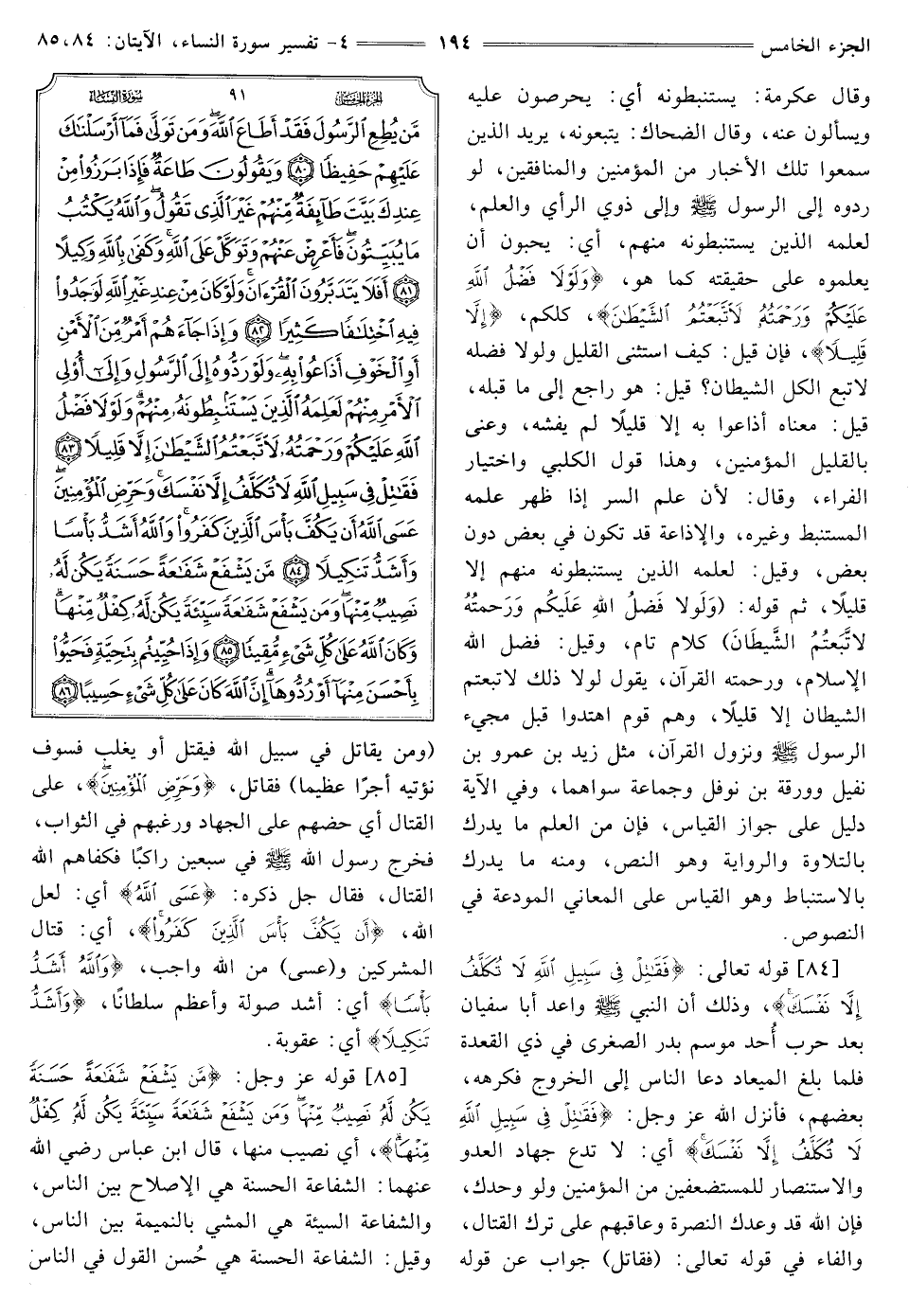 [84] قَوْلُهُ تَعَالَى: {فَقَاتِلْ فِي سَبِيلِ اللَّهِ لَا تُكَلَّفُ إِلَّا نَفْسَكَ} [النساء: 84] وَذَلِكَ أَنَّ النَّبِيَّ صَلَّى اللَّهُ عَلَيْهِ وَسَلَّمَ وَاعَدَ أَبَا سُفْيَانَ بَعْدَ حَرْبِ أُحُد مَوْسِمَ بَدْرٍ الصُّغْرَى فِي ذِي الْقِعْدَةِ فَلَمَّا بَلَغَ الْمِيعَادُ دَعَا النَّاسَ إِلَى الْخُرُوجِ فَكَرِهَهُ بَعْضُهُمْ، فَأَنْزَلَ اللَّهُ عَزَّ وَجَلَّ: {فَقَاتِلْ فِي سَبِيلِ اللَّهِ لَا تُكَلَّفُ إِلَّا نَفْسَكَ} [النساء: 84] أَيْ: لَا تَدَعْ جِهَادَ الْعَدُوِّ والاستنصار لِلْمُسْتَضْعَفِينَ مِنَ الْمُؤْمِنِينَ وَلَوْ وَحْدَكَ، فَإِنَّ اللَّهَ قَدْ وَعَدَكَ النُّصْرَةَ وعاقبهم عَلَى تَرْكِ الْقِتَالِ، وَالْفَاءُ فِي قَوْلِهِ تَعَالَى: (فَقَاتِلْ) جَوَابٌ عَنْ قَوْلِهِ {وَمَنْ يُقَاتِلْ فِي سَبِيلِ اللَّهِ فَيُقْتَلْ أَوْ يَغْلِبْ فَسَوْفَ نُؤْتِيهِ أَجْرًا عَظِيمًا} [النساء: 74] فَقَاتِلْ، {وَحَرِّضِ الْمُؤْمِنِينَ عَسَى اللَّهُ} [النساء: 84] أَيْ: حُضَّهُمْ عَلَى الْجِهَادِ وَرَغِّبْهُمْ فِي الثَّوَابِ، فَخَرَجَ رَسُولُ اللَّهِ صَلَّى اللَّهُ عَلَيْهِ وَسَلَّمَ فِي سَبْعِينَ رَاكِبًا فَكَفَاهُمُ اللَّهُ الْقِتَالَ، فَقَالَ جَلَّ ذِكْرُهُ: {عَسَى اللَّهُ} [النساء: 84] أَيْ: لَعَلَّ اللَّهَ، {أَنْ يَكُفَّ بَأْسَ الَّذِينَ كَفَرُوا} [النساء: 84] أي: قتال الْمُشْرِكِينَ و (عَسَى) مِنَ اللَّهِ واجب، {وَاللَّهُ أَشَدُّ بَأْسًا} [النساء: 84] أَيْ: أَشَدُّ صَوْلَةً وَأَعْظَمُ سُلْطَانًا، {وَأَشَدُّ تَنْكِيلًا} [النساء: 84] أي: عقوبة.