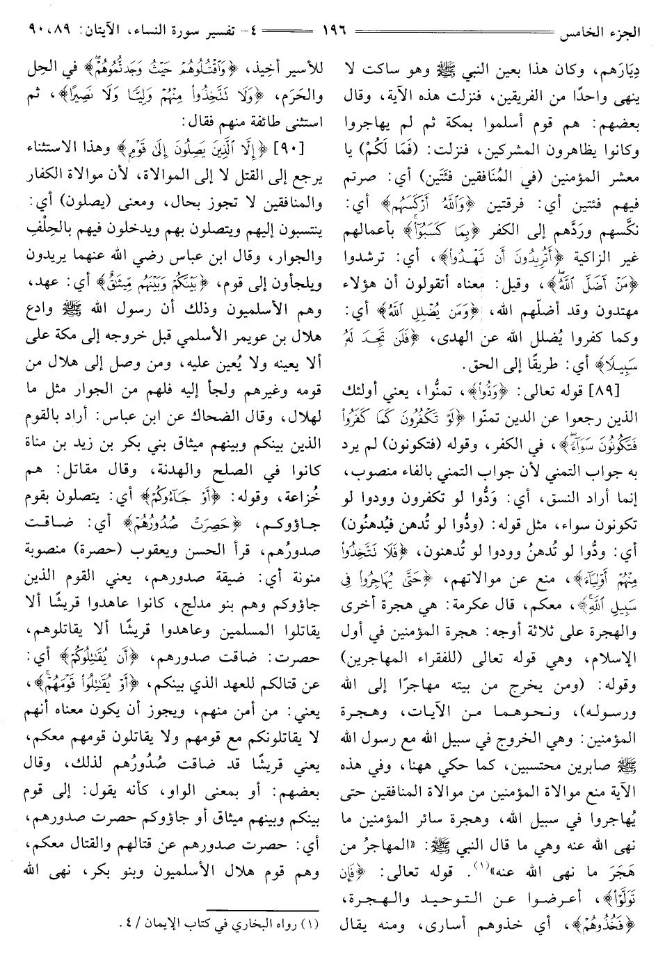 [89] قوله تعالى: {وَدُّوا} [النساء: 89] تمنَّوا، يَعْنِي أُولَئِكَ الَّذِينَ رَجَعُوا عَنِ الدِّينِ تَمَنَّوْا {لَوْ تَكْفُرُونَ كَمَا كَفَرُوا فَتَكُونُونَ سَوَاءً} [النساء: 89] فِي الْكُفْرِ، وَقَوْلُهُ (فَتَكُونُونَ) لَمْ يُرَدْ بِهِ جَوَابُ التَّمَنِّي لِأَنَّ جَوَابَ التَّمَنِّي بِالْفَاءِ مَنْصُوبٌ، إِنَّمَا أَرَادَ النَّسَقَ، أَيْ: وَدُّوا لَوْ تَكْفُرُونَ وَوَدُّوا لَوْ تَكُونُونَ سَوَاءً، مِثْلَ قَوْلِهِ: {وَدُّوا لَوْ تُدْهِنُ فَيُدْهِنُونَ} [الْقَلَمِ: 9] أَيْ: وَدُّوا لَوْ تُدْهِنُ وَوَدُّوا لَوْ تُدْهِنُونَ، {فَلَا تَتَّخِذُوا مِنْهُمْ أَوْلِيَاءَ} [النساء: 89] منع عن مُوَالَاتِهِمْ، {حَتَّى يُهَاجِرُوا فِي سَبِيلِ اللَّهِ} [النساء: 89] مَعَكُمْ، قَالَ عِكْرِمَةُ: هِيَ هِجْرَةٌ أُخْرَى وَالْهِجْرَةُ عَلَى ثَلَاثَةِ أَوْجُهٍ: هِجْرَةُ الْمُؤْمِنِينَ فِي أَوَّلِ الْإِسْلَامِ، وَهِيَ قَوْلُهُ تَعَالَى {لِلْفُقَرَاءِ الْمُهَاجِرِينَ} [الْحَشْرِ: 8] وَقَوْلُهُ: {وَمَنْ يَخْرُجْ مِنْ بَيْتِهِ مُهَاجِرًا إِلَى اللَّهِ وَرَسُولِهِ} [النِّسَاءِ: 100] وَنَحْوَهُمَا مِنَ الْآيَاتِ، وَهِجْرَةُ المؤمنين: وَهِيَ الْخُرُوجُ فِي سَبِيلِ اللَّهِ مَعَ رَسُولِ اللَّهِ صَلَّى اللَّهُ عليه وسلم صابرين محتسبين، كما حكي هاهنا، وفي هذه الآية منع موالاة المؤمنين من موالاة المنافقين حَتَّى يُهَاجِرُوا فِي سَبِيلِ اللَّهِ، وهجرة سائر المؤمنين ما نهى الله عنه، وَهِيَ مَا قَالَ النَّبِيُّ صَلَّى اللَّهُ عَلَيْهِ وَسَلَّمَ: «الْمُهَاجِرُ مَنْ هَجَرَ مَا نَهَى اللَّهُ عَنْهُ» (¬1) . قوله تعالى: {فَإِنْ تَوَلَّوْا} [النساء: 89] أَعْرَضُوا عَنِ التَّوْحِيدِ وَالْهِجْرَةِ، {فَخُذُوهُمْ} [النساء: 89] أَيْ خُذُوهُمْ أُسَارَى، وَمِنْهُ يُقَالُ لِلْأَسِيرِ أَخِيذٌ، {وَاقْتُلُوهُمْ حَيْثُ وَجَدْتُمُوهُمْ} [النساء: 89] فِي الْحِلِّ وَالْحَرَمِ، {وَلَا تَتَّخِذُوا مِنْهُمْ وَلِيًّا وَلَا نَصِيرًا} [النساء: 89] ثُمَّ اسْتَثْنَى طَائِفَةً مِنْهُمْ فَقَالَ: