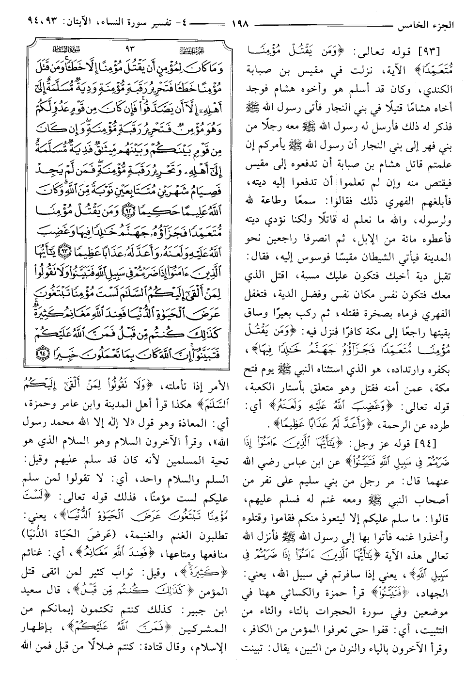 [93] قَوْلُهُ تَعَالَى: {وَمَنْ يَقْتُلْ مُؤْمِنًا مُتَعَمِّدًا} [النساء: 93] الْآيَةَ، نَزَلَتْ فِي مِقْيَسِ بْنِ صبابة الكندي، وَكَانَ قَدْ أَسْلَمَ هُوَ وَأَخُوهُ هِشَامٌ فَوَجَدَ أَخَاهُ هِشَامًا قَتِيلًا فِي بَنِي النَّجَّارِ فَأَتَى رَسُولَ اللَّهِ صَلَّى اللَّهُ عَلَيْهِ وَسَلَّمَ فذكر له ذلك فأرسل لَهُ رَسُولُ اللَّهِ صَلَّى اللَّهُ عَلَيْهِ وَسَلَّمَ مَعَهُ رَجُلًا مِنْ بَنِي فِهْرٍ إِلَى بَنِي النَّجَّارِ أَنَّ رَسُولَ اللَّهِ صَلَّى اللَّهُ عَلَيْهِ وَسَلَّمَ يَأْمُرُكُمْ إِنْ عَلَّمْتُمْ قَاتِلَ هِشَامِ بْنِ صُبَابَةَ أَنْ تَدْفَعُوهُ إِلَى مِقْيَسِ فَيَقْتَصَّ مِنْهُ وَإِنْ لَمْ تَعْلَمُوا أَنْ تَدْفَعُوا إِلَيْهِ دِيَتَهُ، فَأَبْلَغَهُمُ الْفِهْرِيُّ ذَلِكَ فَقَالُوا: سَمْعًا وَطَاعَةً لِلَّهِ وَلِرَسُولِهِ، وَاللَّهِ مَا نَعْلَمُ لَهُ قَاتِلًا وَلَكِنَّا نُؤَدِّي دِيَتَهُ فَأَعْطَوْهُ مِائَةً مِنَ الْإِبِلِ، ثُمَّ انْصَرَفَا رَاجِعَيْنِ نحو المدينة فيأتي الشَّيْطَانُ مِقْيَسًا فَوَسْوَسَ إِلَيْهِ، فَقَالَ: تَقْبَلُ دِيَةَ أَخِيكَ فَتَكُونُ عَلَيْكَ مَسَبَّةٌ، اقْتُلِ الَّذِي مَعَكَ فَتَكُونَ نَفْسٌ مَكَانَ نَفْسٍ وَفَضْلُ الدِّيَةِ، فتغفل الفهري فرماه بصخرة فقتله، ثُمَّ رَكِبَ بَعِيرًا وَسَاقَ بَقِيَّتَهَا رَاجِعًا إِلَى مَكَّةَ كَافِرًا فَنَزَلَ فِيهِ: {وَمَنْ يَقْتُلْ مُؤْمِنًا مُتَعَمِّدًا فَجَزَاؤُهُ جَهَنَّمُ خَالِدًا فِيهَا} [النساء: 93] بكفره وارتداده، هو الَّذِي اسْتَثْنَاهُ النَّبِيُّ صَلَّى اللَّهُ عَلَيْهِ وَسَلَّمَ يَوْمَ فَتْحِ مَكَّةَ، عَمَّنْ أَمَّنَهُ فَقُتِلَ وَهُوَ مُتَعَلِّقٌ بِأَسْتَارِ الْكَعْبَةِ، قَوْلُهُ تَعَالَى: {وَغَضِبَ اللَّهُ عَلَيْهِ وَلَعَنَهُ} [النساء: 93] أَيْ: طَرَدَهُ عَنِ الرَّحْمَةِ، {وَأَعَدَّ لَهُ عَذَابًا عَظِيمًا} [النساء: 93]