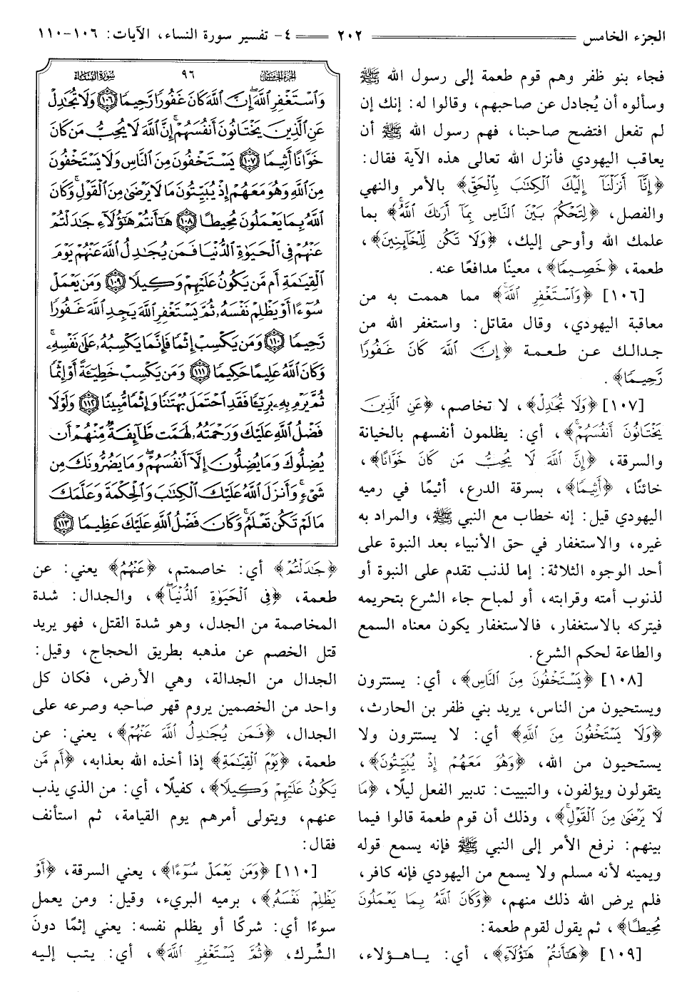[110] {وَمَنْ يَعْمَلْ سُوءًا} [النساء: 110] يَعْنِي السَّرِقَةَ، {أَوْ يَظْلِمْ نَفْسَهُ} [النساء: 110] بِرَمْيهِ الْبَرِيءَ، وَقِيلَ: وَمَنْ يَعْمَلْ سُوءًا أَيْ: شِرْكًا أَوْ يَظْلِمْ نَفْسَهُ: يَعْنِي إِثْمًا دُونَ الشِّرْكِ، {ثُمَّ يَسْتَغْفِرِ اللَّهَ} [النساء: 110] أَيْ: يَتُبْ إِلَيْهِ