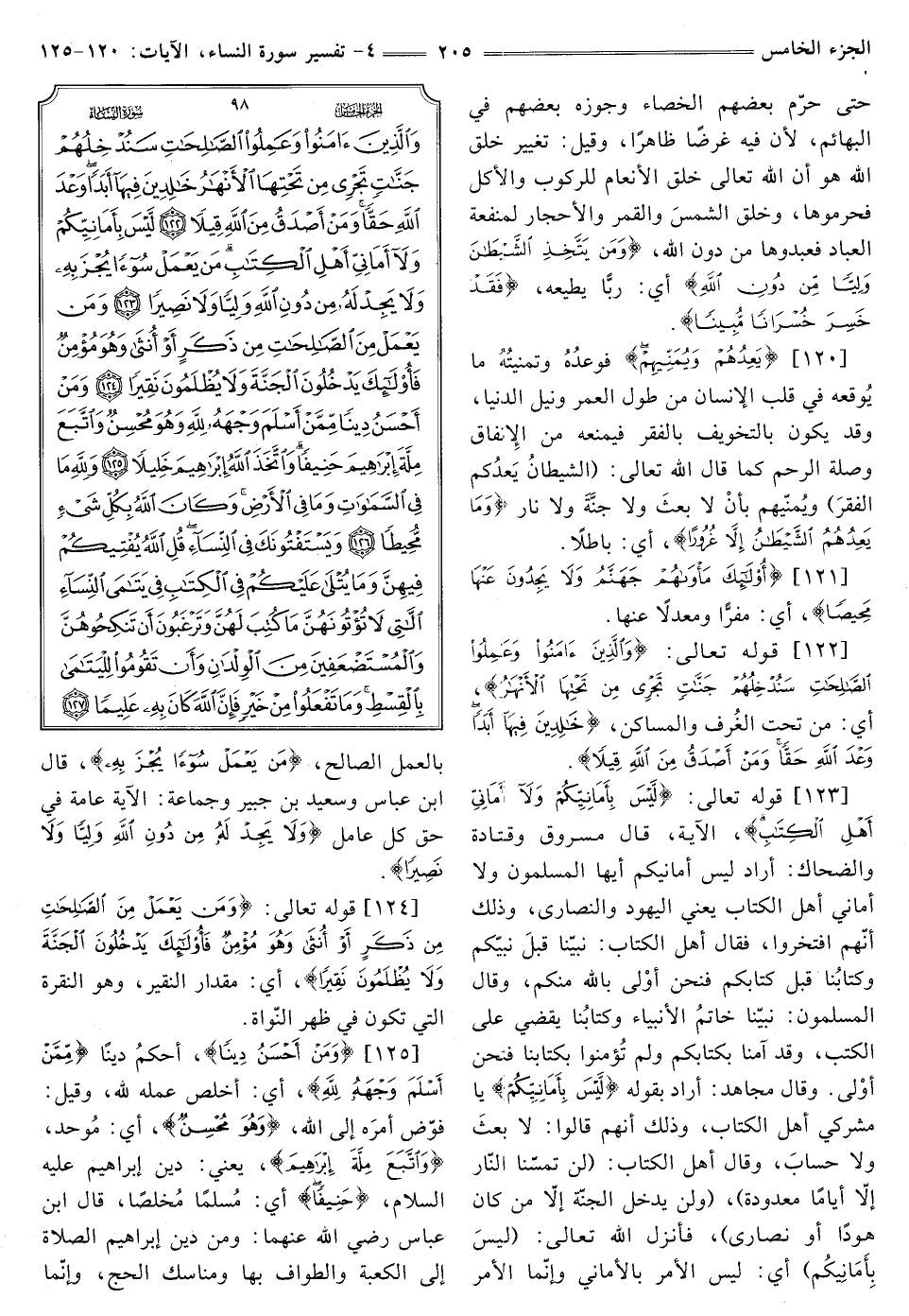 [125] {وَمَنْ أَحْسَنُ دِينًا} [النساء: 125] أَحْكَمُ دِينًا {مِمَّنْ أَسْلَمَ وَجْهَهُ لِلَّهِ} [النساء: 125] أَيْ: أَخْلَصَ عَمَلَهُ لِلَّهِ، وَقِيلَ: فَوَّضَ أَمْرَهُ إِلَى اللَّهِ، {وَهُوَ مُحْسِنٌ} [النساء: 125] أَيْ: مُوَحِّدٌ، {وَاتَّبَعَ مِلَّةَ إِبْرَاهِيمَ} [النساء: 125] يَعْنِي: دِينَ إِبْرَاهِيمَ عَلَيْهِ السَّلَامُ، {حَنِيفًا} [النساء: 125] أَيْ: مُسْلِمًا مُخْلِصًا، قَالَ ابْنُ عَبَّاسٍ رَضِيَ اللَّهُ عَنْهُمَا: وَمِنْ دِينِ إِبْرَاهِيمَ الصَّلَاةُ إِلَى الْكَعْبَةِ وَالطَّوَافُ بِهَا وَمَنَاسِكُ الْحَجِّ، وَإِنَّمَا