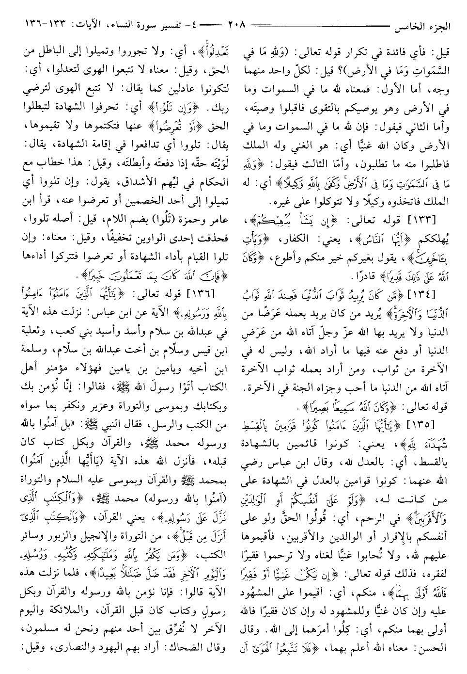 [135] {يَا أَيُّهَا الَّذِينَ آمَنُوا كُونُوا قَوَّامِينَ بِالْقِسْطِ شُهَدَاءَ لِلَّهِ} [النساء: 135] يَعْنِي: كُونُوا قَائِمِينَ بِالشَّهَادَةِ بِالْقِسْطِ، أَيْ: بِالْعَدْلِ لِلَّهِ، وَقَالَ ابْنُ عَبَّاسٍ رَضِيَ اللَّهُ عَنْهُمَا: كُونُوا قَوَّامِينَ بِالْعَدْلِ فِي الشَّهَادَةِ عَلَى من كانت له، {وَلَوْ عَلَى أَنْفُسِكُمْ أَوِ الْوَالِدَيْنِ وَالْأَقْرَبِينَ} [النساء: 135] فِي الرَّحِمِ، أَيْ: قُولُوا الْحَقَّ وَلَوْ عَلَى أَنْفُسِكُمْ بِالْإِقْرَارِ أَوِ الْوَالِدَيْنِ وَالْأَقْرَبِينَ، فَأَقِيمُوهَا عَلَيْهِمْ لِلَّهِ، وَلَا تُحابوا غَنِيًّا لِغِنَاهُ وَلَا تَرْحَمُوا فَقِيرًا لِفَقْرِهِ، فَذَلِكَ قَوْلُهُ تَعَالَى: {إِنْ يَكُنْ غَنِيًّا أَوْ فَقِيرًا فَاللَّهُ أَوْلَى بِهِمَا} [النساء: 135] مِنْكُمْ، أَيْ: أَقِيمُوا عَلَى الْمَشْهُودِ عَلَيْهِ وَإِنْ كَانَ غَنِيًّا وَلِلْمَشْهُودِ لَهُ وَإِنْ كَانَ فَقِيرًا فَاللَّهُ أَوْلَى بِهِمَا مِنْكُمْ، أَيْ: كِلوا أَمْرَهُمَا إِلَى اللَّهِ. وَقَالَ الْحَسَنُ: مَعْنَاهُ اللَّهُ أَعْلَمُ بِهِمَا، {فَلَا تَتَّبِعُوا الْهَوَى أَنْ تَعْدِلُوا} [النساء: 135] أي: ولا تَجُورُوا وَتَمِيلُوا إِلَى الْبَاطِلِ مِنَ الْحَقِّ، وَقِيلَ: مَعْنَاهُ لَا تَتَّبِعُوا الْهَوَى لِتَعْدِلُوا، أَيْ: لِتَكُونُوا عَادِلِينَ كَمَا يُقَالُ: لَا تَتَّبِعِ الْهَوَى لترضي ربك. {وَإِنْ تَلْوُوا} [النساء: 135] أَيْ: تُحَرِّفُوا الشَّهَادَةَ لِتُبْطِلُوا الْحَقَّ {أَوْ تُعْرِضُوا} [النساء: 135] عنها فتكتموها ولا تقيموها، يقال: تَلْوُوا أَيْ تُدَافِعُوا فِي إِقَامَةِ الشَّهَادَةِ، يُقَالُ: لَوَيْتَه حَقَّهُ إِذَا دفعتَه وأبطلتَه، وَقِيلَ: هَذَا خِطَابٌ مَعَ الْحُكَّامِ فِي ليِّهم الْأَشْدَاقَ، يَقُولُ: وَإِنْ تَلْوُوا أَيْ تَمِيلُوا إِلَى أَحَدِ الْخَصْمَيْنِ أَوْ تُعْرِضُوا عَنْهُ، قَرَأَ ابْنُ عَامِرٍ وَحَمْزَةُ (تَلُوا) بِضَمِّ اللَّامِ، قِيلَ: أَصْلُهُ تَلْوُوا، فَحُذِفَتْ إِحْدَى الْوَاوَيْنِ تَخْفِيفًا، وَقِيلَ: مَعْنَاهُ: وَإِنْ تَلُوا الْقِيَامَ بِأَدَاءِ الشَّهَادَةِ أَوْ تُعْرِضُوا فَتَتْرُكُوا أَدَاءَهَا {فَإِنَّ اللَّهَ كَانَ بِمَا تَعْمَلُونَ خَبِيرًا} [النساء: 135]