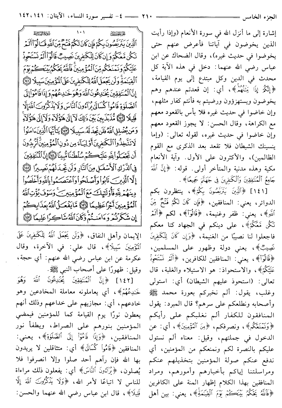 [142] {إِنَّ الْمُنَافِقِينَ يُخَادِعُونَ اللَّهَ وَهُوَ خَادِعُهُمْ} [النِّسَاءِ: 142] أَيْ يُعَامِلُونَهُ مُعَامَلَةَ الْمُخَادِعِينَ وَهُوَ خَادِعُهُمْ، أَيْ: مُجَازِيهِمْ عَلَى خِدَاعِهِمْ وَذَلِكَ أَنَّهُمْ يُعْطَوْنَ نُورًا يَوْمَ القيامة كما للمؤمنين فيمضي المؤمنين بِنُورِهِمْ عَلَى الصِّرَاطِ، وَيُطْفَأُ نُورُ الْمُنَافِقِينَ، {وَإِذَا قَامُوا إِلَى الصَّلَاةِ} [النساء: 142] يعني: المنافقين {قَامُوا كُسَالَى} [النساء: 142] أَيْ: مُتَثَاقِلِينَ لَا يُرِيدُونَ بِهَا اللَّهَ فَإِنْ رَآهُمْ أَحَدٌ صَلَّوْا وَإِلَّا انْصَرَفُوا فَلَا يُصَلُّونَ، {يُرَاءُونَ النَّاسَ} [النساء: 142] أَيْ: يَفْعَلُونَ ذَلِكَ مُرَاءَاةً لِلنَّاسِ لَا اتِّبَاعًا لِأَمْرِ اللَّهِ، {وَلَا يَذْكُرُونَ اللَّهَ إِلَّا قَلِيلًا} [النساء: 142] قَالَ ابْنُ عَبَّاسٍ رَضِيَ اللَّهُ عَنْهُمَا وَالْحَسَنُ: