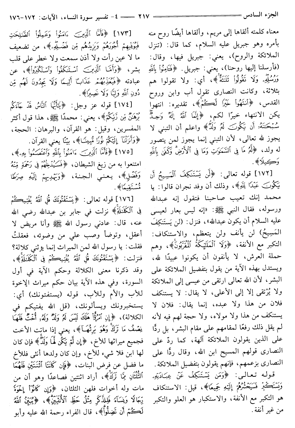 [176] قَوْلُهُ تَعَالَى: {يَسْتَفْتُونَكَ قُلِ اللَّهُ يُفْتِيكُمْ فِي الْكَلَالَةِ} [النساء: 176] نَزَلَتْ فِي جَابِرِ بْنِ عَبْدِ اللَّهِ رَضِيَ اللَّهُ عَنْهُ، قَالَ: عَادَنِي رَسُولُ اللَّهِ صَلَّى اللَّهُ عَلَيْهِ وَسَلَّمَ وَأَنَا مَرِيضٌ لَا أعقل، وتوضأ وَصَبَّ عَلَيَّ مِنْ وَضُوئِهِ، فعقلتُ فَقُلْتُ: يَا رَسُولَ اللَّهِ لِمَنِ الْمِيرَاثُ إِنَّمَا يَرِثُنِي كَلَالَةً؟ فَنَزَلَتْ {يَسْتَفْتُونَكَ قُلِ اللَّهُ يُفْتِيكُمْ فِي الْكَلَالَةِ} [النساء: 176] وَقَدْ ذَكَرْنَا مَعْنَى الْكَلَالَةِ وَحُكْمَ الْآيَةِ فِي أَوَّلِ السُّورَةِ، وَفِي هَذِهِ الْآيَةِ بَيَانُ حُكْمِ مِيرَاثِ الإخوة للأب والأم وللأب، قوله {يَسْتَفْتُونَكَ} [النساء: 176] أَيْ: يَسْتَخْبِرُونَكَ وَيَسْأَلُونَكَ {قُلِ اللَّهُ يُفْتِيكُمْ فِي الْكَلَالَةِ إِنِ امْرُؤٌ هَلَكَ لَيْسَ لَهُ وَلَدٌ وَلَهُ أُخْتٌ فَلَهَا نِصْفُ مَا تَرَكَ وَهُوَ يَرِثُهَا} [النساء: 176] يَعْنِي إِذَا مَاتَتِ الْأُخْتُ فَجَمِيعُ مِيرَاثِهَا لِلْأَخِ، {إِنْ لَمْ يَكُنْ لَهَا وَلَدٌ} [النساء: 176] فَإِنْ كَانَ لَهَا ابْنٌ فَلَا شَيْءَ لِلْأَخِ، وَإِنْ كَانَ وَلَدُهَا أُنْثَى فَلِلْأَخِ مَا فَضُلَ عَنْ فَرْضِ الْبَنَاتِ، {فَإِنْ كَانَتَا اثْنَتَيْنِ فَلَهُمَا الثُّلُثَانِ مِمَّا تَرَكَ} [النساء: 176] أَرَادَ اثْنَتَيْنِ فَصَاعِدًا وَهُوَ أَنَّ مَنْ مَاتَ وَلَهُ أَخَوَاتٌ فَلَهُنَّ الثُّلْثَانِ، {وَإِنْ كَانُوا إِخْوَةً رِجَالًا وَنِسَاءً فَلِلذَّكَرِ مِثْلُ حَظِّ الْأُنْثَيَيْنِ يُبَيِّنُ اللَّهُ لَكُمْ أَنْ تَضِلُّوا} [النساء: 176] قَالَ الْفَرَّاءُ رَحْمَةُ اللَّهِ عَلَيْهِ وَأَبُو