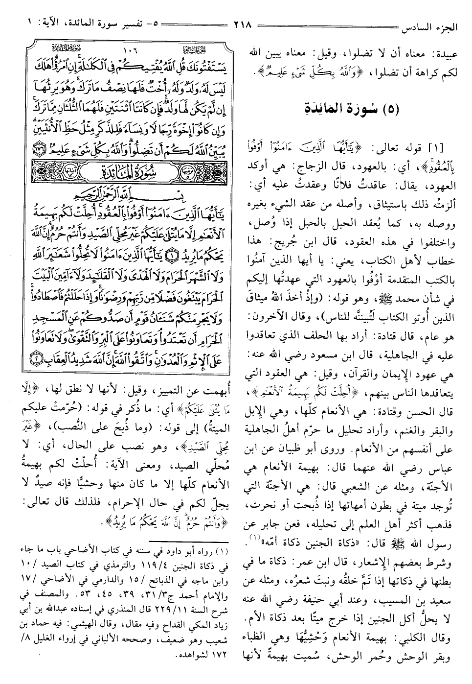 (5) سورة المائدة بسم الله الرحمن الرحيم [1] قَوْلُهُ تَعَالَى: {يَا أَيُّهَا الَّذِينَ آمَنُوا أَوْفُوا بِالْعُقُودِ} [المائدة: 1] أَيْ: بِالْعُهُودِ، قَالَ الزَّجَّاجُ: هِيَ أَوْكَدُ الْعُهُودِ، يُقَالُ: عاقدتُ فُلَانًا وعقدتُ عَلَيْهِ أَيْ: ألزمتُه ذَلِكَ بِاسْتِيثَاقٍ، وَأَصْلُهُ مِنْ عَقْدِ الشَّيْءِ بِغَيْرِهِ وَوَصْلِهِ بِهِ، كَمَا يُعقد الْحَبْلُ بِالْحَبْلِ إِذَا وُصل، وَاخْتَلَفُوا فِي هَذِهِ الْعُقُودِ، قَالَ ابْنُ جُرَيْجٍ: هَذَا خِطَابٌ لِأَهْلِ الْكِتَابِ، يَعْنِي: يَا أَيُّهَا الَّذِينَ آمَنُوا بِالْكُتُبِ الْمُتَقَدِّمَةِ أَوْفُوا بِالْعُهُودِ الَّتِي عهدتُها إِلَيْكُمْ فِي شَأْنِ مُحَمَّدٍ صَلَّى اللَّهُ عَلَيْهِ وَسَلَّمَ، وَهُوَ قَوْلِهِ: {وَإِذْ أَخَذَ اللَّهُ مِيثَاقَ الَّذِينَ أُوتُوا الْكِتَابَ لَتُبَيِّنُنَّهُ لِلنَّاسِ} [آلِ عِمْرَانَ: 187] وَقَالَ الْآخَرُونَ: هُوَ عام، قال قَتَادَةُ: أَرَادَ بِهَا الْحِلْفَ الَّذِي تعاقدوا عليه في الجاهلية، قَالَ ابْنُ مَسْعُودٍ رَضِيَ اللَّهُ عَنْهُ: هِيَ عُهُودُ الْإِيمَانِ وَالْقُرْآنِ، وَقِيلَ: هِيَ الْعُقُودُ الَّتِي يَتَعَاقَدُهَا النَّاسُ بَيْنَهُمْ، {أُحِلَّتْ لَكُمْ بَهِيمَةُ الْأَنْعَامِ} [المائدة: 1] قَالَ الْحَسَنُ وَقَتَادَةُ: هِيَ الْأَنْعَامُ كُلُّهَا، وَهِيَ الْإِبِلُ وَالْبَقَرُ وَالْغَنَمُ، وَأَرَادَ تَحْلِيلَ مَا حَرَّمَ أَهْلُ الْجَاهِلِيَّةِ عَلَى أَنْفُسِهِمْ مِنَ الْأَنْعَامِ. وَرَوَى أَبُو ظَبْيَانَ عَنِ ابْنِ عَبَّاسٍ رَضِيَ اللَّهُ عَنْهُمَا قَالَ: بَهِيمَةُ الْأَنْعَامِ هِيَ الْأَجِنَّةُ، وَمِثْلُهُ عَنِ الشَّعْبِيِّ قَالَ: هِيَ الْأَجِنَّةُ الَّتِي تُوجَدُ مَيْتَةً فِي بُطُونِ أُمَّهَاتِهَا إِذَا ذُبحت أَوْ نُحِرَتْ، فَذَهَبَ أَكْثَرُ أَهْلِ الْعِلْمِ إِلَى تحليله، فعن جَابِرٍ عَنْ رَسُولِ اللَّهِ صَلَّى اللَّهُ عَلَيْهِ وَسَلَّمَ قَالَ: «ذَكَاةُ الْجَنِينِ ذَكَاةُ أُمِّهِ» (¬1) . وَشَرَطَ بَعْضُهُمُ الْإِشْعَارَ، قَالَ ابْنُ عُمَرَ: ذَكَاةُ مَا فِي بَطْنِهَا فِي ذَكَاتِهَا إِذَا تَمَّ خلقُه وَنَبَتَ شعرُه، وَمِثْلُهُ عَنْ سَعِيدِ بْنِ الْمُسَيَّبِ، وَعِنْدَ أَبِي حَنِيفَةَ رَضِيَ اللَّهُ عَنْهُ لَا يَحِلُّ أَكْلُ الْجَنِينِ إِذَا خَرَجَ مَيْتًا بَعْدَ ذَكَاةِ الْأُمِّ. وَقَالَ الْكَلْبِيُّ: بَهِيمَةُ الْأَنْعَامِ وَحْشِيُّها وَهِيَ الظِّبَاءُ وَبَقَرُ الْوَحْشِ وحُمر الْوَحْشِ، سُمِّيَتْ بَهِيمَةً لِأَنَّهَا أُبهمت عَنِ التَّمْيِيزِ، وَقِيلَ: لِأَنَّهَا لَا نُطْقَ لَهَا، {إِلَّا مَا يُتْلَى عَلَيْكُمْ} [المائدة: 1] أَيْ: مَا ذُكر فِي قَوْلِهِ: {حُرِّمَتْ عَلَيْكُمُ الْمَيْتَةُ} [المائدة: 3] إِلَى قَوْلِهِ: {وَمَا ذُبِحَ عَلَى النُّصُبِ} [المائدة: 3] {غَيْرَ مُحِلِّي الصَّيْدِ} [المائدة: 1] وَهُوَ نَصْبٌ عَلَى الْحَالِ، أَيْ: لَا مُحلّي الصَّيْدِ، وَمَعْنَى الْآيَةِ: أُحلت لَكُمْ بَهِيمَةُ الْأَنْعَامِ كُلُّهَا إِلَّا مَا كَانَ مِنْهَا وَحْشِيًّا فَإِنَّهُ صَيْدٌ لَا يَحِلُ لَكُمْ في حال الإحرام، فلذلك قال تَعَالَى: {وَأَنْتُمْ حُرُمٌ إِنَّ اللَّهَ يَحْكُمُ مَا يُرِيدُ} [المائدة: 1]