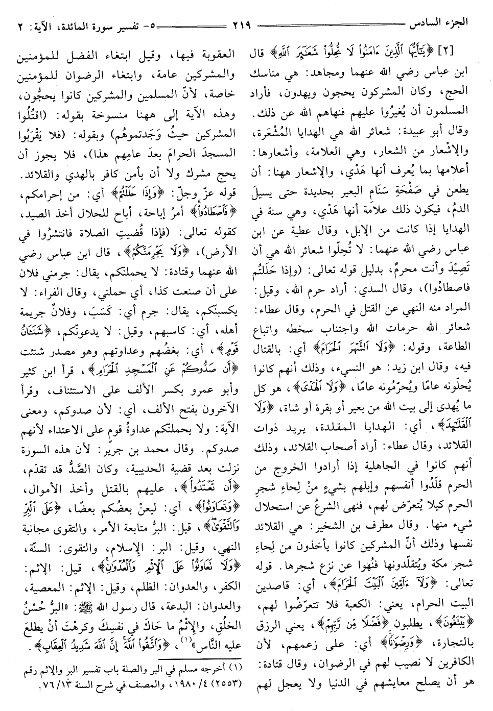[2] {يَا أَيُّهَا الَّذِينَ آمَنُوا لَا تُحِلُّوا شَعَائِرَ اللَّهِ} [المائدة: 2] قَالَ ابْنُ عَبَّاسٍ رَضِيَ اللَّهُ عنهما وَمُجَاهِدٌ: هِيَ مَنَاسِكُ الْحَجِّ، وَكَانَ الْمُشْرِكُونَ يَحُجُّونَ وَيُهْدُونَ، فَأَرَادَ الْمُسْلِمُونَ أَنْ يُغِيروا عَلَيْهِمْ فَنَهَاهُمُ اللَّهُ عَنْ ذَلِكَ. وَقَالَ أَبُو عُبَيْدَةَ: شَعَائِرُ اللَّهِ هِيَ الْهَدَايَا المُشْعَرة، وَالْإِشْعَارُ مِنَ الشِّعَارِ، وَهِيَ الْعَلَامَةُ، وَإِشْعَارُهَا: إِعْلَامُهَا بِمَا يُعرف أَنَّهَا هَدْي، وَالْإِشْعَارُ هَاهُنَا: أَنْ يَطْعَنَ فِي صَفْحَةِ سَنَامِ الْبَعِيرِ بِحَدِيدَةٍ حَتَّى يَسِيلَ الدَّمُ، فَيَكُونُ ذَلِكَ عَلَامَةً أَنَّهَا هَدْيٌ، وَهِيَ سُنَّةٌ فِي الْهَدَايَا إِذَا كَانَتْ مِنَ الإبل، وَقَالَ عَطِيَّةُ عَنِ ابْنِ عَبَّاسٍ رَضِيَ اللَّهُ عَنْهُمَا: لَا تُحِلُّوا شَعَائِرَ اللَّهِ هِيَ أَنْ تَصِيدَ وَأَنْتَ مُحْرِمٌ، بِدَلِيلِ قَوْلِهِ تَعَالَى: {وَإِذَا حَلَلْتُمْ فَاصْطَادُوا} [المائدة: 2] وَقَالَ السُّدِّيُّ: أَرَادَ حَرَمَ اللَّهِ، وَقِيلَ: الْمُرَادُ مِنْهُ النَّهْيُ عَنِ الْقَتْلِ فِي الْحَرَمِ، وَقَالَ عَطَاءٌ: شَعَائِرُ اللَّهِ حُرُمَاتُ اللَّهِ وَاجْتِنَابُ سخطه واتباع الطاعة، وقوله: {وَلَا الشَّهْرَ الْحَرَامَ} [المائدة: 2] أَيْ: بِالْقِتَالِ فِيهِ، وَقَالَ ابْنُ زَيْدٍ: هُوَ النَّسِيءُ، وَذَلِكَ أَنَّهُمْ كانوا يُحِلّونه عَامًا ويُحرّمونه عَامًا، {وَلَا الْهَدْيَ} [المائدة: 2] هو كُلُّ مَا يُهدى إِلَى بَيْتِ اللَّهِ مِنْ بَعِيرٍ أَوْ بَقَرَةٍ أو شاة، {وَلَا الْقَلَائِدَ} [المائدة: 2] أَيِ: الْهَدَايَا الْمُقَلَّدَةُ، يُرِيدُ ذَوَاتَ الْقَلَائِدِ، وَقَالَ عَطَاءٌ: أَرَادَ أَصْحَابَ الْقَلَائِدِ، وَذَلِكَ أَنَّهُمْ كَانُوا فِي الْجَاهِلِيَّةِ إِذَا أَرَادُوا الْخُرُوجَ مِنَ الْحَرَمِ قَلَّدُوا أَنْفُسَهُمْ وَإِبِلَهُمْ بِشَيْءٍ مِنْ لِحاء شَجَرِ الْحَرَمِ كَيْلَا يُتعرّض لَهُمْ، فَنَهَى الشَّرْعُ عَنِ اسْتِحْلَالِ شَيْءٍ مِنْهَا. وَقَالَ مُطَرِّفُ بْنُ الشِّخِّيرِ: هِيَ الْقَلَائِدُ نَفْسُهَا وَذَلِكَ أَنَّ الْمُشْرِكِينَ كَانُوا يَأْخُذُونَ مِنْ لِحاء شَجَرِ مَكَّةَ ويُتقلدونها فَنُهُوا عَنْ نَزْعِ شَجَرِهَا. قَوْلُهُ تَعَالَى: {وَلَا آمِّينَ الْبَيْتَ الْحَرَامَ} [المائدة: 2] أَيْ: قَاصِدِينَ الْبَيْتَ الْحَرَامَ، يَعْنِي: الْكَعْبَةَ فَلَا تَتَعَرَّضُوا لَهُمْ، {يَبْتَغُونَ} [المائدة: 2] يطلبون {فَضْلًا مِنْ رَبِّهِمْ} [المائدة: 2] يعني الرزق بالتجارة، {وَرِضْوَانًا} [المائدة: 2] أَيْ: عَلَى زَعْمِهِمْ، لِأَنَّ الْكَافِرِينَ لَا نَصِيبَ لَهُمْ فِي الرِّضْوَانِ، وَقَالَ قَتَادَةُ: هُوَ أَنْ يُصْلِحَ معايشهم فِي الدُّنْيَا وَلَا يُعَجِّلَ لَهُمُ الْعُقُوبَةَ فِيهَا، وَقِيلَ ابْتِغَاءُ الْفَضْلِ لِلْمُؤْمِنِينَ وَالْمُشْرِكِينَ عَامَّةً، وَابْتِغَاءُ الرِّضْوَانِ لِلْمُؤْمِنِينَ خَاصَّةً، لِأَنَّ الْمُسْلِمِينَ وَالْمُشْرِكِينَ كَانُوا يَحُجُّونَ، وَهَذِهِ الْآيَةُ إِلَى هَاهُنَا مَنْسُوخَةٌ بِقَوْلِهِ: {فَاقْتُلُوا الْمُشْرِكِينَ حَيْثُ وَجَدْتُمُوهُمْ} [التَّوْبَةِ: 5] وَبِقَوْلِهِ: {فَلَا يَقْرَبُوا الْمَسْجِدَ الْحَرَامَ بَعْدَ عَامِهِمْ هَذَا} [التَّوْبَةِ: 28] فَلَا يَجُوزُ أَنْ يَحُجَّ مُشْرِكٌ وَلَا أَنْ يَأُمَّنَ كَافِرٌ بِالْهَدْيِ وَالْقَلَائِدِ. قَوْلُهُ عَزَّ وَجَلَّ: {وَإِذَا حَلَلْتُمْ} [المائدة: 2] أي: من إحرامكم، {فَاصْطَادُوا} [المائدة: 2] أَمْرُ إِبَاحَةٍ، أَبَاحَ لِلْحَلَالِ أَخْذَ الصَّيْدِ، كَقَوْلِهِ تَعَالَى: {فَإِذَا قُضِيَتِ الصَّلَاةُ فَانْتَشِرُوا فِي الْأَرْضِ} [الْجُمُعَةِ: 10] {وَلَا يَجْرِمَنَّكُمْ} [المائدة: 2] قَالَ ابْنُ عَبَّاسٍ رَضِيَ اللَّهُ عنهما وَقَتَ