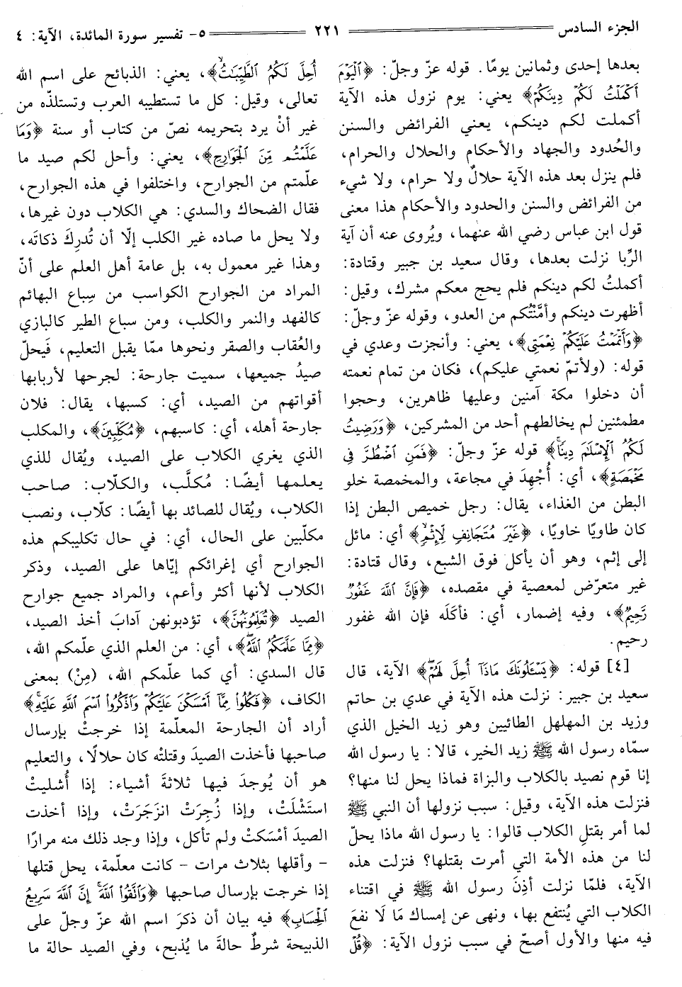 [4] قوله: {يَسْأَلُونَكَ مَاذَا أُحِلَّ لَهُمْ} [المائدة: 4] الْآيَةَ، قَالَ سَعِيدُ بْنُ جُبَيْرٍ: نَزَلَتْ هَذِهِ الْآيَةُ فِي عَدِيِّ بْنِ حَاتِمٍ وَزَيْدِ بْنِ الْمُهَلْهِلِ الطَّائِيَّيْنِ وَهُوَ زَيْدُ الْخَيْلِ الَّذِي سماه رسول الله زَيْدَ الْخَيْرِ، قَالَا: يَا رَسُولَ اللَّهِ إِنَّا قَوْمٌ نَصِيدُ بِالْكِلَابِ وَالْبُزَاةِ فَمَاذَا يَحِلُّ لَنَا مِنْهَا؟ فَنَزَلَتْ هَذِهِ الْآيَةُ، وَقِيلَ: سَبَبُ نُزُولِهَا أَنَّ النَّبِيَّ صَلَّى اللَّهُ عَلَيْهِ وَسَلَّمَ لَمَّا أَمَرَ بِقَتْلِ الْكِلَابِ قَالُوا: يَا رَسُولَ اللَّهِ مَاذَا يَحِلُّ لَنَا مِنْ هَذِهِ الْأُمَّةِ الَّتِي أَمَرْتَ بِقَتْلِهَا؟ فَنَزَلَتْ هَذِهِ الْآيَةُ، فَلَمَّا نَزَلَتْ أَذِنَ رَسُولِ اللَّهِ صَلَّى اللَّهُ عَلَيْهِ وَسَلَّمَ فِي اقْتِنَاءِ الْكِلَابِ الَّتِي يُنْتَفَعُ بِهَا، وَنَهَى عَنْ إِمْسَاكِ مَا لَا نَفْعَ فِيهِ مِنْهَا وَالْأَوَّلُ أَصَحُّ فِي سَبَبِ نِزُولِ الْآيَةِ: {قُلْ أُحِلَّ لَكُمُ الطَّيِّبَاتُ} [المائدة: 4] يَعْنِي: الذَّبَائِحَ عَلَى اسْمِ اللَّهِ تَعَالَى، وَقِيلَ: كُلُّ مَا تَسْتَطِيبُهُ الْعَرَبُ وَتَسْتَلِذُّهُ مِنْ غَيْرِ أَنْ يَرِدَ بِتَحْرِيمِهِ نَصٌّ مِنْ كِتَابٍ أَوْ سَنَةٍ {وَمَا عَلَّمْتُمْ مِنَ الْجَوَارِحِ} [المائدة: 4] يَعْنِي وَأُحِلَّ لَكُمْ صَيْدُ مَا عَلَّمْتُمْ مِنَ الْجَوَارِحِ، وَاخْتَلَفُوا فِي هَذِهِ الْجَوَارِحِ، فَقَالَ الضَّحَّاكُ وَالسُّدِّيُّ: هِيَ الْكِلَابُ دُونَ غَيْرِهَا، وَلَا يَحِلُّ مَا صَادَهُ غَيْرُ الْكَلْبِ إلا أن تدرِك ذكاتَه، وَهَذَا غَيْرُ مَعْمُولٍ بِهِ، بَلْ عَامَّةُ أَهْلِ الْعِلْمِ عَلَى أن المراد من الجوارح الكواسب مِنْ سِبَاعِ الْبَهَائِمِ كَالْفَهْدِ وَالنَّمِرِ وَالْكَلْبِ، وَمِنْ سِبَاعِ الطَّيْرِ كَالْبَازِي والعُقاب وَالصَّقْرِ وَنَحْوِهَا مِمَّا يَقْبَلُ التَّعْلِيمَ، فَيَحِلُّ صيدُ جَمِيعِهَا، سُمِّيَتْ جَارِحَةً: لِجَرْحِهَا لِأَرْبَابِهَا أَقْوَاتَهُمْ مِنَ الصَّيْدِ، أَيْ: كَسْبِهَا، يُقَالُ: فُلَانٌ جَارِحَةُ أَهْلِهِ، أَيْ: كَاسِبُهُمْ، {مُكَلِّبِينَ} [المائدة: 4] وَالْمُكَلِّبُ الَّذِي يُغْرِي الْكِلَابَ عَلَى الصَّيْدِ، وَيُقَالُ لِلَّذِي يُعَلِّمُهَا أَيْضًا: مُكَلِّبٌ، وَالْكَلَّابُ: صَاحِبُ الْكِلَابِ، وَيُقَالُ لِلصَّائِدِ بِهَا أَيْضًا: كَلَّابٌ، وَنَصَبَ مُكَلِّبِينِ عَلَى الْحَالِ، أَيْ: فِي حَالِ تَكْلِيبِكُمْ هَذِهِ الْجَوَارِحَ أَيْ إغرائكم إِيَّاهَا عَلَى الصَّيْدِ، وَذَكَرَ الْكِلَابَ لِأَنَّهَا أَكْثَرُ وَأَعَمُّ، وَالْمُرَادُ جَمِيعُ جوارح الصيد {تُعَلِّمُونَهُنَّ} [المائدة: 4] تُؤَدِّبُونَهُنَّ آدَابَ أَخْذِ الصَّيْدِ، {مِمَّا عَلَّمَكُمُ اللَّهُ} [المائدة: 4] أَيْ: مِنَ الْعِلْمِ الَّذِي عَلَّمَكُمُ الله، قال السُّدِّيُّ: أَيْ كَمَا عَلَّمَكُمُ اللَّهُ، (مِن) بِمَعْنَى الْكَافِ، {فَكُلُوا مِمَّا أَمْسَكْنَ عَلَيْكُمْ وَاذْكُرُوا اسْمَ اللَّهِ عَلَيْهِ} [المائدة: 4] أَرَادَ أَنَّ الْجَارِحَةَ الْمُعَلَّمَةَ إِذَا خَرَجَتْ بِإِرْسَالِ صَاحِبِهَا فَأَخَذَتِ الصَّيْدَ وَقَتَلَتْهُ كَانَ حَلَالًا، وَالتَّعْلِيمُ هُوَ أَنْ يُوجَدَ فِيهَا ثَلَاثَةُ أَشْيَاءَ: إِذَا أُشليتْ استشلتْ، وَإِذَا زُجرتْ انزجرتْ، وَإِذَا أَخَذَتِ الصَّيْدَ أَمْسَكَتْ وَلَمْ تَأْكُلْ، وَإِذَا وُجِدَ ذَلِكَ منه مرارا - وأقلها بثلاث مَرَّاتٍ - كَانَتْ مُعَلَّمَةً، يَحِلُّ قَتْلُهَا إذا خرجت بإرسال صاحبها {وَاتَّقُوا اللَّهَ إِنَّ اللَّهَ سَرِيعُ الْحِسَابِ} [المائدة: 4] فيه بَيَانُ أَنَّ ذِكْرَ اسْمِ اللَّهِ عَزَّ وَجَلَّ عَلَى الذَّبِيحَةِ شَرْطٌ حالةَ مَا يُذبح، وَفِي الصَّيْدِ حَالَةَ مَا