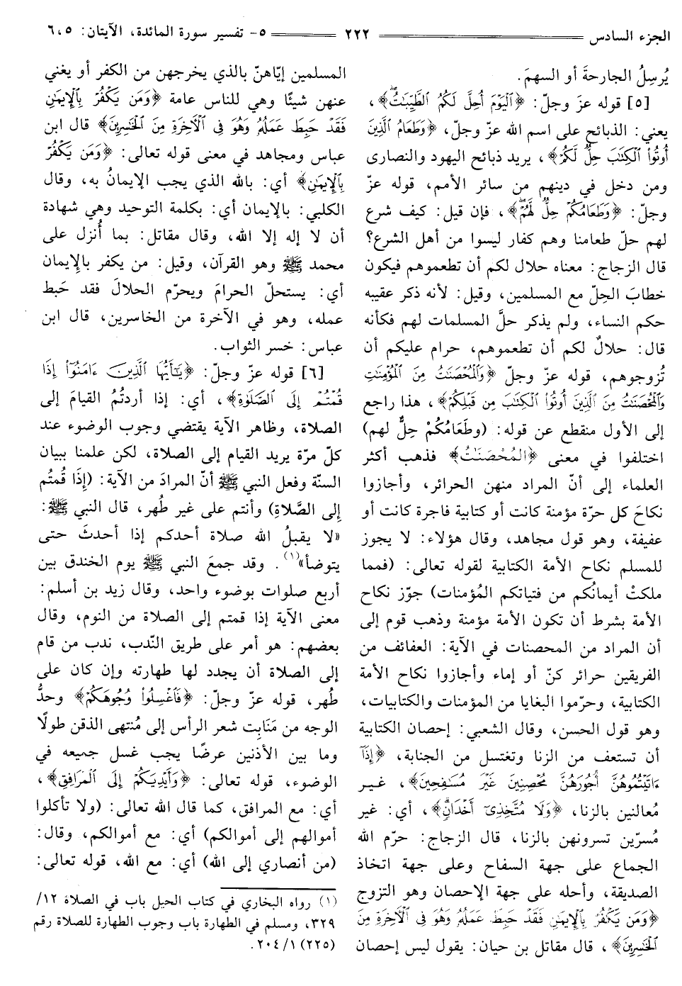 [5] قَوْلُهُ عَزَّ وَجَلَّ: {الْيَوْمَ أُحِلَّ لَكُمُ الطَّيِّبَاتُ} [المائدة: 5] يَعْنِي: الذَّبَائِحَ عَلَى اسْمِ اللَّهِ عَزَّ وَجَلَّ، {وَطَعَامُ الَّذِينَ أُوتُوا الْكِتَابَ حِلٌّ لَكُمْ} [المائدة: 5] يُرِيدُ ذَبَائِحَ الْيَهُودِ وَالنَّصَارَى وَمَنْ دَخَلَ فِي دِينِهِمْ مِنْ سَائِرِ الأمم، قَوْلُهُ عَزَّ وَجَلَّ: {وَطَعَامُكُمْ حِلٌّ لَهُمْ} [المائدة: 5] فَإِنْ قِيلَ: كَيْفَ شَرَعَ لَهُمْ حِلُّ طَعَامِنَا وَهُمْ كُفَّارٌ لَيْسُوا مِنْ أَهْلِ الشَّرْعِ؟ قَالَ الزَّجَّاجُ: مَعْنَاهُ حَلَالٌ لَكُمْ أَنْ تُطْعِمُوهُمْ فَيَكُونُ خِطَابُ الحِل مَعَ الْمُسْلِمِينَ، وَقِيلَ: لِأَنَّهُ ذَكَرَ عُقَيْبَهُ حُكْمَ النِّسَاءِ، وَلَمْ يَذْكُرْ حِلَّ الْمُسْلِمَاتِ لَهُمْ فَكَأَنَّهُ قَالَ: حَلَالٌ لَكُمْ أَنْ تُطْعِمُوهُمْ، حَرَامٌ عَلَيْكُمْ أَنْ تُزَوِّجُوهُمْ، قَوْلُهُ عَزَّ وَجَلَّ {وَالْمُحْصَنَاتُ مِنَ الْمُؤْمِنَاتِ وَالْمُحْصَنَاتُ مِنَ الَّذِينَ أُوتُوا الْكِتَابَ مِنْ قَبْلِكُمْ} [الْمَائِدَةِ: 5] هَذَا رَاجَعٌ إِلَى الْأَوَّلِ مُنْقَطِعٌ عَنْ قَوْلِهِ: {وَطَعَامُكُمْ حِلٌّ لَهُمْ} [المائدة: 5] اخْتَلَفُوا فِي مَعْنَى الْمُحْصَنَاتِ فَذَهَبَ أَكْثَرُ الْعُلَمَاءِ إِلَى أَنَّ الْمُرَادَ مِنْهُنَّ الْحَرَائِرُ، وَأَجَازُوا نِكَاحَ كُلِّ حُرَّةٍ مُؤْمِنَةً كَانَتْ أَوْ كِتَابِيَّةً فَاجِرَةً كَانَتْ أَوْ عَفِيفَةً، وَهُوَ قَوْلُ مُجَاهِدٍ، وَقَالَ هَؤُلَاءِ: لَا يَجُوزُ لِلْمُسْلِمِ نِكَاحُ الْأَمَةِ الْكِتَابِيَّةِ لقوله تعالى: {مَا مَلَكَتْ أَيْمَانُكُمْ مِنْ فَتَيَاتِكُمُ الْمُؤْمِنَاتِ} [النِّسَاءِ: 25] جَوَّزَ نِكَاحَ الْأَمَةِ بِشَرْطِ أن تكون الأمة مؤمنة وَذَهَبَ قَوْمٌ إِلَى أَنَّ الْمُرَادَ مِنَ الْمُحْصَنَاتِ فِي الْآيَةِ: الْعَفَائِفُ مِنَ الْفَرِيقَيْنِ حَرَائِرَ كُنَّ أَوْ إِمَاءً وَأَجَازُوا نِكَاحَ الْأَمَةِ الْكِتَابِيَّةِ، وَحَرَّمُوا الْبَغَايَا مِنَ الْمُؤْمِنَاتِ وَالْكِتَابِيَّاتِ، وَهُوَ قَوْلُ الْحَسَنِ، وَقَالَ الشَّعْبِيُّ: إِحْصَانُ الْكِتَابِيَّةِ أَنْ تَسْتَعِفَّ مِنَ الزِّنَا وَتَغْتَسِلَ مِنَ الْجَنَابَةِ، {إِذَا آتَيْتُمُوهُنَّ أُجُورَهُنَّ مُحْصِنِينَ غَيْرَ مُسَافِحِينَ} [المائدة: 5] غَيْرَ مُعَالِنِينَ بِالزِّنَا، {وَلَا مُتَّخِذِي أَخْدَانٍ} [المائدة: 5] أي: غير مسرّين تسرونهن بِالزِّنَا، قَالَ الزَّجَّاجُ: حَرَّمَ اللَّهُ الْجِمَاعَ عَلَى جِهَةِ السِّفَاحِ وَعَلَى جِهَةِ اتِّخَاذِ الصَّدِيقَةِ، وَأَحَلُّهُ عَلَى جِهَةِ الْإِحْصَانِ وَهُوَ التَّزَوُّجُ {وَمَنْ يَكْفُرْ بِالْإِيمَانِ فَقَدْ حَبِطَ عَمَلُهُ وَهُوَ فِي الْآخِرَةِ مِنَ الْخَاسِرِينَ} [المائدة: 5] قَالَ مُقَاتِلُ بْنُ حَيَّانَ: يَقُولُ لَيْسَ إِحْصَانُ الْمُسْلِمِينَ إِيَّاهُنَّ بِالَّذِي يُخْرِجُهُنَّ مِنَ الْكُفْرِ أَوْ يُغْنِي عَنْهُنَّ شَيْئًا وَهِيَ لِلنَّاسِ عَامَّةً {وَمَنْ يَكْفُرْ بِالْإِيمَانِ فَقَدْ حَبِطَ عَمَلُهُ وَهُوَ فِي الْآخِرَةِ مِنَ الْخَاسِرِينَ} [المائدة: 5] قَالَ ابْنُ عَبَّاسٍ وَمُجَاهِدٌ فِي مَعْنَى قَوْلِهِ تَعَالَى: {وَمَنْ يَكْفُرْ بِالْإِيمَانِ} [المائدة: 5] أَيْ: بِاللَّهِ الَّذِي يَجِبُ الْإِيمَانُ بِهِ، وَقَالَ الْكَلْبِيُّ: بِالْإِيمَانِ أَيْ: بِكَلِمَةِ التَّوْحِيدِ وَهِيَ شَهَادَةُ أَنْ لَا إِلَهَ إِلَّا اللَّهُ، وَقَالَ مُقَاتِلٌ: بِمَا أُنزل عَلَى مُحَمَّدٍ صَلَّى اللَّهُ عَلَيْهِ وَسَلَّمَ وَهُوَ الْقُرْآنُ، وَقِيلَ: مَنْ يَكْفُرْ بِالْإِيمَانِ أَيْ: يَسْتَحِلُّ الْحَرَامَ وَيُحَرِّمُ الْحَلَالَ فَقَدْ حَبِطَ عَمَلُهُ، وَهُوَ فِي الْآخِرَةِ مِنَ الْخَاسِرِينَ، قَالَ ابْنُ عباس: خسر الثواب.