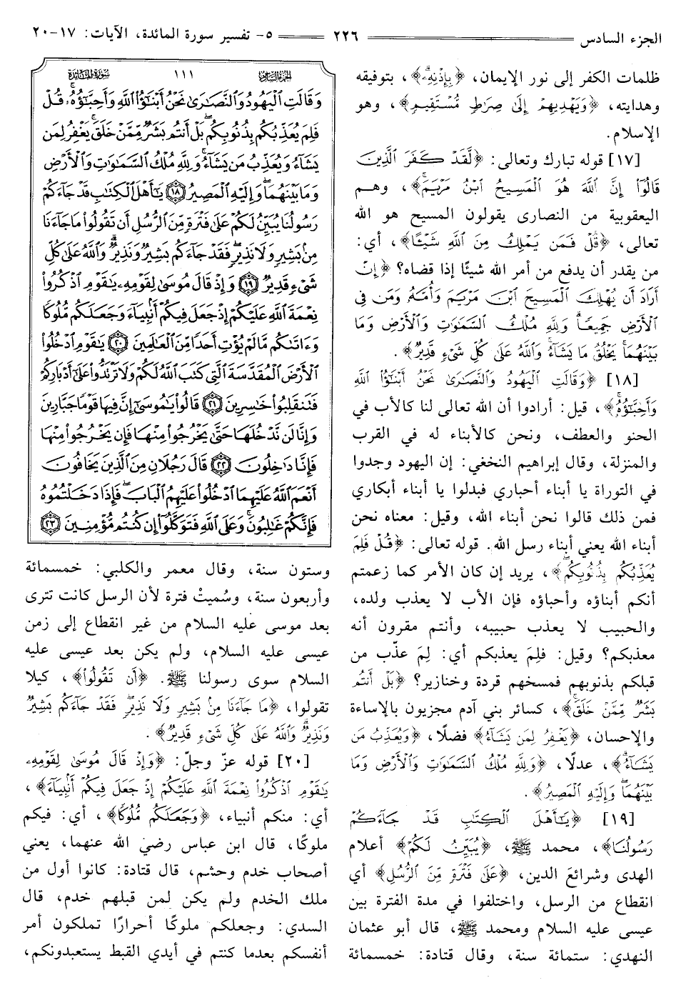 [17] قوله تبارك وتعالى: {لَقَدْ كَفَرَ الَّذِينَ قَالُوا إِنَّ اللَّهَ هُوَ الْمَسِيحُ ابْنُ مَرْيَمَ} [المائدة: 17] وَهُمُ الْيَعْقُوبِيَّةُ مِنَ النَّصَارَى يَقُولُونَ الْمَسِيحُ هُوَ اللَّهُ تَعَالَى، {قُلْ فَمَنْ يَمْلِكُ مِنَ اللَّهِ شَيْئًا} [المائدة: 17] أَيْ: مَنْ يَقْدِرُ أَنْ يَدْفَعَ مِنْ أَمْرِ اللَّهِ شَيْئًا إِذَا قَضَاهُ؟ {إِنْ أَرَادَ أَنْ يُهْلِكَ الْمَسِيحَ ابْنَ مَرْيَمَ وَأُمَّهُ وَمَنْ فِي الْأَرْضِ جَمِيعًا وَلِلَّهِ مُلْكُ السَّمَاوَاتِ وَالْأَرْضِ وَمَا بَيْنَهُمَا يخْلُقُ مَا يَشَاءُ وَاللَّهُ عَلَى كُلِّ شَيْءٍ قَدِيرٌ} [المائدة: 17]