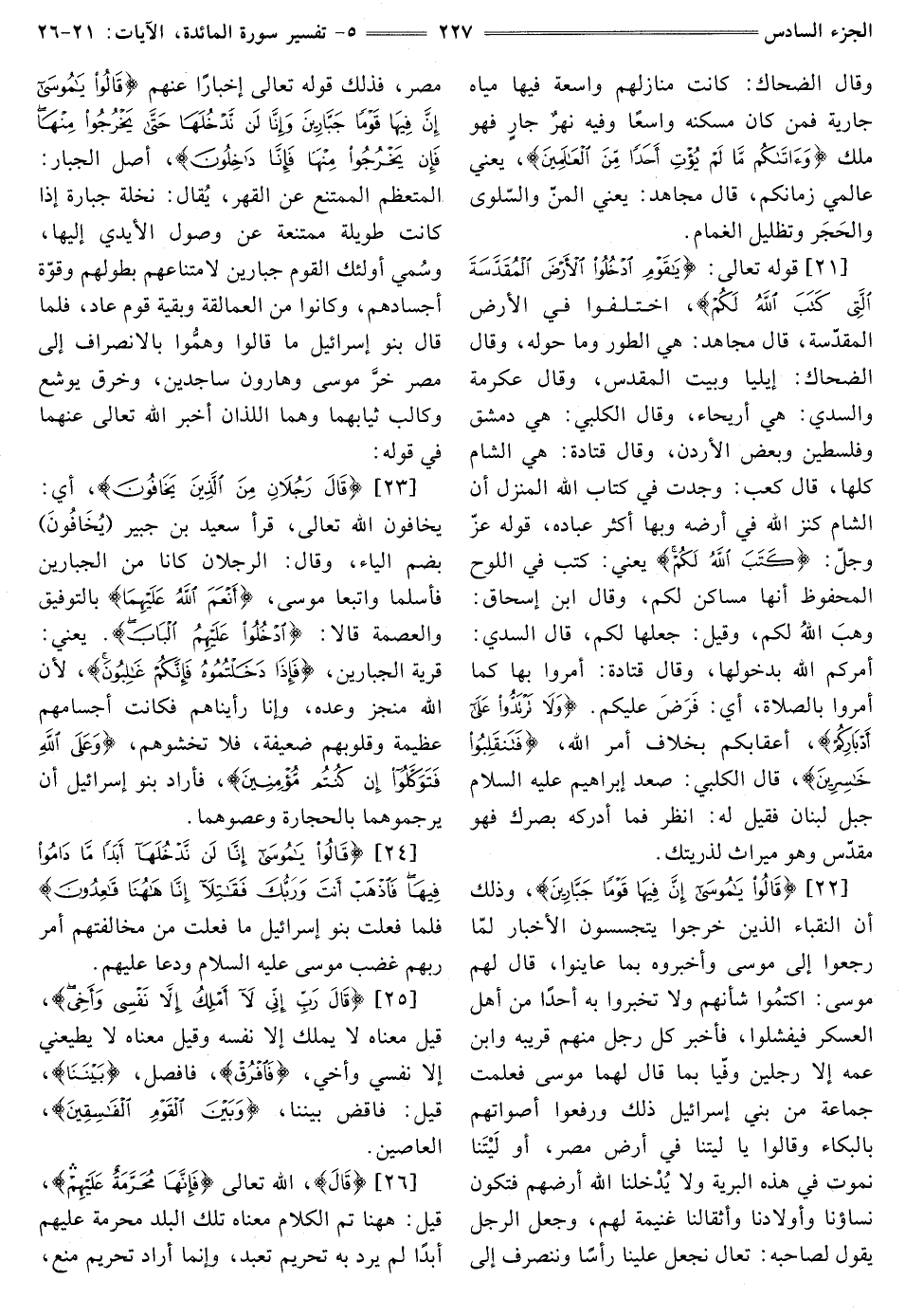 [21] قَوْلُهُ تَعَالَى: {يَا قَوْمِ ادْخُلُوا الْأَرْضَ الْمُقَدَّسَةَ الَّتِي كَتَبَ اللَّهُ لَكُمْ} [المائدة: 21] اخْتَلَفُوا فِي الْأَرْضِ الْمُقَدَّسَةِ، قَالَ مُجَاهِدٌ: هِيَ الطُّورُ وَمَا حَوْلَهُ، وَقَالَ الضَّحَّاكُ: إِيلِيَّا وَبَيْتُ الْمَقْدِسِ، وَقَالَ عِكْرِمَةُ وَالسُّدِّيُّ: هِيَ أَرْيَحَاءُ، وَقَالَ الْكَلْبِيُّ: هِيَ دِمَشْقُ وَفِلَسْطِينُ وَبَعْضُ الْأُرْدُنِّ، وَقَالَ قَتَادَةُ: هِيَ الشَّامُ كُلُّهَا، قَالَ كَعْبٌ: وَجَدْتُ فِي كِتَابِ اللَّهِ الْمُنَزَّلِ أَنَّ الشَّامَ كَنْزُ اللَّهِ فِي أَرْضِهِ وَبِهَا أَكْثَرُ عِبَادِهِ، قَوْلُهُ عَزَّ وجل: {كَتَبَ اللَّهُ لَكُمْ} [المائدة: 21] يَعْنِي: كَتَبَ فِي اللَّوْحِ الْمَحْفُوظِ أَنَّهَا مَسَاكِنُ لَكُمْ، وَقَالَ ابْنُ إِسْحَاقَ: وَهَبَ اللَّهُ لَكُمْ، وَقِيلَ: جعلها لكم، قال السُّدِّيُّ: أَمَرَكُمُ اللَّهُ بِدُخُولِهَا، وَقَالَ قَتَادَةُ: أُمِرُوا بِهَا كَمَا أُمِرُوا بِالصَّلَاةِ، أَيْ: فَرَضَ عَلَيْكُمْ. {وَلَا تَرْتَدُّوا عَلَى أَدْبَارِكُمْ} [المائدة: 21] أَعْقَابِكُمْ بِخِلَافِ أَمْرِ اللَّهِ، {فَتَنْقَلِبُوا خَاسِرِينَ} [المائدة: 21] قَالَ الْكَلْبِيُّ: صَعِدَ إِبْرَاهِيمُ عَلَيْهِ السَّلَامُ جَبَلَ لُبْنَانَ فَقِيلَ لَهُ: انْظُرْ فَمَا أَدْرَكَهُ بَصَرُكَ فَهُوَ مُقَدَّسٌ وَهُوَ مِيرَاثٌ لِذُرِّيَّتِكَ.