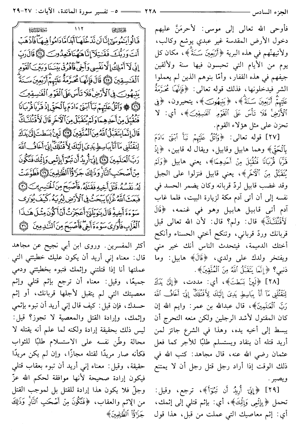 [29] {إِنِّي أُرِيدُ أَنْ تَبُوءَ} [المائدة: 29] ترجع، وقيل تحمل {بِإِثْمِي وَإِثْمِكَ} [المائدة: 29] أَيْ: بِإِثْمِ قَتْلِي إِلَى إِثْمِكَ , أَيْ: إِثْمِ مَعَاصِيكَ الَّتِي عَمِلْتَ مِنْ قَبْلُ، هَذَا قَوْلُ أَكْثَرِ الْمُفَسِّرِينَ. وَرَوَى ابْنُ أَبِي نَجِيحٍ عَنْ مُجَاهِدٍ قَالَ: مَعْنَاهُ إِنِّي أُرِيدُ أَنْ يَكُونَ عَلَيْكَ خَطِيئَتِي الَّتِي عَمِلْتُهَا أَنَا إِذَا قَتَلَتْنِي وَإِثْمُكَ فَتَبُوءُ بِخَطِيئَتِي وَدَمِي جَمِيعًا، وَقِيلَ: مَعْنَاهُ أَنْ تَرْجِعَ بِإِثْمِ قَتْلِي وَإِثْمِ مَعْصِيَتِكَ الَّتِي لَمْ يُتَقَبَّلْ لِأَجْلِهَا قُرْبَانُكَ، أَوْ إِثْمِ حَسَدِكَ، فَإِنْ قِيلَ: كَيْفَ قَالَ إِنِّي أُرِيدُ أَنْ تَبُوءَ بِإِثْمِي وَإِثْمِكَ، وَإِرَادَةُ الْقَتْلِ وَالْمَعْصِيَةِ لَا تَجُوزُ؟ قِيلَ: لَيْسَ ذَلِكَ بِحَقِيقَةِ إِرَادَةٍ وَلَكِنَّهُ لَمَّا عَلِمَ أَنَّهُ يَقْتُلُهُ لَا مَحَالَةَ وَطَّنَ نَفْسَهُ عَلَى الِاسْتِسْلَامِ طَلَبًا لِلثَّوَابِ فَكَأَنَّهُ صَارَ مُرِيدًا لِقَتْلِهِ مَجَازًا، وَإِنْ لَمْ يَكُنْ مُرِيدًا حَقِيقَةً، وَقِيلَ: مَعْنَاهُ إِنِّي أُرِيدُ أَنْ تَبُوءَ بعقاب قتلي فيكون إِرَادَةً صَحِيحَةً لِأَنَّهَا مُوَافِقَةٌ لِحُكْمِ اللَّهِ عَزَّ وَجَلَّ فَلَا يَكُونُ هَذَا إِرَادَةً لِلْقَتْلِ بَلْ لِمُوجِبِ الْقَتْلِ مِنَ الْإِثْمِ وَالْعِقَابِ، {فَتَكُونَ مِنْ أَصْحَابِ النَّارِ وَذَلِكَ جَزَاءُ الظَّالِمِينَ} [المائدة: 29]