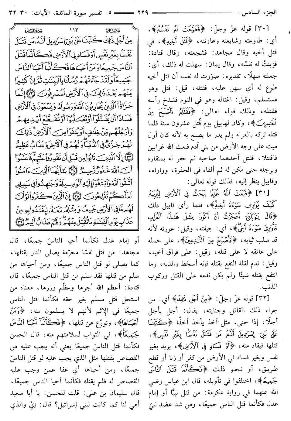 [32] قَوْلُهُ عَزَّ وَجَلَّ: {مِنْ أَجْلِ ذَلِكَ} [المائدة: 32] أَيْ: مِنْ جَرَّاءِ ذَلِكَ الْقَاتِلِ وَجِنَايَتِهِ، يُقَالُ: أَجَلَ يَأْجَلُ أَجَلًا، إِذَا جَنَى، مِثْلُ أَخَذَ يَأْخُذُ أَخْذًا {كَتَبْنَا عَلَى بَنِي إِسْرَائِيلَ أَنَّهُ مَنْ قَتَلَ نَفْسًا بِغَيْرِ نَفْسٍ} [المائدة: 32] قَتَلَهَا فَيُقَادُ مِنْهُ، {أَوْ فَسَادٍ فِي الْأَرْضِ} [المائدة: 32] يُرِيدُ بِغَيْرِ نَفْسٍ وَبِغَيْرِ فَسَادٍ فِي الْأَرْضِ مِنْ كُفْرٍ أَوْ زِنًا أَوْ قَطْعِ طَرِيقٍ، أَوْ نَحْوِ ذَلِكَ {فَكَأَنَّمَا قَتَلَ النَّاسَ جَمِيعًا} [المائدة: 32] اختلفوا في تأويله، قَالَ ابْنُ عَبَّاسٍ رَضِيَ اللَّهُ عَنْهُمَا فِي رِوَايَةِ عِكْرِمَةَ: مَنْ قتل نبيا أو إمام عدل فَكَأَنَّمَا قَتَلَ النَّاسَ جَمِيعًا، وَمَنْ شَدَّ عَضُدَ نَبِيٍّ أَوْ إِمَامٍ عَدْلٍ فَكَأَنَّمَا أَحْيَا النَّاسَ جَمِيعًا، قَالَ مُجَاهِدٌ: مَنْ قَتَلَ نَفْسًا مُحَرَّمَةً يَصْلَى النَّارَ بِقَتْلِهَا، كَمَا يصلى لَوْ قَتَلَ النَّاسَ جَمِيعًا، وَمَنْ أَحْيَاهَا مَنْ سَلِمَ مِنْ قَتْلِهَا فَقَدْ سَلِمَ مِنْ قَتْلِ النَّاسِ جميعا، قال قتادة: أعظم اللَّهُ أَجْرَهَا وَعَظَّمَ وِزْرَهَا، مَعْنَاهُ مَنِ اسْتَحَلَّ قَتْلَ مُسْلِمٍ بِغَيْرِ حقه فَكَأَنَّمَا قَتَلَ النَّاسَ جَمِيعًا فِي الْإِثْمِ لِأَنَّهُمْ لَا يَسْلَمُونَ مِنْهُ {وَمَنْ أَحْيَاهَا} [المائدة: 32] وَتَوَرَّعَ عَنْ قَتْلِهَا، {فَكَأَنَّمَا أَحْيَا النَّاسَ جَمِيعًا} [المائدة: 32] فِي الثَّوَابِ لِسَلَامَتِهِمْ مِنْهُ، قَالَ الْحَسَنُ: فَكَأَنَّمَا قَتَلَ النَّاسَ جَمِيعًا يَعْنِي أَنَّهُ يَجِبُ عَلَيْهِ مِنَ الْقِصَاصِ بِقَتْلِهَا مِثْلُ الَّذِي يَجِبُ عَلَيْهِ لَوْ قَتَلَ النَّاسَ جَمِيعًا، ومن أحياها أي عفا عَمَّنْ وَجَبَ عَلَيْهِ الْقِصَاصُ لَهُ فَلَمْ يَقْتُلْهُ فَكَأَنَّمَا أَحْيَا النَّاسَ جَمِيعًا، قَالَ سُلَيْمَانُ بْنُ عَلِيٍّ: قُلْتُ لِلْحَسَنِ: يَا أَبَا سَعِيدٍ أهي لَنَا كَمَا كَانَتْ لِبَنِي إِسْرَائِيلَ؟ قَالَ: إِيْ وَالَّذِي