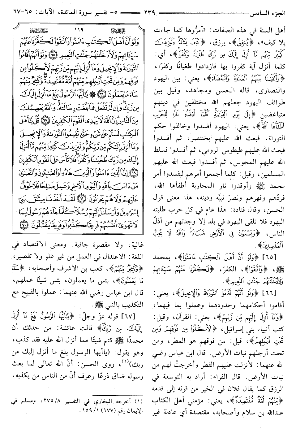 [66] {وَلَوْ أَنَّهُمْ أَقَامُوا التَّوْرَاةَ وَالْإِنْجِيلَ} [المائدة: 66] يَعْنِي: أَقَامُوا أَحْكَامَهُمَا وَحُدُودَهُمَا وَعَمِلُوا بِمَا فِيهِمَا، {وَمَا أُنْزِلَ إِلَيْهِمْ مِنْ رَبِّهِمْ} [المائدة: 66] يَعْنِي: الْقُرْآنَ، وَقِيلَ: كُتُبُ أَنْبِيَاءِ بَنِي إِسْرَائِيلَ، {لَأَكَلُوا مِنْ فَوْقِهِمْ وَمِنْ تَحْتِ أَرْجُلِهِمْ} [المائدة: 66] قِيلَ: مِنْ فَوْقِهِمْ هُوَ الْمَطَرُ، وَمِنْ تَحْتِ أَرْجُلِهِمْ نَبَاتُ الْأَرْضِ. قَالَ ابْنُ عَبَّاسٍ رَضِيَ اللَّهُ عَنْهُمَا: لَأَنْزَلْتُ عَلَيْهِمُ الْقَطْرَ وَأَخْرَجْتُ لهم من نبات الأرض. قال الْفِرَاءُ: أَرَادَ بِهِ التَّوْسِعَةَ فِي الرِّزْقِ كَمَا يُقَالُ فُلَانٌ فِي الْخَيْرِ مِنْ قَرْنِهِ إِلَى قَدَمِهِ {مِنْهُمْ أُمَّةٌ مُقْتَصِدَةٌ} [المائدة: 66] يَعْنِي: مُؤْمِنِي أَهْلِ الْكِتَابِ عَبْدَ اللَّهِ بْنَ سَلَامٍ وَأَصْحَابَهُ، مُقْتَصِدَةٌ أَيْ عَادِلَةٌ غَيْرُ غَالِيَةٍ، وَلَا مُقَصِّرَةٍ جَافِيَةٍ. وَمَعْنَى الِاقْتِصَادِ فِي اللُّغَةِ: الِاعْتِدَالُ فِي الْعَمَلِ مِنْ غَيْرِ غُلُوٍّ وَلَا تَقْصِيرٍ، {وَكَثِيرٌ مِنْهُمْ} [المائدة: 66] كَعْبُ بْنُ الْأَشْرَفِ وَأَصْحَابُهُ، {سَاءَ مَا يَعْمَلُونَ} [المائدة: 66] بئس مَا يَعْمَلُونَ، بِئْسَ شَيْئًا عَمَلُهُمْ، قَالَ ابْنُ عَبَّاسٍ رَضِيَ اللَّهُ عنهما: عملوا بالقبيح مَعَ التَّكْذِيبِ بِالنَّبِيِّ صَلَّى اللَّهُ عَلَيْهِ وَسَلَّمَ.