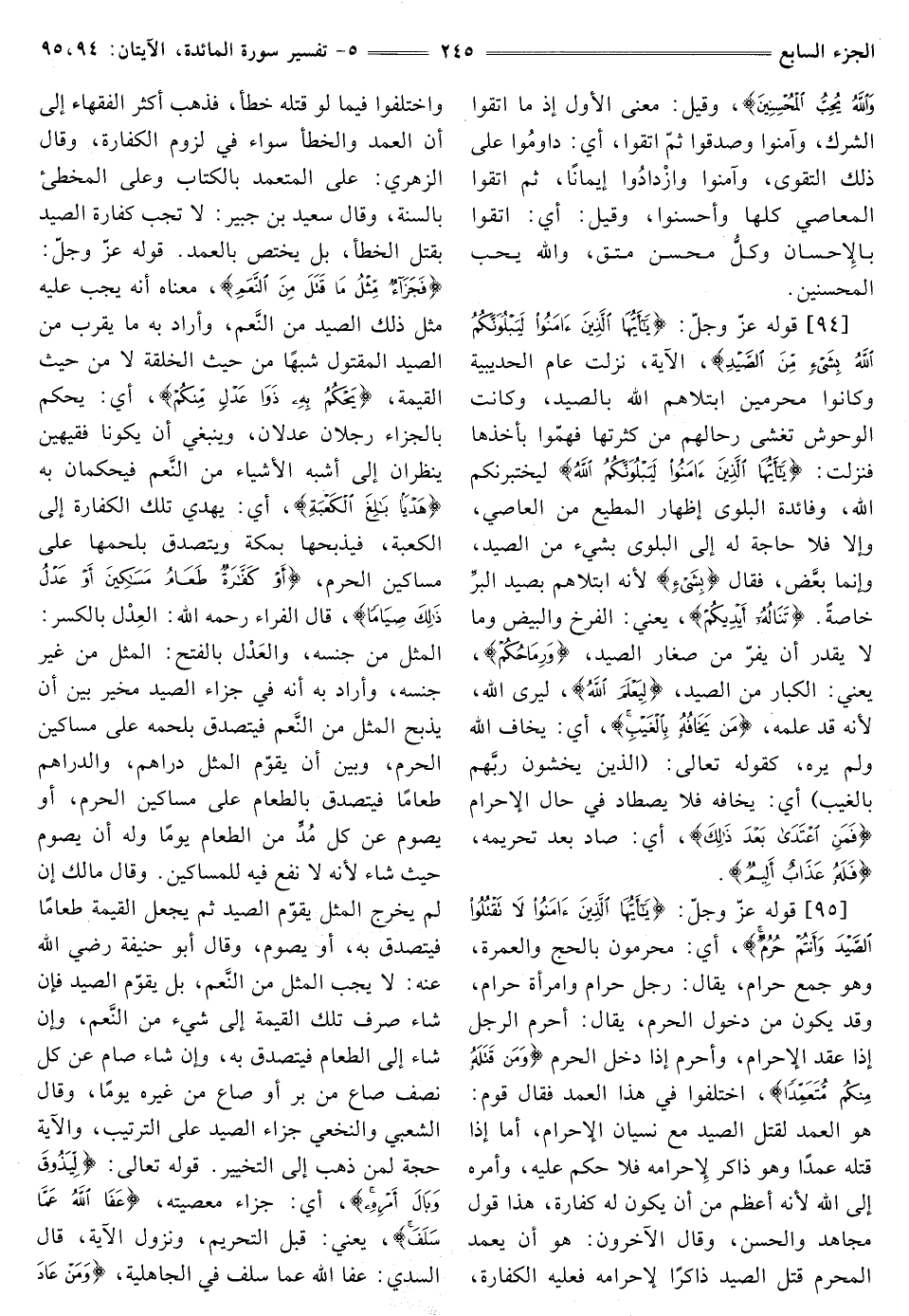 [95] قَوْلُهُ عَزَّ وَجَلَّ: {يَا أَيُّهَا الَّذِينَ آمَنُوا لَا تَقْتُلُوا الصَّيْدَ وَأَنْتُمْ حُرُمٌ} [المائدة: 95] أَيْ: مُحْرِمُونَ بِالْحَجِّ وَالْعُمْرَةِ، وَهُوَ جَمْعُ حَرَامٍ، يُقَالُ: رَجُلٌ حَرَامٌ وَامْرَأَةٌ حَرَامٌ، وَقَدْ يَكُونُ مِنْ دُخُولِ الْحَرَمِ، يُقَالُ: أَحْرَمَ الرَّجُلُ إِذَا عَقَدَ الْإِحْرَامَ، وَأَحْرَمَ إِذَا دخل الحرم {وَمَنْ قَتَلَهُ مِنْكُمْ مُتَعَمِّدًا} [المائدة: 95] اخْتَلَفُوا فِي هَذَا الْعَمْدِ فَقَالَ قوم: هو العمد لقتل الصَّيْدِ مَعَ نِسْيَانِ الْإِحْرَامِ، أَمَّا إِذَا قَتَلَهُ عَمْدًا وَهُوَ ذَاكِرٌ لِإِحْرَامِهِ فَلَا حُكْمَ عَلَيْهِ، وَأَمْرُهُ إِلَى اللَّهِ لِأَنَّهُ أَعْظَمُ مِنْ أن يكون له كفارة، هذا قول مجاهد والحسن، وقال الآخرون: هُوَ أَنْ يَعْمِدَ الْمُحْرِمُ قَتْلَ الصَّيْدِ ذَاكِرًا لِإِحْرَامِهِ فَعَلَيْهِ الْكَفَّارَةُ، وَاخْتَلَفُوا فِيمَا لَوْ قَتَلَهُ خَطَأً، فَذَهَبَ أَكْثَرُ الْفُقَهَاءِ إِلَى أَنَّ الْعَمْدَ وَالْخَطَأَ سَوَاءٌ فِي لُزُومِ الكفارة، وقال الزُّهْرِيُّ: عَلَى الْمُتَعَمِّدِ بِالْكِتَابِ وَعَلَى الْمُخْطِئِ بِالسُّنَّةِ، وَقَالَ سَعِيدُ بْنُ جُبَيْرٍ: لَا تَجِبُ كَفَّارَةُ الصَّيْدِ بِقَتْلِ الْخَطَأِ، بَلْ يَخْتَصُّ بِالْعَمْدِ. قَوْلُهُ عَزَّ وَجَلَّ: {فَجَزَاءٌ مِثْلُ مَا قَتَلَ مِنَ النَّعَمِ} [المائدة: 95] مَعْنَاهُ أَنَّهُ يَجِبُ عَلَيْهِ مِثْلُ ذَلِكَ الصَّيْدِ مِنَ النَّعَمِ، وَأَرَادَ بِهِ مَا يَقْرُبُ مِنَ الصَّيْدِ الْمَقْتُولِ شَبَهًا مِنْ حَيْثُ الْخِلْقَةِ لَا مِنْ حَيْثُ الْقِيمَةِ، {يَحْكُمُ بِهِ ذَوَا عَدْلٍ مِنْكُمْ} [المائدة: 95] أَيْ: يَحْكُمُ بِالْجَزَاءِ رَجُلَانِ عَدْلَانِ، وَيَنْبَغِي أَنْ يَكُونَا فَقِيهَيْنِ يَنْظُرَانِ إِلَى أَشْبَهِ الْأَشْيَاءِ مِنَ النَّعَمِ فيحكمان به {هَدْيًا بَالِغَ الْكَعْبَةِ} [المائدة: 95] أَيْ: يُهْدِي تِلْكَ الْكَفَّارَةَ إِلَى الْكَعْبَةِ، فَيَذْبَحُهَا بِمَكَّةَ وَيَتَصَدَّقُ بِلَحْمِهَا عَلَى مَسَاكِينِ الْحَرَمِ، {أَوْ كَفَّارَةٌ طَعَامُ مَسَاكِينَ أَوْ عَدْلُ ذَلِكَ صِيَامًا} [المائدة: 95] قَالَ الْفَرَّاءُ رَحِمَهُ اللَّهُ: العِدْل بِالْكَسْرِ: الْمِثْلُ مِنْ جِنْسِهِ، والعَدْل بِالْفَتْحِ: الْمِثْلُ مِنْ غَيْرِ جِنْسِهِ، وَأَرَادَ بِهِ أَنَّهُ فِي جَزَاءِ الصَّيْدِ مُخَيَّرٌ بَيْنَ أَنْ يَذْبَحَ الْمِثْلَ مِنَ النَّعَمِ فَيَتَصَدَّقَ بِلَحْمِهِ عَلَى مَسَاكِينِ الْحَرَمِ، وَبَيْنَ أَنْ يُقَوِّمَ الْمِثْلَ دَرَاهِمَ، وَالدَّرَاهِمَ طَعَامًا فَيَتَصَدَّقَ بِالطَّعَامِ عَلَى مَسَاكِينِ الْحَرَمِ، أَوْ يَصُومَ عَنْ كُلِّ مُدٍّ مِنَ الطَّعَامِ يَوْمًا وَلَهُ أَنْ يَصُومَ حَيْثُ شَاءَ لِأَنَّهُ لَا نَفْعَ فِيهِ لِلْمَسَاكِينِ. وَقَالَ مَالِكٌ إِنْ لَمْ يُخْرِجِ الْمِثْلَ يُقَوِّمُ الصَّيْدَ ثُمَّ يَجْعَلُ الْقِيمَةَ طَعَامًا فَيَتَصَدَّقُ بِهِ، أَوْ يَصُومُ، وَقَالَ أَبُو حَنِيفَةَ رَضِيَ اللَّهُ عَنْهُ: لَا يَجِبُ الْمِثْلُ مِنَ النَّعم بَلْ يُقَوِّمُ الصَّيْدَ، فَإِنْ شَاءَ صَرَفَ تِلْكَ الْقِيمَةَ إِلَى شَيْءٍ مِنَ النَّعم، وَإِنْ شَاءَ إِلَى الطَّعَامِ فَيَتَصَدَّقُ بِهِ، وَإِنْ شَاءَ صَامَ عَنْ كُلِّ نِصْفِ صَاعٍ مِنْ بُرٍّ أَوْ صَاعٍ مِنْ غَيْرِهِ يَوْمًا، وَقَالَ الشَّعْبِيُّ وَالنَّخَعِيُّ جَزَاءُ الصَّيْدِ عَلَى التَّرْتِيبِ، وَالْآيَةُ حُجَّةٌ لِمَنْ ذَهَبَ إِلَى التَّخْيِيرِ. قَوْلُهُ تَعَالَى: {لِيَذُوقَ وَبَالَ أَمْرِهِ} [المائدة: 95] أَيْ: جَزَاءَ مَعْصِيَتِهِ، {عَفَا اللَّهُ عَمَّا سَلَفَ} [المائدة: 95] يَعْنِي: قَبْلَ التَّحْرِيمِ وَنُزُولِ الْآيَةِ، قَالَ السُّدِّيُّ: عَفَا اللَّهُ عَمَّا سَلَفَ فِي الْجَاهِلِيَّةِ،