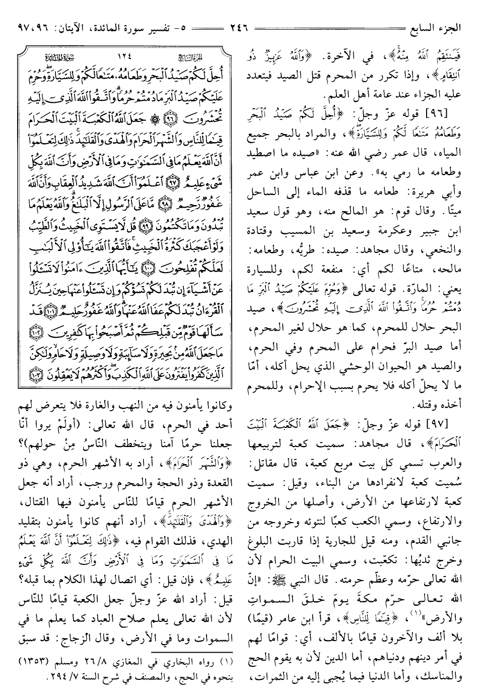 [96] قَوْلُهُ عَزَّ وَجَلَّ: {أُحِلَّ لَكُمْ صَيْدُ الْبَحْرِ وَطَعَامُهُ مَتَاعًا لَكُمْ وَلِلسَّيَّارَةِ} [المائدة: 96] وَالْمُرَادُ بِالْبَحْرِ جَمِيعُ الْمِيَاهِ، قَالَ عُمَرُ رَضِيَ اللَّهُ عَنْهُ: " صَيْدُهُ مَا اصْطِيدَ وَطَعَامُهُ مَا رُمِيَ بِهِ ". وَعَنِ ابْنِ عَبَّاسٍ وَابْنِ عُمَرَ وَأَبِي هُرَيْرَةَ: طَعَامُهُ مَا قَذَفَهُ الْمَاءُ إِلَى السَّاحِلِ مَيْتًا. وَقَالَ قَوْمٌ: هُوَ الْمَالِحُ مِنْهُ، وَهُوَ قَوْلُ سَعِيدِ بْنِ جُبَيْرٍ وَعِكْرِمَةَ وَسَعِيدِ بْنِ الْمُسَيَّبِ وَقَتَادَةَ وَالنَّخَعِيِّ، وَقَالَ مُجَاهِدٌ: صَيْدُهُ: طَرِيُّهُ، وَطَعَامُهُ: مَالِحُهُ، مَتَاعًا لَكُمْ أَيْ: مَنْفَعَةً لَكُمْ، وَلِلسَّيَّارَةِ يَعْنِي: الْمَارَّةَ. قَوْلُهُ تَعَالَى {وَحُرِّمَ عَلَيْكُمْ صَيْدُ الْبَرِّ مَا دُمْتُمْ حُرُمًا وَاتَّقُوا اللَّهَ الَّذِي إِلَيْهِ تُحْشَرُونَ} [المائدة: 96] صَيْدُ الْبَحْرِ حَلَالٌ لِلْمُحْرِمِ، كَمَا هُوَ حَلَالٌ لِغَيْرِ الْمُحْرِمِ، أَمَّا صَيْدُ الْبَرِّ فَحَرَامٌ عَلَى الْمُحْرِمِ وَفِي الْحَرَمِ، وَالصَّيْدُ هُوَ الْحَيَوَانُ الْوَحْشِيُّ الَّذِي يَحِلُّ أَكْلُهُ، أَمَّا مَا لَا يَحِلُّ أَكْلُهُ فَلَا يَحْرُمُ بِسَبَبِ الْإِحْرَامِ، وَلِلْمُحْرِمِ أَخْذُهُ وقتله.