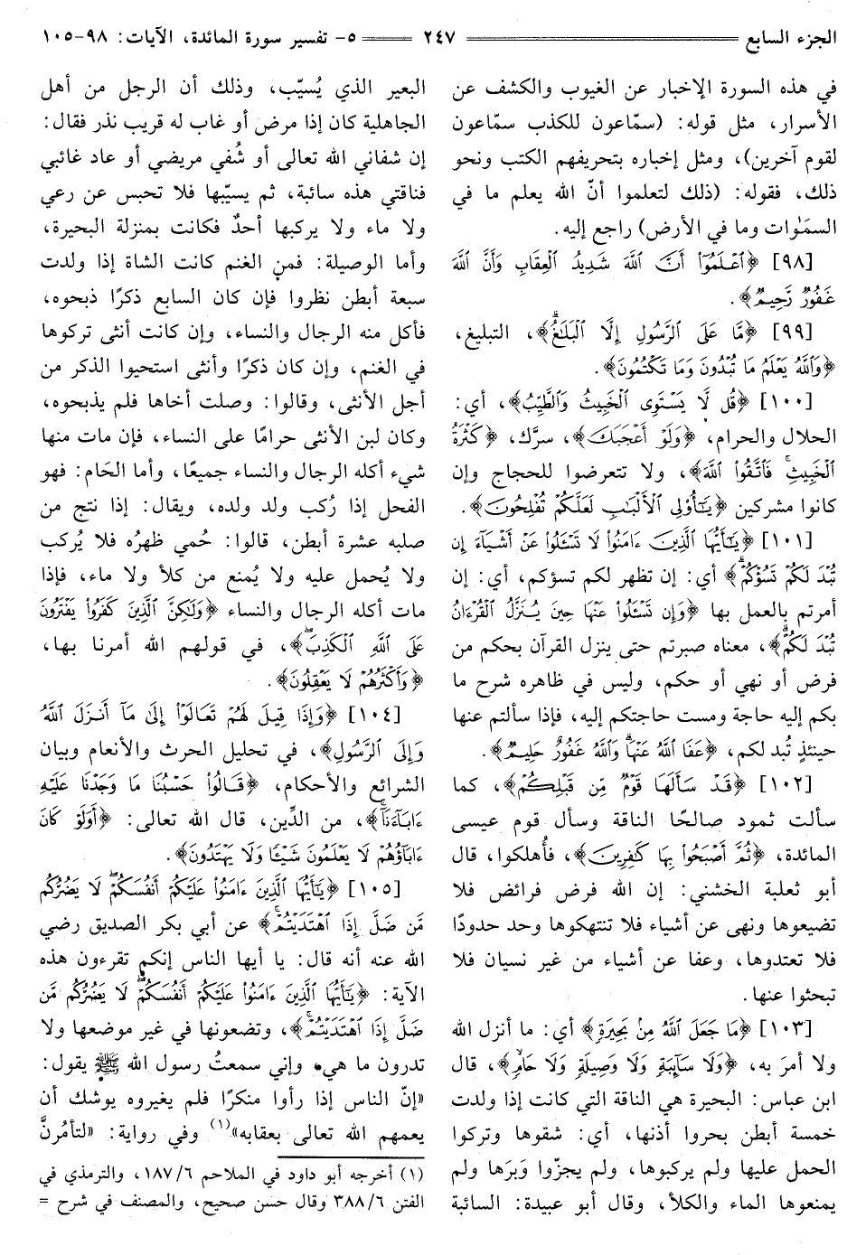 [101] {يَا أَيُّهَا الَّذِينَ آمَنُوا لَا تَسْأَلُوا عَنْ أَشْيَاءَ إِنْ تُبْدَ لَكُمْ تَسُؤْكُمْ} [المائدة: 101] أَيْ: إِنْ تَظْهَرْ لَكُمْ تَسُؤْكُمْ، أَيْ: إِنْ أُمِرْتُمْ بِالْعَمَلِ بِهَا {وَإِنْ تَسْأَلُوا عَنْهَا حِينَ يُنَزَّلُ الْقُرْآنُ تُبْدَ لَكُمْ} [المائدة: 101] مَعْنَاهُ صَبَرْتُمْ حَتَّى يَنْزِلَ الْقُرْآنُ بِحُكْمٍ مِنْ فَرْضٍ أَوْ نَهْيٍ أَوْ حُكْمٍ، وَلَيْسَ فِي ظَاهِرِهِ شَرْحُ مَا بِكُمْ إِلَيْهِ حَاجَةٌ وَمَسَّتْ حَاجَتُكُمْ إِلَيْهِ، فَإِذَا سَأَلْتُمْ عنها حينئذ تُبْدَ لَكُمْ، {عَفَا اللَّهُ عَنْهَا وَاللَّهُ غَفُورٌ حَلِيمٌ} [المائدة: 101]
