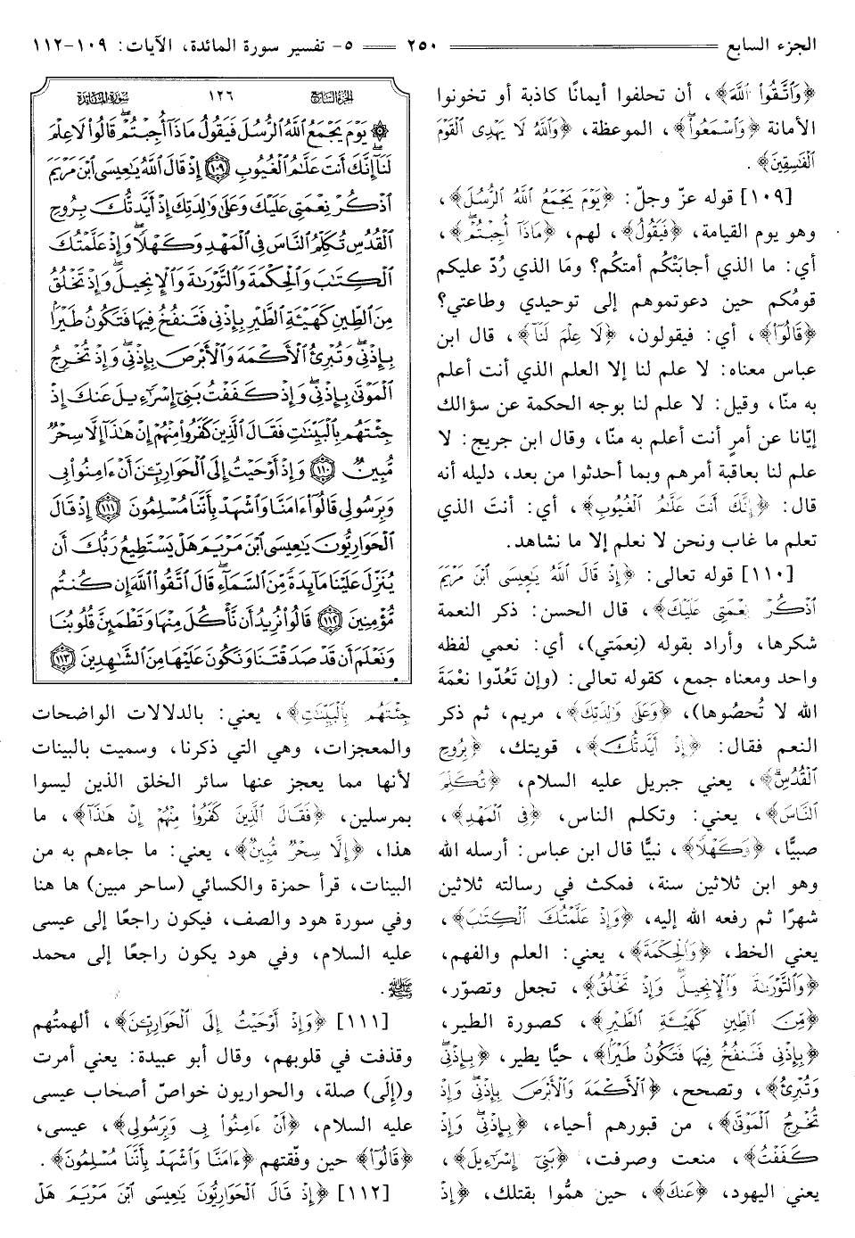 [110] قَوْلُهُ تَعَالَى: {إِذْ قَالَ اللَّهُ يَا عِيسَى ابْنَ مَرْيَمَ اذْكُرْ نِعْمَتِي عَلَيْكَ} [المائدة: 110] قَالَ الْحَسَنُ: ذِكْرُ النِّعْمَةِ شُكْرُهَا، وَأَرَادَ بِقَوْلِهِ (نِعْمَتِي) أَيْ: نِعَمِي، لَفْظُهُ وَاحِدٌ وَمَعْنَاهُ جَمْعٌ، كَقَوْلِهِ تعالى: {وَإِنْ تَعُدُّوا نِعْمَتَ اللَّهِ لا تُحْصُوهَا} [إبراهيم: 34] {وَعَلى وَالِدَتِكَ} [المائدة: 110] مَرْيَمَ، ثُمَّ ذَكَرَ النِّعَمَ فَقَالَ: {إِذْ أَيَّدْتُكَ} [المائدة: 110] قويتك، {بِرُوحِ الْقُدُسِ} [المائدة: 110] يَعْنِي جِبْرِيلَ عَلَيْهِ السَّلَامُ، {تُكَلِّمُ النَّاسَ} [المائدة: 110] يَعْنِي: وَتُكَلِّمُ النَّاسَ، {فِي الْمَهْدِ} [المائدة: 110] صبيا، {وَكَهْلًا} [المائدة: 110] نَبِيًّا، قَالَ ابْنُ عَبَّاسٍ: أَرْسَلَهُ الله وَهُوَ ابْنُ ثَلَاثِينَ سَنَةً، فَمَكَثَ فِي رِسَالَتِهِ ثَلَاثِينَ شَهْرًا ثُمَّ رَفَعَهُ اللَّهُ إِلَيْهِ، {وَإِذْ عَلَّمْتُكَ الْكِتَابَ} [المائدة: 110] يعني الخط، {وَالْحِكْمَةَ} [المائدة: 110] يَعْنِي: الْعِلْمَ وَالْفَهْمَ، {وَالتَّوْرَاةَ وَالْإِنْجِيلَ وَإِذْ تَخْلُقُ} [المائدة: 110] تَجْعَلُ وَتُصَوِّرُ، {مِنَ الطِّينِ كَهَيْئَةِ الطَّيْرِ} [المائدة: 110] كَصُورَةِ الطَّيْرِ، {بِإِذْنِي فَتَنْفُخُ فِيهَا فَتَكُونُ طَيْرًا} [المائدة: 110] حيًّا يطير، {بِإِذْنِي وَتُبْرِئُ} [المائدة: 110] وَتُصَحِّحُ، {الْأَكْمَهَ وَالْأَبْرَصَ بِإِذْنِي وَإِذْ تُخْرِجُ الْمَوْتَى} [المائدة: 110] مِنْ قُبُورِهِمْ أَحْيَاءً، {بِإِذْنِي وَإِذْ كَفَفْتُ} [المائدة: 110] منعت وصرفت، {بَنِي إِسْرَائِيلَ} [المائدة: 110] يعني اليهود، {عَنْكَ} [المائدة: 110] حِينَ هَمُّوا بِقَتْلِكَ، {إِذْ جِئْتَهُمْ بِالْبَيِّنَاتِ} [المائدة: 110] يعني: بالدلالات الواضحات والمعجزات، وهي التي ذكرنا، وسميت بالبينات لأنها مما يعجز عنها سائر الخلق الذين ليسوا بمرسلين، {فَقَالَ الَّذِينَ كَفَرُوا مِنْهُمْ إِنْ هَذَا} [المائدة: 110] ما هذا، {إِلَّا سِحْرٌ مُبِينٌ} [المائدة: 110] يَعْنِي: مَا جَاءَهُمْ بِهِ مِنَ الْبَيِّنَاتِ، قَرَأَ حَمْزَةُ وَالْكِسَائِيُّ (سَاحِرٌ مُبِينٌ) هَاهُنَا وَفِي سُورَةِ هُودٍ وَالصَّفِّ، فَيَكُونُ رَاجِعًا إِلَى عِيسَى عَلَيْهِ السَّلَامُ، وَفِي هُودٍ يَكُونُ رَاجِعًا إِلَى مُحَمَّدٍ صَلَّى اللَّهُ عَلَيْهِ وَسَلَّمَ.