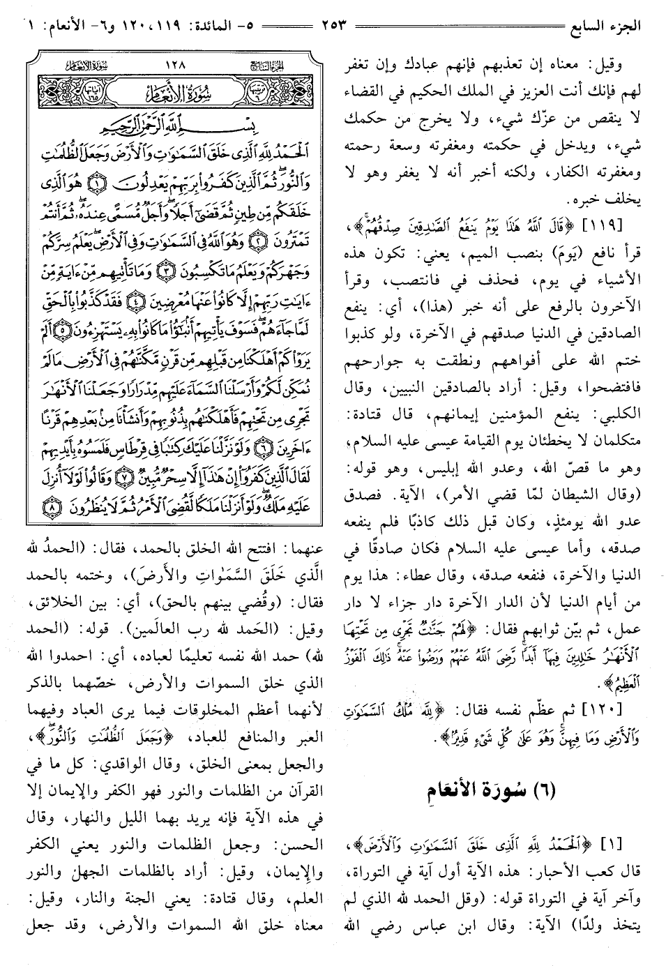 (6) سورة الأنعام بِسْمِ اللَّهِ الرَّحْمَنِ الرَّحِيمِ [1] {الْحَمْدُ لِلَّهِ الَّذِي خَلَقَ السَّمَاوَاتِ وَالْأَرْضَ} [الأنعام: 1] قَالَ كَعْبُ الْأَحْبَارِ: هَذِهِ الْآيَةُ أَوَّلُ آيَةٍ فِي التَّوْرَاةِ، وَآخِرُ آية في التوراة قوله: {وَقُلِ الْحَمْدُ لِلَّهِ الَّذِي لَمْ يَتَّخِذْ وَلَدًا} [الإسراء: 111] الْآيَةَ، وَقَالَ ابْنُ عَبَّاسٍ رَضِيَ اللَّهُ عَنْهُمَا: افْتَتَحَ اللَّهُ الْخَلْقَ بِالْحَمْدِ فَقَالَ: {الْحَمْدُ لِلَّهِ الَّذِي خَلَقَ السَّمَاوَاتِ وَالْأَرْضَ} [الأنعام: 1] وَخَتَمَهُ بِالْحَمْدِ فَقَالَ: {وَقُضِيَ بَيْنَهُمْ بِالْحَقِّ} [الزمر: 75] أَيْ: بَيْنَ الْخَلَائِقِ، وَقِيلَ: {الْحَمْدُ لِلَّهِ رَبِّ الْعَالَمِينَ} [الزُّمَرِ: 75] قَوْلُهُ: (الْحَمْدُ لِلَّهِ) حَمَدَ اللَّهُ نَفْسَهُ تَعْلِيمًا لِعِبَادِهِ، أَيِ: احْمِدُوا اللَّهَ الذي خلق السماوات وَالْأَرْضَ، خَصَّهُمَا بِالذِّكْرِ لِأَنَّهُمَا أَعْظَمُ الْمَخْلُوقَاتِ فِيمَا يَرَى الْعِبَادُ وَفِيهِمَا الْعِبَرُ وَالْمَنَافِعُ لِلْعِبَادِ، {وَجَعَلَ الظُّلُمَاتِ وَالنُّورَ} [الأنعام: 1] والجعل بمعنى الخلق، وقال الْوَاقِدِيُّ: كُلُّ مَا فِي الْقُرْآنِ مِنَ الظُّلُمَاتِ وَالنُّورِ فَهُوَ الْكُفْرُ وَالْإِيمَانُ إِلَّا فِي هَذِهِ الْآيَةِ فَإِنَّهُ يُرِيدُ بِهِمَا اللَّيْلَ وَالنَّهَارَ، وَقَالَ الْحَسَنُ: وَجَعَلَ الظُّلُمَاتِ وَالنُّورَ يَعْنِي الْكُفْرَ وَالْإِيمَانَ، وَقِيلَ: أَرَادَ بالظلمات الجهل والنور الْعِلْمَ، وَقَالَ قَتَادَةُ: يَعْنِي الْجَنَّةَ وَالنَّارَ، وَقِيلَ: مَعْنَاهُ خَلَقَ اللَّهُ السماوات وَالْأَرْضَ، وَقَدْ جَعَلَ
