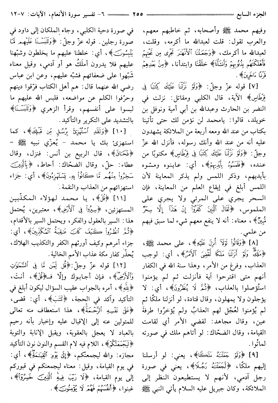 [7] قَوْلُهُ عَزَّ وَجَلَّ: {وَلَوْ نَزَّلْنَا عَلَيْكَ كِتَابًا فِي قِرْطَاسٍ} [الأنعام: 7] الْآيَةَ، قَالَ الْكَلْبِيُّ وَمُقَاتِلٌ: نَزَلَتْ فِي النَّضْرِ بْنِ الْحَارِثِ وَعَبْدِ اللَّهِ بْنِ أَبِي أُمَيَّةَ وَنَوْفَلِ بْنِ خُوَيْلِدٍ، قَالُوا: يَا مُحَمَّدُ لَنْ نُؤْمِنَ لَكَ حَتَّى تَأْتِيَنَا بِكِتَابٍ مِنْ عِنْدِ اللَّهِ وَمَعَهُ أَرْبَعَةٌ مِنَ الْمَلَائِكَةِ يَشْهَدُونَ عَلَيْهِ أَنَّهُ مِنْ عِنْدِ اللَّهِ وَأَنَّكَ رَسُولُهُ، فَأَنْزَلَ اللَّهُ عَزَّ وَجَلَّ: {وَلَوْ نَزَّلْنَا عَلَيْكَ كِتَابًا فِي قِرْطَاسٍ} [الأنعام: 7] مكتوبا من عنده، {فَلَمَسُوهُ بِأَيْدِيهِمْ} [الأنعام: 7] أَيْ: عَايَنُوهُ وَمَسُّوهُ بِأَيْدِيهِمْ، وَذَكَرَ اللَّمْسَ وَلَمْ يَذْكُرِ الْمُعَايَنَةَ لِأَنَّ اللَّمْسَ أَبْلَغُ فِي إِيقَاعِ الْعِلْمِ من المعاينة، فَإِنَّ السِّحْرَ يَجْرِي عَلَى الْمَرْئِيِّ وَلَا يَجْرِي عَلَى الْمَلْمُوسِ، {لَقَالَ الَّذِينَ كَفَرُوا إِنْ هَذَا إِلَّا سِحْرٌ مُبِينٌ} [الأنعام: 7] معناه: أنه لَا يَنْفَعُ مَعَهُمْ شَيْءٌ لِمَا سَبَقَ فِيهِمْ مِنْ عِلْمِي.