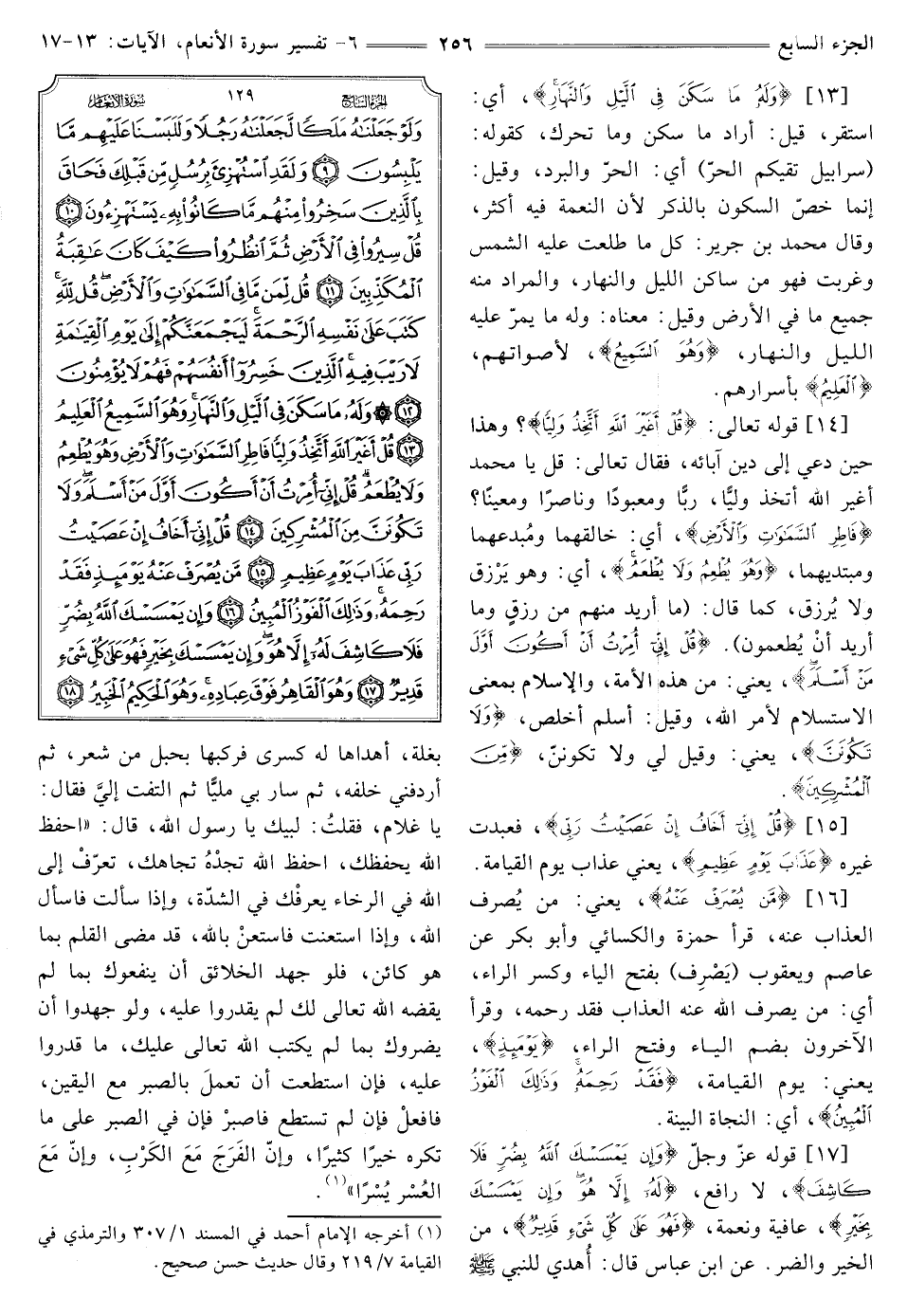 [17] قَوْلُهُ عَزَّ وَجَلَّ: {وَإِنْ يَمْسَسْكَ اللَّهُ بِضُرٍّ فَلَا كَاشِفَ} [الأنعام: 17] لا رافع، {لَهُ إِلَّا هُوَ وَإِنْ يَمْسَسْكَ بِخَيْرٍ} [الأنعام: 17] عَافِيَةٍ وَنِعْمَةٍ، {فَهُوَ عَلَى كُلِّ شَيْءٍ قَدِيرٌ} [الأنعام: 17] من الخير والضر. عَنِ ابْنِ عَبَّاسٍ قَالَ: «أُهْدِيَ لِلنَّبِيِّ صَلَّى اللَّهُ عَلَيْهِ وَسَلَّمَ بَغْلَةٌ، أَهْدَاهَا لَهُ كِسْرَى فَرَكِبَهَا بِحَبْلٍ مِنْ شَعْرٍ، ثُمَّ أَرْدَفَنِي خَلْفَهُ، ثُمَّ سَارَ بِي مَلِيًّا ثُمَّ الْتَفَتَ إليَّ فَقَالَ: يَا غُلَامُ، فَقُلْتُ: لَبَّيْكَ يَا رَسُولَ اللَّهِ، قَالَ: " احْفَظِ اللَّهَ يَحْفَظْكَ، احفظ الله تجده تجاهك، تعرّفْ إِلَى اللَّهِ فِي الرَّخَاءِ يعرفْك فِي الشِّدَّةِ، وَإِذَا سَأَلَتْ فَاسْأَلِ اللَّهَ، وَإِذَا اسْتَعَنْتَ فَاسْتَعِنْ بالله، قد مَضَى الْقَلَمُ بِمَا هُوَ كَائِنٌ، فَلَوْ جَهِدَ الْخَلَائِقُ أَنْ يَنْفَعُوكَ بِمَا لَمْ يَقْضِهِ اللَّهُ تَعَالَى لَكَ لَمْ يَقْدِرُوا عَلَيْهِ، وَلَوْ جَهِدُوا أَنْ يَضُرُّوكَ بِمَا لَمْ يَكْتُبِ اللَّهُ تَعَالَى عَلَيْكَ، مَا قَدِرُوا عَلَيْهِ، فَإِنِ اسْتَطَعْتَ أَنْ تَعْمَلَ بِالصَّبْرِ مَعَ الْيَقِينِ فَافْعَلْ، فَإِنْ لَمْ تَسْتَطِعْ فَاصْبِرْ فَإِنَّ فِي الصَّبْرِ عَلَى مَا تَكْرَهُ خيرا كثيرا، وإن الفرج مع الكرب، وإن مع العسر يسرا» (¬1) .