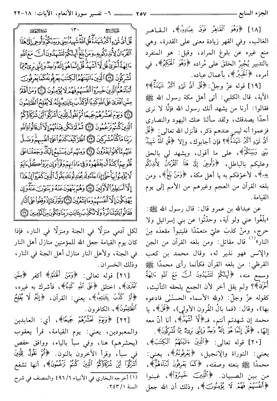 [22] ، {وَيَوْمَ نَحْشُرُهُمْ جَمِيعًا} [الأنعام: 22] أَيِ: الْعَابِدِينَ وَالْمَعْبُودِينَ، يَعْنِي: يَوْمَ القيامة، قرأ يعقوب (يحشرهم) هنا، وَفِي سَبَأٍ بِالْيَاءِ، وَوَافَقَ حَفْصٌ فِي سَبَأٍ، وَقَرَأَ الْآخَرُونَ بِالنُّونِ. {ثُمَّ نَقُولُ لِلَّذِينَ أَشْرَكُوا أَيْنَ شُرَكَاؤُكُمُ الَّذِينَ كُنْتُمْ تَزْعُمُونَ} [الأنعام: 22] أنها تشفع
