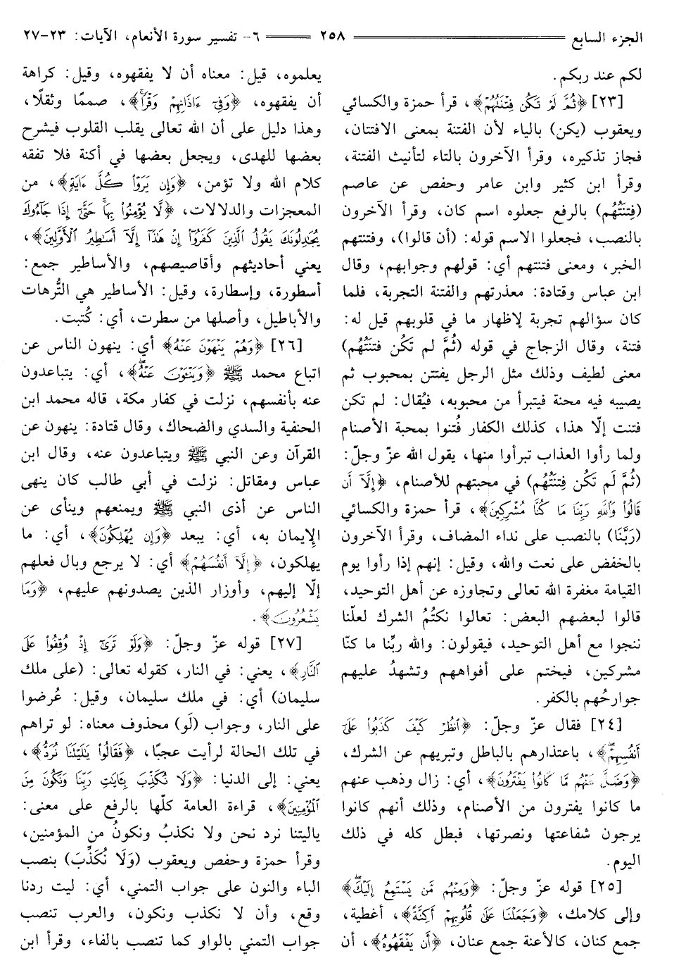 [25] ، قَوْلُهُ عَزَّ وَجَلَّ: {وَمِنْهُمْ مَنْ يَسْتَمِعُ إِلَيْكَ} [الأنعام: 25] وَإِلَى كَلَامِكَ {وَجَعَلْنَا عَلَى قُلُوبِهِمْ أَكِنَّةً} [الأنعام: 25] أَغْطِيَةً، جَمْعُ كِنَانٍ، كَالْأَعِنَّةِ جَمْعُ عنان، {أَنْ يَفْقَهُوهُ} [الأنعام: 25] أَنْ يَعْلَمُوهُ، قِيلَ: مَعْنَاهُ أَنْ لَا يَفْقَهُوهُ، وَقِيلَ: كَرَاهَةَ أَنْ يفقهوه، {وَفِي آذَانِهِمْ وَقْرًا} [الأنعام: 25] صمما وثقلا، وهذا دَلِيلٌ عَلَى أَنَّ اللَّهَ تَعَالَى يُقَلِّبُ الْقُلُوبَ فَيَشْرَحُ بَعْضَهَا لِلْهُدَى، وَيَجْعَلُ بَعْضَهَا فِي أَكِنَّةٍ فَلَا تَفْقَهُ كَلَامَ اللَّهِ وَلَا تُؤْمِنُ، {وَإِنْ يَرَوْا كُلَّ آيَةٍ} [الأنعام: 25] مِنَ الْمُعْجِزَاتِ وَالدِّلَالَاتِ، {لَا يُؤْمِنُوا بِهَا حَتَّى إِذَا جَاءُوكَ يُجَادِلُونَكَ يَقُولُ الَّذِينَ كَفَرُوا إِنْ هَذَا إِلَّا أَسَاطِيرُ الْأَوَّلِينَ} [الأنعام: 25] يَعْنِي أَحَادِيثَهُمْ وَأَقَاصِيصَهُمْ، وَالْأَسَاطِيرُ جَمْعُ: أسطورة، وإسطارة، وقيل: الأساطير هِيَ التُّرَّهَاتُ وَالْأَبَاطِيلُ، وَأَصْلُهَا مِنْ سَطَرْتُ، أَيْ: كَتَبْتُ.