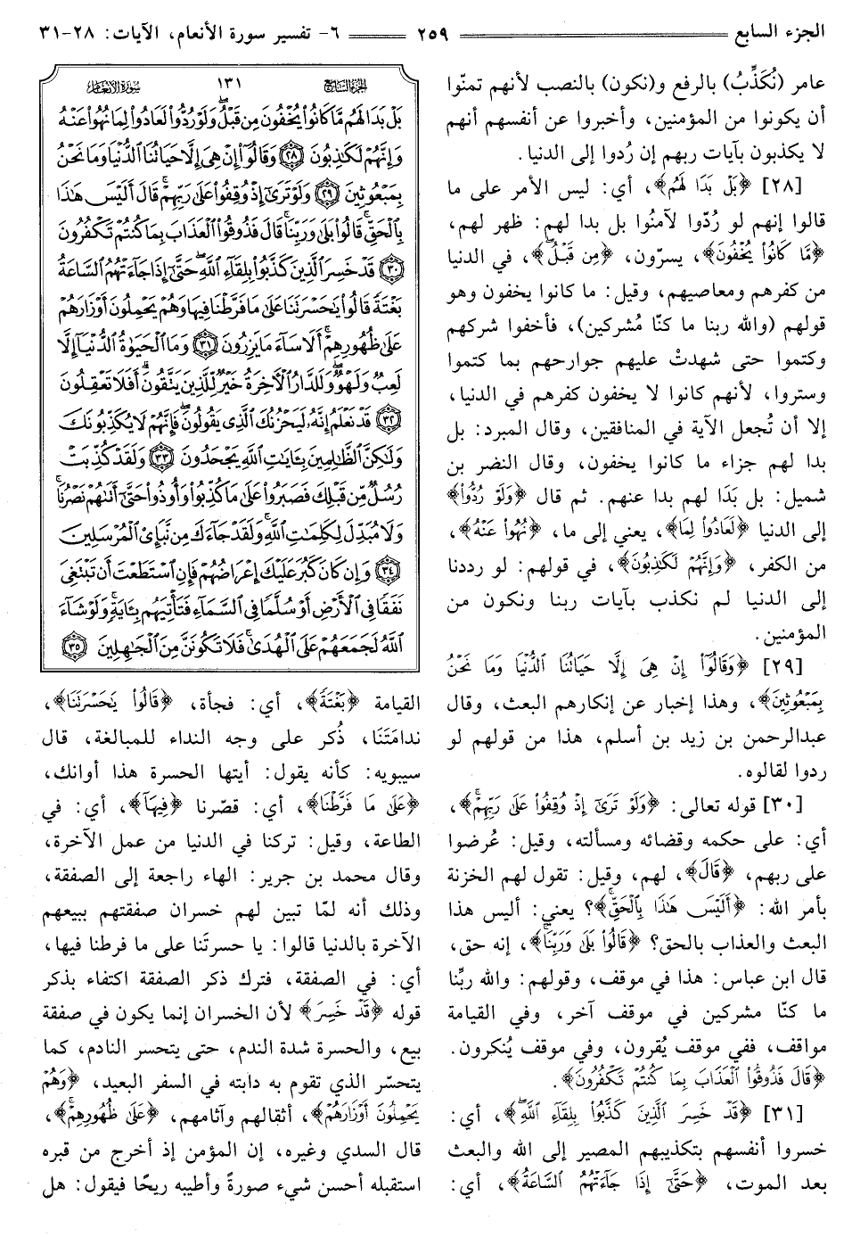 [31] {قَدْ خَسِرَ الَّذِينَ كَذَّبُوا بِلِقَاءِ اللَّهِ} [الأنعام: 31] أَيْ: خَسِرُوا أَنْفُسَهُمْ بِتَكْذِيبِهِمُ الْمَصِيرَ إلى الله والبعث بَعْدَ الْمَوْتِ، {حَتَّى إِذَا جَاءَتْهُمُ السَّاعَةُ} [الأنعام: 31] أي: القيامة {بَغْتَةً} [الأنعام: 31] أَيْ: فَجْأَةً، {قَالُوا يَا حَسْرَتَنَا} [الأنعام: 31] نَدَامَتَنَا، ذُكِرَ عَلَى وَجْهِ النِّدَاءِ للمبالغة، قال سِيبَوَيْهِ: كَأَنَّهُ يَقُولُ: أَيَّتُهَا الْحَسْرَةُ هَذَا أَوَانُكِ، {عَلَى مَا فَرَّطْنَا} [الأنعام: 31] أي: قصرنا {فِيهَا} [الأنعام: 31] أَيْ: فِي الطَّاعَةِ، وَقِيلَ: تَرَكْنَا فِي الدُّنْيَا مِنْ عَمَلِ الْآخِرَةِ، وقال مُحَمَّدُ بْنُ جَرِيرٍ: الْهَاءُ رَاجِعَةٌ إِلَى الصَّفْقَةِ، وَذَلِكَ أَنَّهُ لَمَّا تَبَيَّنَ لَهُمْ خُسْرَانُ صَفْقَتِهِمْ بِبَيْعِهِمُ الْآخِرَةَ بِالدُّنْيَا قَالُوا: يَا حَسْرَتَنَا عَلَى مَا فَرَّطْنَا فِيهَا، أَيْ: فِي الصَّفْقَةِ، فَتُرِكَ ذِكْرُ الصَّفْقَةِ اكتفاء بذكر قوله {قَدْ خَسِرَ} [الأنعام: 31] لِأَنَّ الْخُسْرَانَ إِنَّمَا يَكُونُ فِي صَفْقَةِ بَيْعٍ، وَالْحَسْرَةُ شِدَّةُ النَّدَمِ، حَتَّى يَتَحَسَّرَ النَّادِمُ، كَمَا يَتَحَسَّرُ الَّذِي تَقُومُ بِهِ دَابَّتُهُ فِي السَّفَرِ الْبَعِيدِ، {وَهُمْ يَحْمِلُونَ أَوْزَارَهُمْ} [الأنعام: 31] أثقالهم وآثامهم، {عَلَى ظُهُورِهِمْ} [الأنعام: 31] قَالَ السُّدِّيُّ وَغَيْرُهُ، إِنَّ الْمُؤْمِنَ إِذْ أُخْرِجَ مِنْ قَبْرِهِ اسْتَقْبَلَهُ أَحْسَنُ شَيْءٍ صُورَةً وَأَطْيَبُهُ رِيحًا فَيَقُولُ: هَلْ