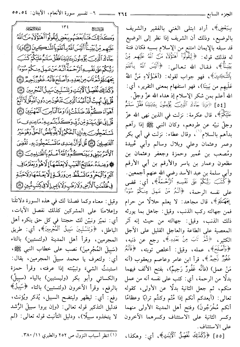 [54] ، {وَإِذَا جَاءَكَ الَّذِينَ يُؤْمِنُونَ بِآيَاتِنَا فَقُلْ سَلَامٌ عَلَيْكُمْ} [الأنعام: 54] قَالَ عِكْرِمَةُ: نَزَلَتْ فِي الَّذِينَ نَهَى اللَّهُ عَزَّ وَجَلَّ نَبِيَّهُ عَنْ طَرْدِهِمْ، وَكَانَ النَّبِيُّ صَلَّى اللَّهُ عَلَيْهِ وَسَلَّمَ إِذَا رَآهُمْ بَدَأَهُمْ بِالسَّلَامِ (¬1) . وَقَالَ عَطَاءٌ: نَزَلَتْ فِي أَبِي بَكْرٍ وَعُمَرَ وَعُثْمَانَ وَعَلِيٍّ وَبِلَالٍ وَسَالِمٍ وَأَبِي عُبَيْدَةَ وَمُصْعَبِ بْنِ عُمَيْرٍ وَحَمْزَةَ وَجَعْفَرٍ وَعُثْمَانَ بْنِ مَظْعُونٍ وَعَمَّارِ بْنِ يا سر وَالْأَرْقَمِ بْنِ أَبِي الْأَرْقَمِ وَأَبِي سَلَمَةَ بْنِ عَبْدِ الْأَسَدِ رَضِيَ اللَّهُ عَنْهُمْ أَجْمَعِينَ. {كَتَبَ رَبُّكُمْ عَلَى نَفْسِهِ الرَّحْمَةَ} [الأنعام: 54] أَيْ: قَضَى عَلَى نَفْسِهِ الرَّحْمَةَ، {أَنَّهُ مَنْ عَمِلَ مِنْكُمْ سُوءًا بِجَهَالَةٍ} [الأنعام: 54] قَالَ مُجَاهِدٌ: لَا يَعْلَمُ حَلَالًا مِنْ حَرَامٍ فَمِنْ جَهَالَتِهِ رَكِبَ الذَّنْبَ، وَقِيلَ: جَاهِلٌ بِمَا يُورِثُهُ ذَلِكَ الذَّنْبُ، وَقِيلَ: جَهَالَتُهُ مِنْ حَيْثُ أَنَّهُ آثَرَ الْمَعْصِيَةَ عَلَى الطَّاعَةِ وَالْعَاجِلَ الْقَلِيلَ عَلَى الْآجِلِ الْكَثِيرِ، {ثُمَّ تَابَ مِنْ بَعْدِهِ} [الأنعام: 54] رجع عن ذنبه، {وَأَصْلَحَ} [الأنعام: 54] عمله، وقيل: أَخْلَصَ تَوْبَتَهُ، {فَأَنَّهُ غَفُورٌ رَحِيمٌ} [الأنعام: 54] قَرَأَ ابْنُ عَامِرٍ وَعَاصِمٌ وَيَعْقُوبُ (أنه من عمل) (فَأَنَّهُ غَفُورٌ رَحِيمٌ) ، بِفَتْحِ الْأَلِفِ فِيهِمَا بَدَلًا مِنَ الرَّحْمَةِ، أَيْ: كَتَبَ عَلَى نَفْسِهِ أَنَّهُ مَنْ عَمَلِ مِنْكُمْ، ثُمَّ جَعَلَ الثَّانِيَةَ بَدَلًا عَنِ الْأُولَى، كَقَوْلِهِ تَعَالَى: {أَيَعِدُكُمْ أَنَّكُمْ إِذَا مِتُّمْ وَكُنْتُمْ تُرَابًا وَعِظَامًا أَنَّكُمْ مُخْرَجُونَ} [الْمُؤْمِنُونَ: 35] وَفَتَحَ أَهْلُ الْمَدِينَةِ الْأُولَى مِنْهُمَا وكسر الثَّانِيَةَ عَلَى الِاسْتِئْنَافِ وَكَسَرَهُمَا الْآخَرُونَ عَلَى الِاسْتِئْنَافِ.