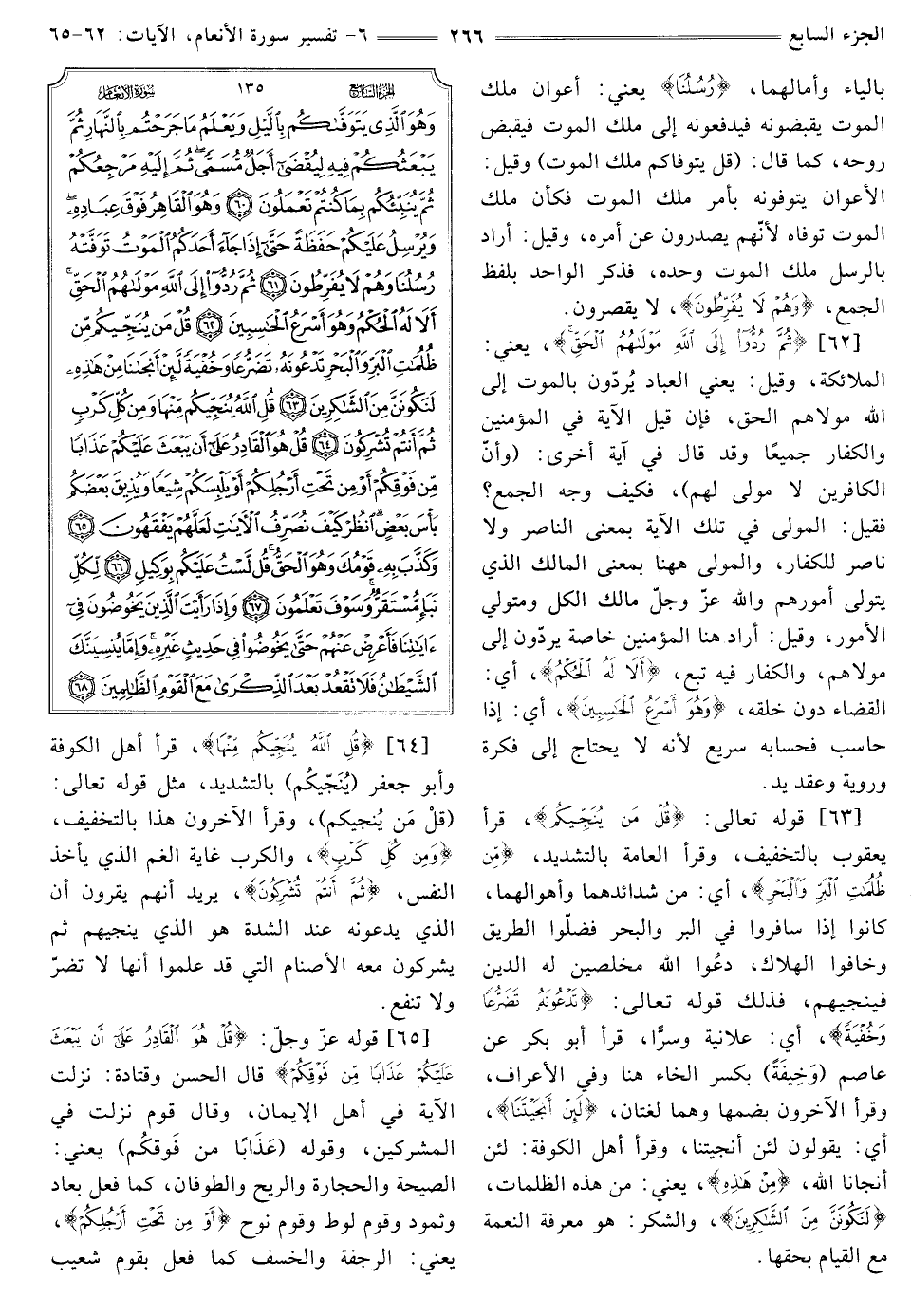 [64] ، {قُلِ اللَّهُ يُنَجِّيكُمْ مِنْهَا} [الأنعام: 64] قَرَأَ أَهْلُ الْكُوفَةِ وَأَبُو جَعْفَرٍ (يُنَجِّيكُمْ) بِالتَّشْدِيدِ، مِثْلُ قَوْلِهِ تَعَالَى: (قُلْ مَنْ يُنَجِّيكُمْ) ، وَقَرَأَ الْآخَرُونَ هَذَا بِالتَّخْفِيفِ، {وَمِنْ كُلِّ كَرْبٍ} [الأنعام: 64] وَالْكَرْبُ غَايَةُ الْغَمِّ الَّذِي يَأْخُذُ النفس، {ثُمَّ أَنْتُمْ تُشْرِكُونَ} [الأنعام: 64] يُرِيدُ أَنَّهُمْ يُقِرُّونَ أَنَّ الَّذِي يَدْعُونَهُ عِنْدَ الشِّدَّةِ هُوَ الَّذِي ينجيهم ثم يشركون مَعَهُ الْأَصْنَامَ الَّتِي قَدْ عَلِمُوا أَنَّهَا لَا تَضُرُّ وَلَا تَنْفَعُ.