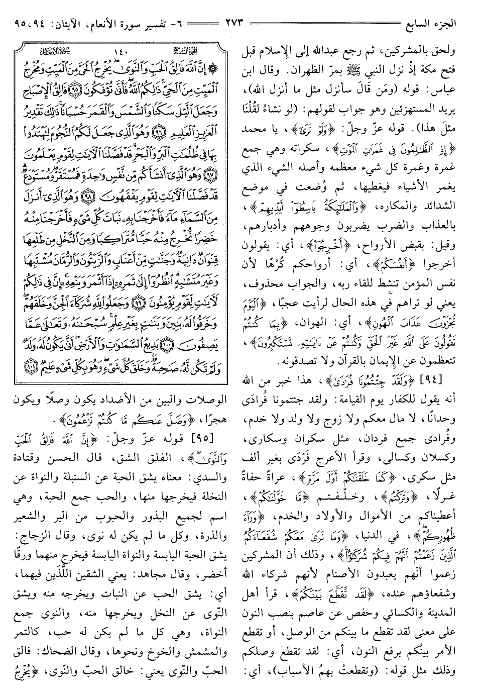 [94] ، {وَلَقَدْ جِئْتُمُونَا فُرَادَى} [الأنعام: 94] هَذَا خَبَرٌ مِنَ اللَّهِ أَنَّهُ يَقُولُ لِلْكُفَّارِ يَوْمَ الْقِيَامَةِ: وَلَقَدْ جِئْتُمُونَا فُرَادَى وُحْدَانًا، لَا مَالَ معكم وَلَا وَلَدَ وَلَا خَدَمَ، وَفُرَادَى جَمْعُ فَرْدَانَ، مِثْلُ سَكْرَانَ وَسُكَارَى، وَكَسْلَانَ وَكُسَالَى، وَقَرَأَ الْأَعْرَجُ فَرْدَى بغير ألف مثل سكارى، {كَمَا خَلَقْنَاكُمْ أَوَّلَ مَرَّةٍ} [الْأَنْعَامِ: 94] عراة حفاة غرلا, {وَتَرَكْتُمْ} [الأنعام: 94] وخلفتم {مَا خَوَّلْنَاكُمْ} [الأنعام: 94] أعطينايهم مِنَ الْأَمْوَالِ وَالْأَوْلَادِ وَالْخَدَمِ، {وَرَاءَ ظُهُورِكُمْ} [الأنعام: 94] فِي الدُّنْيَا، {وَمَا نَرَى مَعَكُمْ شُفَعَاءَكُمُ الَّذِينَ زَعَمْتُمْ أَنَّهُمْ فِيكُمْ شُرَكَاءُ} [الأنعام: 94] وَذَلِكَ أَنَّ الْمُشْرِكِينَ زَعَمُوا أَنَّهُمْ يَعْبُدُونَ الْأَصْنَامَ لِأَنَّهُمْ شُرَكَاءُ اللَّهِ وَشُفَعَاؤُهُمْ عِنْدَهُ، {لَقَدْ تَقَطَّعَ بَيْنَكُمْ} [الأنعام: 94] قَرَأَ أَهْلُ الْمَدِينَةِ وَالْكِسَائِيِّ وَحَفْصٌ عن عاصم بنصب النون على معنى لَقَدْ تَقَطَّعَ مَا بَيْنَكُمْ مِنَ الْوَصْلِ، أَوْ تَقَطَّعَ الْأَمْرُ بَيْنَكُمْ بِرَفْعِ النُّونِ، أَيْ: لَقَدْ تَقَطَّعَ وَصْلُكُمْ وَذَلِكَ مِثْلُ قَوْلِهِ: {وَتَقَطَّعَتْ بِهِمُ الْأَسْبَابُ} [الْبَقَرَةِ: 166] أَيِ: الْوَصَلَاتُ والبين من الأضداد وَصْلًا وَيَكُونُ هَجْرًا, {وَضَلَّ عَنْكُمْ مَا كُنْتُمْ تَزْعُمُونَ} [الأنعام: 94]