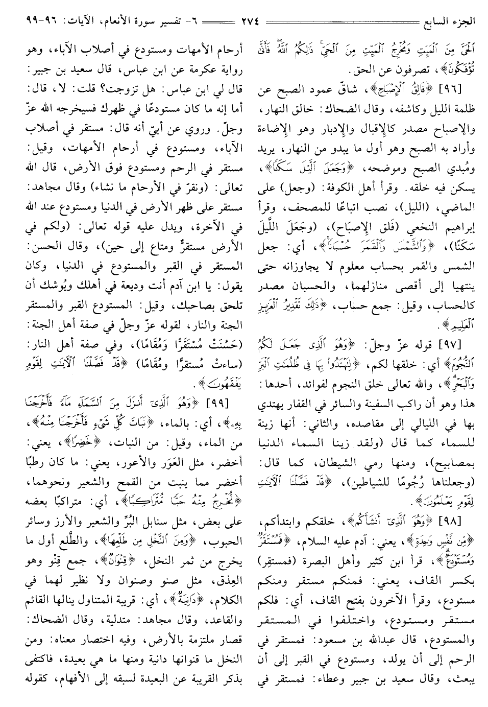 [98] ، {وَهُوَ الَّذِي أَنْشَأَكُمْ} [الأنعام: 98] خَلَقَكُمْ وَابْتَدَأَكُمْ {مِنْ نَفْسٍ وَاحِدَةٍ} [الأنعام: 98] يَعْنِي: آدَمَ عَلَيْهِ السَّلَامُ، {فَمُسْتَقَرٌّ وَمُسْتَوْدَعٌ} [الأنعام: 98] قَرَأَ ابْنُ كَثِيرٍ وَأَهْلُ الْبَصْرَةِ (فَمُسْتَقِرٌّ) بِكَسْرِ الْقَافِ، يَعْنِي: فَمِنْكُمْ مُسْتَقِرٌّ وَمِنْكُمْ مُسْتَوْدَعٌ، وَقَرَأَ الْآخَرُونَ بِفَتْحِ الْقَافِ، أَيْ: فَلَكُمْ مُسْتَقَرٌّ وَمُسْتَوْدَعٌ، وَاخْتَلَفُوا فِي الْمُسْتَقَرِّ وَالْمُسْتَوْدَعِ فَقَالَ عَبْدُ اللَّهِ بْنُ مَسْعُودٍ: فَمُسْتَقَرٌّ فِي الرَّحِمِ إِلَى أَنْ يُولَدَ، وَمُسْتَوْدَعٌ فِي الْقَبْرِ إِلَى أَنْ يُبْعَثَ، وَقَالَ سَعِيدُ بْنُ جُبَيْرٍ وَعَطَاءٌ: فَمُسْتَقَرٌّ فِي أَرْحَامِ الْأُمَّهَاتِ وَمُسْتَوْدَعٌ فِي أَصْلَابِ الْآبَاءِ، وَهُوَ رِوَايَةُ عِكْرِمَةَ عَنِ ابْنِ عَبَّاسٍ، قَالَ سَعِيدُ بْنُ جُبَيْرٍ: قَالَ لِيَ ابْنُ عَبَّاسٍ: هَلْ تزوجت؟ قلت: لا، قال: أما إنه ما كان مستودعا في ظهرك فسيخرجه اللَّهُ عَزَّ وَجَلَّ. وَرُوِيَ عَنْ أُبَيٍّ أَنَّهُ قَالَ: مُسْتَقَرٌّ فِي أَصْلَابِ الْآبَاءِ، وَمُسْتَوْدَعٌ فِي أَرْحَامِ الْأُمَّهَاتِ، وَقِيلَ: مُسْتَقَرٌّ فِي الرَّحِمِ وَمُسْتَوْدَعٌ فَوْقَ الْأَرْضِ، قَالَ اللَّهُ تَعَالَى: {وَنُقِرُّ فِي الْأَرْحَامِ مَا نَشَاءُ} [الْحَجِّ: 5] وَقَالَ مُجَاهِدٌ: مُسْتَقَرٌّ عَلَى ظَهْرِ الْأَرْضِ فِي الدُّنْيَا وَمُسْتَوْدَعٌ عِنْدَ اللَّهِ فِي الْآخِرَةِ، وَيَدُلُّ عَلَيْهِ قَوْلُهُ تَعَالَى: {وَلَكُمْ فِي الْأَرْضِ مُسْتَقَرٌّ وَمَتَاعٌ إِلَى حِينٍ} [الْبَقَرَةِ: 36] وَقَالَ الْحَسَنُ: الْمُسْتَقَرُّ في القبر وَالْمُسْتَوْدَعُ فِي الدُّنْيَا، وَكَانَ يَقُولُ: يَا ابْنَ آدَمَ أَنْتَ وَدِيعَةٌ فِي أَهْلِكَ وَيُوشِكُ أَنْ تَلْحَقَ بِصَاحِبِكَ، وَقِيلَ: الْمُسْتَوْدَعُ الْقَبْرُ وَالْمُسْتَقَرُّ الْجَنَّةُ وَالنَّارُ، لِقَوْلِهِ عَزَّ وَجَلَّ في صفة أهل الجنة: {حَسُنَتْ مُسْتَقَرًّا وَمُقَامًا} [الفرقان: 76] وفي صفة أهل النار: {سَاءَتْ مُسْتَقَرًّا وَمُقَامًا} [الْفُرْقَانِ: 66] {قَدْ فَصَّلْنَا الْآيَاتِ لِقَوْمٍ يَفْقَهُونَ} [الأنعام: 98]