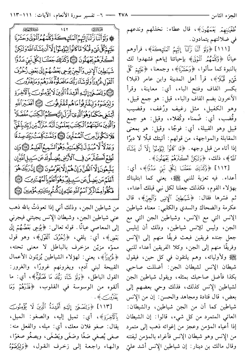 [112] {وَكَذَلِكَ جَعَلْنَا لِكُلِّ نَبِيٍّ عَدُوًّا} [الأنعام: 112] أَيْ: أَعْدَاءً. فِيهِ تَعْزِيَةٌ لِلنَّبِيِّ صَلَّى اللَّهُ عَلَيْهِ وَسَلَّمَ، يَعْنِي كَمَا ابْتَلَيْنَاكَ بِهَؤُلَاءِ الْقَوْمِ، فَكَذَلِكَ جَعَلْنَا لِكُلِّ نَبِيٍّ قَبْلَكَ أَعْدَاءً، ثم فسرها فقال: {شَيَاطِينَ الْإِنْسِ وَالْجِنِّ} [الأنعام: 112] قَالَ عِكْرِمَةُ وَالضَّحَّاكُ وَالسُّدِّيُّ وَالْكَلْبِيُّ: مَعْنَاهُ شَيَاطِينُ الْإِنْسِ الَّتِي مَعَ الْإِنْسِ، وَشَيَاطِينُ الْجِنِّ الَّتِي مَعَ الْجِنِّ، وَلَيْسَ لِلْإِنْسِ شَيَاطِينٌ، وَذَلِكَ أَنَّ إِبْلِيسَ جَعَلَ جُنْدَهُ فَرِيقَيْنِ فَبَعَثَ فَرِيقًا مِنْهُمْ إِلَى الْإِنْسِ وَفَرِيقًا مِنْهُمْ إِلَى الْجِنِّ، وَكِلَا الْفَرِيقَيْنِ أَعْدَاءٌ لِلنَّبِيِّ صَلَّى اللَّهُ عليه وسلم ولأوليائه، وهم يَلْتَقُونَ فِي كُلِّ حِينٍ، فَيَقُولُ شَيْطَانُ الْإِنْسِ لِشَيْطَانِ الْجِنِّ: أَضْلَلْتُ صَاحِبِي بِكَذَا فَأَضِلَّ صَاحِبَكَ بِمِثْلِهِ، ويقول شَيَاطِينُ الْجِنِّ لِشَيَاطِينِ الْإِنْسِ كَذَلِكَ، فَذَلِكَ وَحْيُ بَعْضِهِمْ إِلَى بَعْضٍ، قَالَ قَتَادَةُ وَمُجَاهِدٌ وَالْحَسَنُ: إِنَّ مِنَ الْإِنْسِ شَيَاطِينٌ كَمَا أَنَّ مِنَ الْجِنِّ شَيَاطِينٌ، وَالشَّيْطَانُ: الْعَاتِي الْمُتَمَرِّدُ مِنْ كُلِّ شَيْءٍ، قَالُوا: إِنَّ الشَّيْطَانَ إِذَا أَعْيَاهُ الْمُؤْمِنُ وَعَجَزَ مِنْ إِغْوَائِهِ ذَهَبَ إِلَى مُتَمَرِّدٍ مِنَ الْإِنْسِ وَهُوَ شَيْطَانُ الإنس فأغراه بالمؤمن ليفتنه وَقَالَ مَالِكُ بْنُ دِينَارٍ: إِنَّ شَيَاطِينَ الْإِنْسِ أَشَدُّ عَلَيَّ مِنْ شَيَاطِينِ الْجِنِّ، وَذَلِكَ أَنِّي إِذَا تعوذت بالله ذهب عني شياطين الْجِنِّ، وَشَيْطَانُ الْإِنْسِ يَجِيئُنِي فَيَجُرُّنِي إِلَى الْمَعَاصِي عِيَانًا. قَوْلُهُ تَعَالَى: {يُوحِي بَعْضُهُمْ إِلَى بَعْضٍ} [الأنعام: 112] أي: يلقي، {زُخْرُفَ الْقَوْلِ} [الأنعام: 112] وهو قول مموه مزين مزخرف بِالْبَاطِلِ لَا مَعْنَى تَحْتَهُ، {غُرُورًا} [النساء: 120] يَعْنِي: لِهَؤُلَاءِ الشَّيَاطِينِ يُزَيِّنُونَ الْأَعْمَالَ القبيحة لبني آدم، ويغرونهم غُرُورًا، وَالْغُرُورُ: الْقَوْلُ الْبَاطِلُ، {وَلَوْ شَاءَ رَبُّكَ مَا فَعَلُوهُ} [الأنعام: 112] أي: ما ألقوه مِنَ الْوَسْوَسَةِ فِي الْقُلُوبِ، {فَذَرْهُمْ وَمَا يَفْتَرُونَ} [الأنعام: 112]