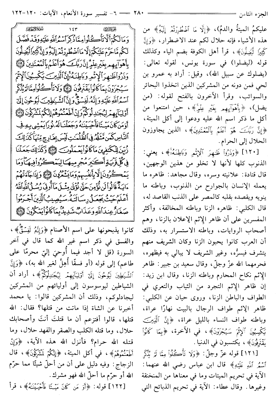 [120] {وَذَرُوا ظَاهِرَ الْإِثْمِ وَبَاطِنَهُ} [الأنعام: 120] يَعْنِي: الذُّنُوبَ كُلَّهَا لِأَنَّهَا لَا تَخْلُو مِنْ هَذَيْنَ الْوَجْهَيْنِ، قَالَ قَتَادَةُ: عَلَانِيَتِهِ وَسِرِّهِ، وَقَالَ مُجَاهِدٌ: ظاهره ما يعمله الإنسان بِالْجَوَارِحِ مِنَ الذُّنُوبِ، وَبَاطِنُهُ مَا يَنْوِيهِ وَيَقْصِدُهُ بِقَلْبِهِ كَالْمُصِرِّ عَلَى الذنب القاصد له، قال الكلبي: ظاهره الزنا وباطنه المخالفة، وَأَكْثَرُ الْمُفَسِّرِينَ عَلَى أَنَّ ظَاهِرَ الْإِثْمِ الْإِعْلَانُ بِالزِّنَا، وَهُمْ أَصْحَابُ الروايات، وباطنه الاستمرار بِهِ، وَذَلِكَ أَنَّ الْعَرَبَ كَانُوا يحبون الزنا وكان الشريف منهم يتشرف فيسره، وَغَيْرُ الشَّرِيفِ لَا يُبَالِي بِهِ فَيُظْهِرُهُ، فَحَرَّمَهُمَا اللَّهُ عَزَّ وَجَلَّ، وَقَالَ سَعِيدُ بْنُ جُبَيْرٍ: ظَاهِرُ الْإِثْمِ نِكَاحُ الْمَحَارِمِ وَبَاطِنُهُ الزِّنَا، وقال ابن زيد: إن ظَاهِرُ الْإِثْمِ التَّجَرُّدُ مِنَ الثِّيَابِ وَالتَّعَرِّي فِي الطَّوَافِ وَالْبَاطِنُ الزِّنَا، وروى حيان عَنِ الْكَلْبِيِّ: ظَاهِرُ الْإِثْمِ طَوَافُ الرِّجَالِ بِالْبَيْتِ نَهَارًا عُرَاةً، وَبَاطِنُهُ طَوَافُ النِّسَاءِ بِاللَّيْلِ عُرَاةً، {إِنَّ الَّذِينَ يَكْسِبُونَ الْإِثْمَ سَيُجْزَوْنَ} [الأنعام: 120] فِي الْآخِرَةِ، {بِمَا كَانُوا يَقْتَرِفُونَ} [الأنعام: 120] يَكْتَسِبُونَ فِي الدُّنْيَا.