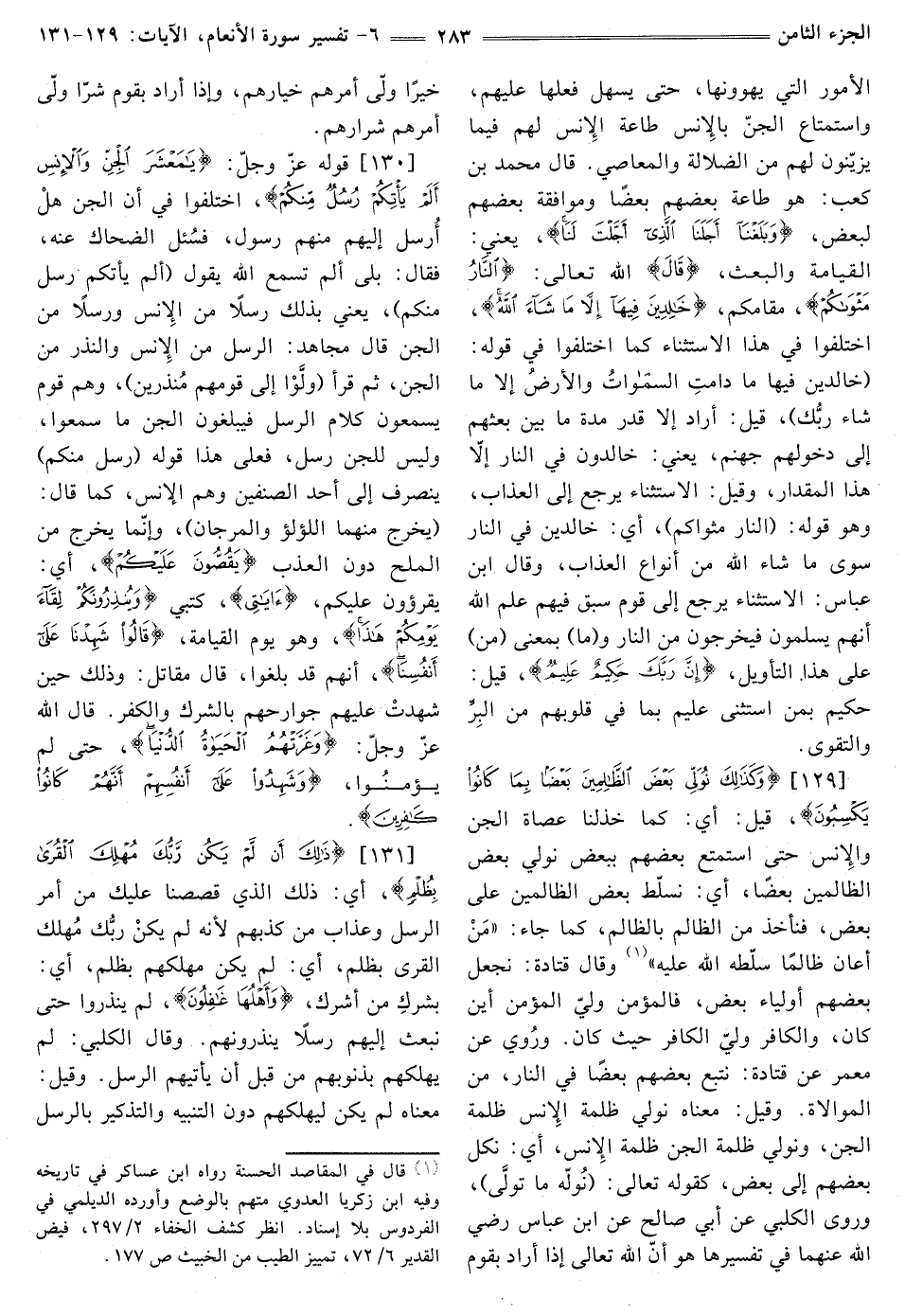 [130] قَوْلُهُ عَزَّ وَجَلَّ: {يَا مَعْشَرَ الْجِنِّ وَالْإِنْسِ أَلَمْ يَأْتِكُمْ رُسُلٌ مِنْكُمْ} [الأنعام: 130] اخْتَلَفُوا فِي أَنَّ الْجِنَّ هَلْ أُرْسِلَ إِلَيْهِمْ مِنْهُمْ رَسُولٌ، فَسُئِلَ الضَّحَّاكُ عَنْهُ، فَقَالَ: بَلَى أَلَمْ تَسْمَعِ اللَّهَ يَقُولُ (أَلَمْ يَأْتِكُمْ رُسُلٌ مِنْكُمْ) ، يَعْنِي بِذَلِكَ رُسُلًا مِنَ الْإِنْسِ وَرُسُلًا مِنَ الْجِنِّ قَالَ مُجَاهِدٌ: الرُّسُلُ مِنَ الْإِنْسِ وَالنُّذُرُ مِنَ الْجِنِّ، ثُمَّ قَرَأَ {وَلَّوْا إِلَى قَوْمِهِمْ مُنْذِرِينَ} [الْأَحْقَافُ: 29] وَهُمْ قَوْمٌ يَسْمَعُونَ كَلَامَ الرُّسُلِ فَيُبَلِّغُونَ الْجِنَّ مَا سَمِعُوا، وَلَيْسَ لِلْجِنِّ رُسُلٌ، فَعَلَى هَذَا قَوْلُهُ (رُسُلٌ مِنْكُمْ) يَنْصَرِفُ إِلَى أَحَدِ الصِّنْفَيْنِ وَهُمُ الْإِنْسُ، كَمَا قَالَ: {يَخْرُجُ مِنْهُمَا اللُّؤْلُؤُ وَالْمَرْجَانُ} [الرَّحْمَنِ: 22] وَإِنَّمَا يَخْرُجُ مِنَ الْمِلْحِ دُونَ العذب {يَقُصُّونَ عَلَيْكُمْ} [الأنعام: 130] أي: يقرءون عليكم، {آيَاتِي} [الأنعام: 130] كُتُبِي {وَيُنْذِرُونَكُمْ لِقَاءَ يَوْمِكُمْ هَذَا} [الأنعام: 130] وَهُوَ يَوْمُ الْقِيَامَةِ، {قَالُوا شَهِدْنَا عَلَى أَنْفُسِنَا} [الأنعام: 130] أَنَّهُمْ قَدْ بُلِّغُوا، قَالَ مُقَاتِلٌ: وَذَلِكَ حِينَ شَهِدَتْ عَلَيْهِمْ جَوَارِحُهُمْ بِالشِّرْكِ وَالْكُفْرِ. قَالَ اللَّهُ عَزَّ وجل: {وَغَرَّتْهُمُ الْحَيَاةُ الدُّنْيَا} [الأنعام: 130] حَتَّى لَمْ يُؤْمِنُوا، {وَشَهِدُوا عَلَى أَنْفُسِهِمْ أَنَّهُمْ كَانُوا كَافِرِينَ} [الأنعام: 130]