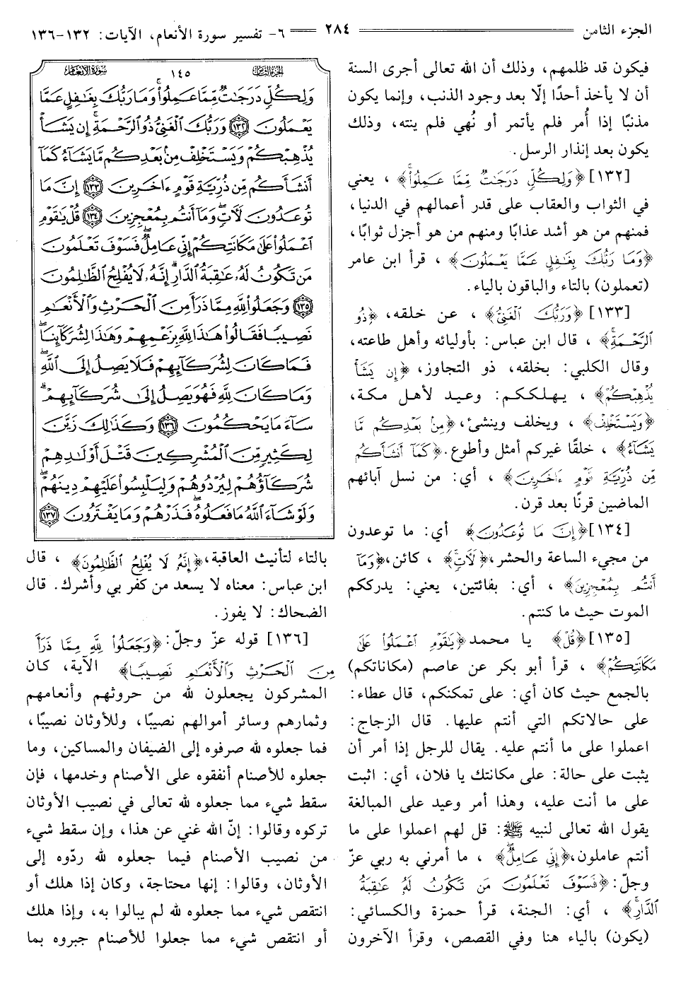 [132] {وَلِكُلٍّ دَرَجَاتٌ مِمَّا عَمِلُوا} [الأنعام: 132] يَعْنِي فِي الثَّوَابِ وَالْعِقَابِ عَلَى قَدْرِ أَعْمَالِهِمْ فِي الدُّنْيَا، فَمِنْهُمْ هُوَ أَشَدُّ عَذَابًا وَمِنْهُمْ مَنْ هُوَ أَجْزَلُ ثَوَابًا، {وَمَا رَبُّكَ بِغَافِلٍ عَمَّا يَعْمَلُونَ} [الأنعام: 132] قَرَأَ ابْنُ عَامِرٍ (تَعْمَلُونَ) بِالتَّاءِ والباقون بالياء.