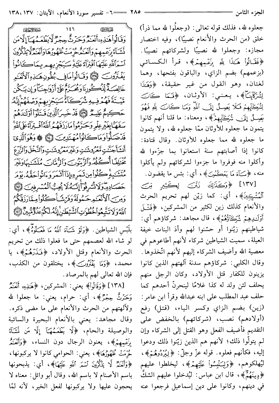 [138] {وَقَالُوا} [الأنعام: 138] يَعْنِي: الْمُشْرِكِينَ, {هَذِهِ أَنْعَامٌ وَحَرْثٌ حِجْرٌ} [الأنعام: 138] أَيْ: حَرَامٌ، يَعْنِي: مَا جَعَلُوا لِلَّهِ وَلِآلِهَتِهِمْ مِنَ الْحَرْثِ وَالْأَنْعَامِ عَلَى مَا مَضَى ذِكْرُهُ. وَقَالَ مجاهد: يعني الأنعام الْبَحِيرَةَ وَالسَّائِبَةَ وَالْوَصِيلَةَ وَالْحَامِ، {لَا يَطْعَمُهَا إِلَّا مَنْ نَشَاءُ بِزَعْمِهِمْ} [الأنعام: 138] يَعْنُونُ الرِّجَالَ دُونَ النِّسَاءِ، {وَأَنْعَامٌ حُرِّمَتْ ظُهُورُهَا} [الأنعام: 138] يَعْنِي: الْحَوَامِيَ كَانُوا لَا يَرْكَبُونَهَا، {وَأَنْعَامٌ لَا يَذْكُرُونَ اسْمَ اللَّهِ عَلَيْهَا} [الأنعام: 138] أَيْ: يَذْبَحُونَهَا بِاسْمِ الْأَصْنَامِ لَا بَاسِمَ اللَّهِ، وَقَالَ أَبُو وَائِلٍ: مَعْنَاهُ لَا يَحُجُّونَ عَلَيْهَا وَلَا يَرْكَبُونَهَا لِفِعْلِ الْخَيْرِ، لِأَنَّهُ لَمَّا