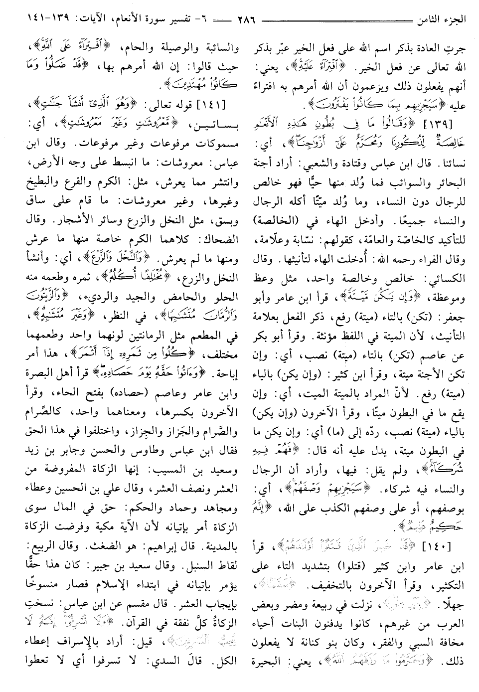 [141] قَوْلُهُ تَعَالَى: {وَهُوَ الَّذِي أَنْشَأَ جَنَّاتٍ} [الأنعام: 141] بساتين، {مَعْرُوشَاتٍ وَغَيْرَ مَعْرُوشَاتٍ} [الأنعام: 141] أَيْ: مَسْمُوكَاتٍ مَرْفُوعَاتٍ وَغَيْرَ مَرْفُوعَاتٍ. وَقَالَ ابْنُ عَبَّاسٍ: مَعْرُوشَاتٍ: مَا انْبَسَطَ عَلَى وَجْهِ الْأَرْضِ، وَانْتَشَرَ مِمَّا يُعَرِّشُ، مِثْلُ: الْكَرْمِ وَالْقَرْعِ وَالْبِطِّيخِ وَغَيْرِهَا، وَغَيْرَ مَعْرُوشَاتٍ: مَا قَامَ عَلَى سَاقٍ وَبَسَقَ، مِثْلُ النَّخْلِ وَالزَّرْعِ وَسَائِرِ الْأَشْجَارِ. وَقَالَ الضَّحَّاكُ: كِلَاهُمَا الْكَرْمُ خَاصَّةً مِنْهَا مَا عَرَّشَ وَمِنْهَا مَا لَمْ يعرش. {وَالنَّخْلَ وَالزَّرْعَ} [الأنعام: 141] أَيْ: وَأَنْشَأَ النَّخْلَ وَالزَّرْعَ، {مُخْتَلِفًا أُكُلُهُ} [الأنعام: 141] ثمره وطعمه منه الْحُلْوُ وَالْحَامِضُ وَالْجَيِّدُ وَالرَّدِيءُ، {وَالزَّيْتُونَ وَالرُّمَّانَ مُتَشَابِهًا} [الأنعام: 141] في النظر، {وَغَيْرَ مُتَشَابِهٍ} [الأنعام: 141] فِي الْمَطْعَمِ مِثْلَ الرُّمَّانَتَيْنِ لَوْنُهُمَا وَاحِدٌ وَطَعْمُهُمَا مُخْتَلِفٌ، {كُلُوا مِنْ ثَمَرِهِ إِذَا أَثْمَرَ} [الأنعام: 141] هَذَا أَمْرُ إِبَاحَةٍ. {وَآتُوا حَقَّهُ يَوْمَ حَصَادِهِ} [الأنعام: 141] قَرَأَ أَهْلُ الْبَصْرَةِ وَابْنُ عَامِرٍ وَعَاصِمٌ (حَصَادِهِ) بِفَتْحِ الْحَاءِ، وَقَرَأَ الْآخَرُونَ بِكَسْرِهَا، وَمَعْنَاهُمَا وَاحِدٌ، كَالصِّرَامِ وَالصَّرَامِ وَالْجَزَازِ وَالْجِزَازِ، وَاخْتَلَفُوا فِي هَذَا الْحَقِّ فَقَالَ ابْنُ عَبَّاسٍ وَطَاوُسٌ وَالْحَسَنُ وَجَابِرُ بْنُ زَيْدٍ وَسَعِيدُ بْنُ الْمُسَيَّبِ: إِنَّهَا الزَّكَاةُ الْمَفْرُوضَةُ مِنَ الْعُشْرِ وَنِصْفِ الْعُشْرِ، وَقَالَ عَلِيُّ بْنُ الْحُسَيْنِ وَعَطَاءٌ ومجاهد وحماد والحكم: حَقٌّ فِي الْمَالِ سِوَى الزَّكَاةِ أَمَرَ بِإِتْيَانِهِ لِأَنَّ الْآيَةَ مَكِّيَّةٌ وَفُرِضَتِ الزَّكَاةُ بِالْمَدِينَةِ. قَالَ إِبْرَاهِيمُ: هُوَ الضِّغْثُ. وَقَالَ الرَّبِيعُ: لُقَاطُ السنبل. وَقَالَ سَعِيدُ بْنُ جُبَيْرٍ: كَانَ هَذَا حَقًّا يُؤْمَرُ بِإِتْيَانِهِ فِي ابْتِدَاءِ الْإِسْلَامِ فَصَارَ مَنْسُوخًا بِإِيجَابِ العشر. قال مِقْسَمٌ عَنِ ابْنِ عَبَّاسٍ: نَسَخَتِ الزَّكَاةُ كُلَّ نَفَقَةٍ فِي الْقُرْآنِ. {وَلَا تُسْرِفُوا إِنَّهُ لَا يُحِبُّ الْمُسْرِفِينَ} [الأنعام: 141] قِيلَ: أَرَادَ بِالْإِسْرَافِ إِعْطَاءَ الْكُلِّ. قَالَ السُّدِّيُّ: لَا تُسْرِفُوا أَيْ لَا تُعْطُوا
