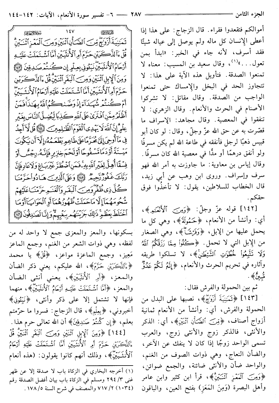 [143] {ثَمَانِيَةَ أَزْوَاجٍ} [الأنعام: 143] نَصْبُهَا عَلَى الْبَدَلِ مِنَ الْحَمُولَةِ وَالْفَرْشِ, أَيْ: وَأَنْشَأَ مِنَ الْأَنْعَامِ ثَمَانِيَةَ أَزْوَاجٍ أَصْنَافٍ, {مِنَ الضَّأْنِ اثْنَيْنِ} [الأنعام: 143] أَيِ الذَّكَرِ وَالْأُنْثَى، فَالذَّكَرُ زَوْجٌ وَالْأُنْثَى زَوْجٌ, وَالْعَرَبُ تُسَمِّي الْوَاحِدَ زَوْجًا إِذَا كَانَ لَا يَنْفَكُّ عن الآخرة, وَالضَّأْنُ النِّعَاجُ، وَهِيَ ذَوَاتُ الصُّوفِ من الغنم, والواحد ضأن والأنثى ضائنة, والجمع ضوائن, والواحد ضأن وَالْأُنْثَى ضَائِنَةٌ، وَالْجَمْعُ ضَوَائِنُ, {وَمِنَ الْمَعْزِ اثْنَيْنِ} [الأنعام: 143] قَرَأَ ابْنُ كَثِيرٍ وَابْنُ عَامِرٍ وأهل البصرة (ومن الْمَعَزِ) بِفَتْحِ الْعَيْنِ, وَالْبَاقُونَ بِسُكُونِهَا, وَالْمَعْزُ وَالْمَعْزَى جَمْعٌ لَا وَاحِدَ لَهُ مَنْ لَفْظِهِ، وَهِيَ ذَوَاتُ الشَّعْرِ مِنَ الْغَنَمِ، وَجَمْعُ الْمَاعِزِ مَعِيزٌ، وَجَمْعُ الْمَاعِزَةِ مَوَاعِزُ، {قُلْ} [الأنعام: 143] يا محمد {آلذَّكَرَيْنِ حَرَّمَ} [الأنعام: 143] اللَّهُ عَلَيْكُمْ، يَعْنِي ذَكَرَ الضَّأْنِ والمعز، {أَمِ الْأُنْثَيَيْنِ} [الأنعام: 143] يَعْنِي أُنْثَى الضَّأْنِ وَالْمَعْزِ، {أَمَّا اشْتَمَلَتْ عَلَيْهِ أَرْحَامُ الْأُنْثَيَيْنِ} [الأنعام: 143] مِنْهُمَا فَإِنَّهَا لَا تَشْتَمِلُ إِلَّا على ذكر وأنثى، {نَبِّئُونِي} [الأنعام: 143] وأخبروني، {بِعِلْمٍ} [الأنعام: 143] قَالَ الزَّجَّاجُ: فَسِّرُوا مَا حَرَّمْتُمْ بعلم، {إِنْ كُنْتُمْ صَادِقِينَ} [الأنعام: 143] أن الله تعالى حرم هذا.