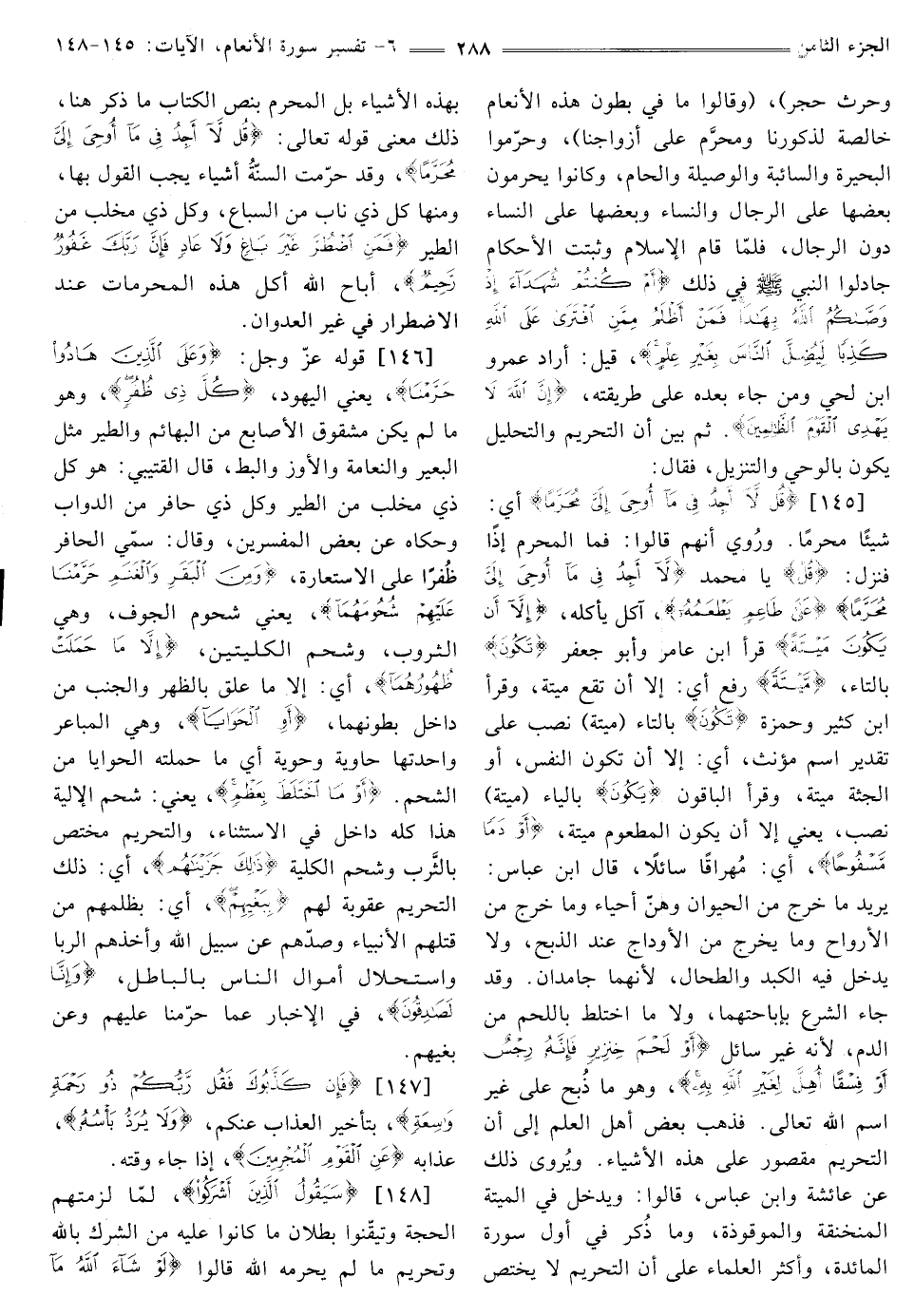 [145] {قُلْ لَا أَجِدُ فِي مَا أُوحِيَ إِلَيَّ مُحَرَّمًا} [الأنعام: 145] أي: شيئا مُحَرَّمًا. وَرُوِيَ أَنَّهُمْ قَالُوا: فَمَا المحرم إذا فنزل:، {قُلْ} [الأنعام: 145] يَا مُحَمَّدُ {لَا أَجِدُ فِي مَا أُوحِيَ إِلَيَّ مُحَرَّمًا عَلَى طَاعِمٍ يَطْعَمُهُ} [الأنعام: 145] آكِلٍ يَأْكُلُهُ، {إِلَّا أَنْ يَكُونَ مَيْتَةً} [الأنعام: 145] قَرَأَ ابْنُ عَامِرٍ وَأَبُو جَعْفَرٍ تَكُونَ بِالتَّاءِ, مَيْتَةٌ رَفْعٌ أَيْ: إِلَّا أَنْ تَقَعَ مَيْتَةٌ، وَقَرَأَ ابْنُ كَثِيرٍ وَحَمْزَةُ تَكُونَ بِالتَّاءِ (مَيْتَةً) نُصِبَ عَلَى تَقْدِيرِ اسْمٍ مُؤَنَّثٍ، أَيْ: إِلَّا أَنْ تَكُونَ النَّفْسُ، أَوْ الْجُثَّةُ مَيِّتَةً، وَقَرَأَ الْبَاقُونَ يَكُونَ بِالْيَاءِ (مَيْتَةً) نَصْبٌ، يَعْنِي إِلَّا أَنْ يَكُونَ الْمَطْعُومُ ميتة، {أَوْ دَمًا مَسْفُوحًا} [الأنعام: 145] أَيْ: مُهْرَاقًا سَائِلًا، قَالَ ابْنُ عَبَّاسٍ: يُرِيدُ مَا خَرَجَ مِنَ الْحَيَوَانِ وَهُنَّ أَحْيَاءٌ وَمَا خَرَجَ مِنَ الْأَرْوَاحِ وَمَا يَخْرُجُ مِنَ الْأَوْدَاجِ عِنْدَ الذَّبْحِ، وَلَا يَدْخُلُ فِيهِ الْكَبِدُ وَالطِّحَالُ، لِأَنَّهُمَا جَامِدَانِ. وَقَدْ جَاءَ الشَّرْعُ بِإِبَاحَتِهِمَا، وَلَا مَا اخْتَلَطَ بِاللَّحْمِ مِنَ الدَّمِ، لأنه غير سائل {أَوْ لَحْمَ خِنْزِيرٍ فَإِنَّهُ رِجْسٌ أَوْ فِسْقًا أُهِلَّ لِغَيْرِ اللَّهِ بِهِ} [الأنعام: 145] وَهُوَ مَا ذُبِحَ عَلَى غَيْرِ اسْمِ اللَّهِ تَعَالَى. فَذَهَبَ بَعْضُ أَهْلِ الْعِلْمِ إِلَى أَنَّ التَّحْرِيمَ مقصور على هذه الأشياء. ويروى ذَلِكَ عَنْ عَائِشَةَ وَابْنِ عَبَّاسٍ، قَالُوا: وَيَدْخُلُ فِي الْمَيْتَةِ الْمُنْخَنِقَةُ وَالْمَوْقُوذَةُ, وَمَا ذُكِرَ فِي أَوَّلِ سُورَةِ الْمَائِدَةِ وَأَكْثَرُ الْعُلَمَاءِ عَلَى أَنَّ التَّحْرِيمَ لَا يَخْتَصُّ بِهَذِهِ الأشياء بل المحرم بِنَصِّ الْكِتَابِ مَا ذُكِرَ هُنَا, ذَلِكَ مَعْنَى قَوْلِهِ تَعَالَى: {قُلْ لَا أَجِدُ فِي مَا أُوحِيَ إِلَيَّ مُحَرَّمًا} [الأنعام: 145] وَقَدْ حَرَّمَتِ السُّنَةُ أَشْيَاءَ يَجِبُ القول بها، ومنها كُلِّ ذِي نَابٍ مِنَ السِّبَاعِ، وَكُلِّ ذِي مِخْلَبٍ مِنَ الطَّيْرِ {فَمَنِ اضْطُرَّ غَيْرَ بَاغٍ وَلَا عَادٍ فَإِنَّ رَبَّكَ غَفُورٌ رَحِيمٌ} [الأنعام: 145] أباح الله أَكْلَ هَذِهِ الْمُحْرِمَاتِ عِنْدَ الِاضْطِرَارِ في غير العدوان.