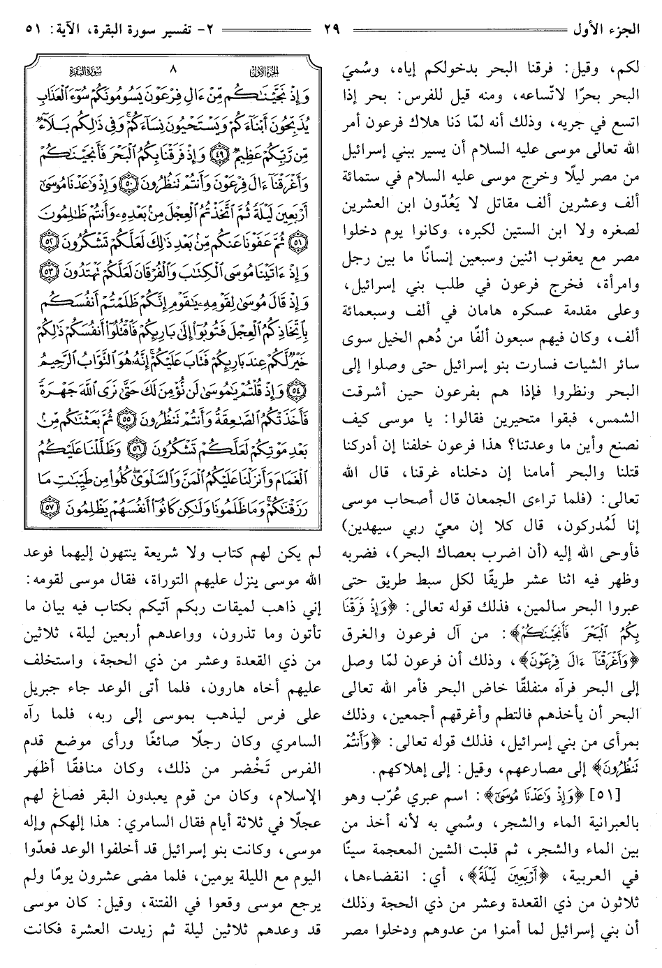 [51] : {وَإِذْ وَاعَدْنَا مُوسَى} [البقرة: 51] اسم عبري عُرّب وهو بالعبرانية الماء والشجر، وسمي بِهِ لِأَنَّهُ أُخِذَ مِنْ بَيْنِ الْمَاءِ وَالشَّجَرِ، ثُمَّ قُلِبَتِ الشِّينُ الْمُعْجَمَةُ سِينًا فِي الْعَرَبِيَّةِ، {أَرْبَعِينَ لَيْلَةً} [البقرة: 51] أي: انقضاءها، ثلاثون من ذي الْقِعْدَةِ وَعَشْرٌ مِنْ ذِي الْحِجَّةِ وَذَلِكَ أَنَّ بَنِي إِسْرَائِيلَ لِمَا أَمِنُوا مِنْ عَدُوِّهِمْ وَدَخَلُوا مِصْرَ لَمْ يَكُنْ لَهُمْ كِتَابٌ وَلَا شَرِيعَةٌ يَنْتَهُونَ إِلَيْهِمَا فَوَعَدَ اللَّهُ موسى ينزل عليهم التَّوْرَاةَ، فَقَالَ مُوسَى لِقَوْمِهِ: إِنِّي ذَاهِبٌ لِمِيقَاتِ رَبِّكُمْ آتِيكُمْ بِكِتَابٍ فِيهِ بَيَانُ مَا تَأْتُونَ وَمَا تَذْرُوَنَ، وَوَاعَدَهُمْ أَرْبَعِينَ لَيْلَةً، ثَلَاثِينَ من ذي الْقِعْدَةِ وَعَشْرٌ مِنْ ذِي الْحِجَّةِ، وَاسْتَخْلَفَ عَلَيْهِمْ أَخَاهُ هَارُونَ، فَلَمَّا أَتَى الْوَعْدُ جَاءَ جِبْرِيلُ عَلَى فرس لِيَذْهَبَ بِمُوسَى إِلَى رَبِّهِ، فَلَمَّا رَآهُ السَّامِرِيُّ وَكَانَ رَجُلًا صَائِغًا ورأى موضع قدم الفرس تَخْضر من ذلك، وَكَانَ مُنَافِقًا أَظْهَرَ الْإِسْلَامَ، وَكَانَ من قوم يعبدون البقر فصاغ لهم عجلًا في ثلاثة أيام فَقَالَ السَّامِرِيُّ: هَذَا إِلَهُكُمْ وَإِلَهُ موسى، وَكَانَتْ بَنُو إِسْرَائِيلَ قَدْ أَخْلَفُوا الوعد فعدوا اليوم مع الليلة يومين، فلما مضى عِشْرُونَ يَوْمًا وَلَمْ يَرْجِعْ مُوسَى وَقَعُوا فِي الْفِتْنَةِ، وَقِيلَ: كَانَ مُوسَى قَدْ وَعَدَهُمْ ثَلَاثِينَ لَيْلَةً ثُمَّ زِيدَتِ الْعَشَرَةَ فَكَانَتْ