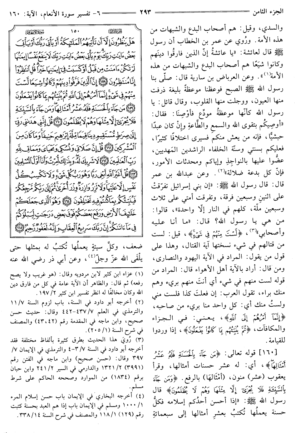 [160] قوله تعالى: {مَنْ جَاءَ بِالْحَسَنَةِ فَلَهُ عَشْرُ أَمْثَالِهَا} [الأنعام: 160] أَيْ: لَهُ عَشْرُ حَسَنَاتٍ أَمْثَالِهَا، وَقَرَأَ يَعْقُوبُ (عَشَرٌ) مُنَوَّنٌ، (أَمْثَالُهَا) بِالرَّفْعِ. {وَمَنْ جَاءَ بِالسَّيِّئَةِ فَلَا يُجْزَى إِلَّا مِثْلَهَا وَهُمْ لَا يُظْلَمُونَ} [الأنعام: 160] قَالَ رَسُولُ اللَّهِ صَلَّى اللَّهُ عَلَيْهِ وَسَلَّمَ. «إِذَا أَحْسَنَ أَحَدُكُمْ إِسْلَامَهُ فَكُلُّ حَسَنَةٍ يَعْمَلُهَا تُكْتَبُ بِعَشْرِ أَمْثَالِهَا إِلَى سَبْعِمِائَةِ ضِعْفٍ، وَكُلُّ سَيِّئَةٍ يَعْمَلُهَا تُكْتَبُ لَهُ بِمِثْلِهَا حَتَّى يَلْقَى اللَّهَ عَزَّ وجل» (¬4) وعن أَبِي ذَرٍّ رَضِيَ اللَّهُ عَنْهُ