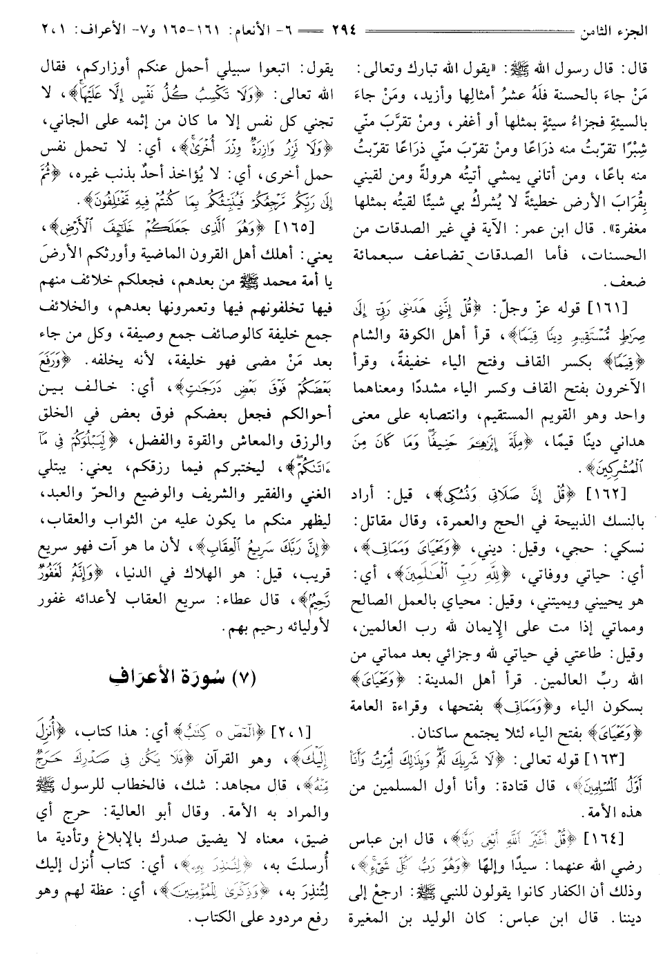 [164] {قُلْ أَغَيْرَ اللَّهِ أَبْغِي رَبًّا} [الأنعام: 164] قَالَ ابْنُ عَبَّاسٍ رَضِيَ اللَّهُ عَنْهُمَا: سَيِّدًا وَإِلَهًا {وَهُوَ رَبُّ كُلِّ شَيْءٍ} [الأنعام: 164] وَذَلِكَ أَنَّ الْكُفَّارَ كَانُوا يَقُولُونَ لِلنَّبِيِّ صَلَّى اللَّهُ عَلَيْهِ وَسَلَّمَ: ارْجِعْ إِلَى دِينِنَا. قَالَ ابْنُ عَبَّاسٍ: كَانَ الْوَلِيدُ بْنُ الْمُغِيرَةِ يَقُولُ: اتَّبِعُوا سَبِيلِي أَحْمِلْ عَنْكُمْ أَوْزَارَكُمْ، فَقَالَ اللَّهُ تَعَالَى: {وَلَا تَكْسِبُ كُلُّ نَفْسٍ إِلَّا عَلَيْهَا} [الأنعام: 164] لَا تَجْنِي كُلُّ نَفْسٍ إِلَّا مَا كَانَ مِنْ إِثْمِهِ عَلَى الْجَانِي، {وَلَا تَزِرُ وَازِرَةٌ وِزْرَ أُخْرَى} [الأنعام: 164] أَيْ: لَا تَحْمِلُ نَفْسٌ حِمْلَ أُخْرَى، أَيْ: لَا يُؤَاخَذُ أَحَدٌ بِذَنْبِ غَيْرِهِ، {ثُمَّ إِلَى رَبِّكُمْ مَرْجِعُكُمْ فَيُنَبِّئُكُمْ بِمَا كُنْتُمْ فِيهِ تَخْتَلِفُونَ} [الأنعام: 164]