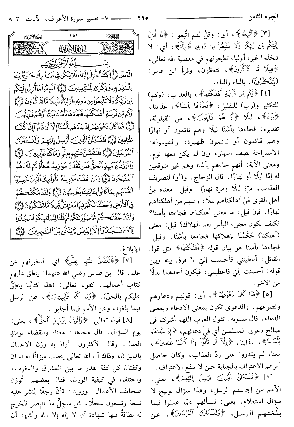 [7] {فَلَنَقُصَّنَّ عَلَيْهِمْ بِعِلْمٍ} [الأعراف: 7] أَيْ: لَنُخْبِرَنَّهُمْ عَنْ عِلْمٍ. قَالَ ابْنِ عَبَّاسٍ رَضِيَ اللَّهُ عَنْهُمَا: يَنْطِقُ عَلَيْهِمْ كِتَابُ أَعْمَالِهِمْ، كَقَوْلِهِ تَعَالَى: {هَذَا كِتَابُنَا يَنْطِقُ عَلَيْكُمْ بِالْحَقِّ} [الْجَاثِيَةِ: 29] {وَمَا كُنَّا غَائِبِينَ} [الأعراف: 7] عَنِ الرُّسُلِ فِيمَا بَلَّغُوا، وَعَنِ الأمم فيما أجابوا.