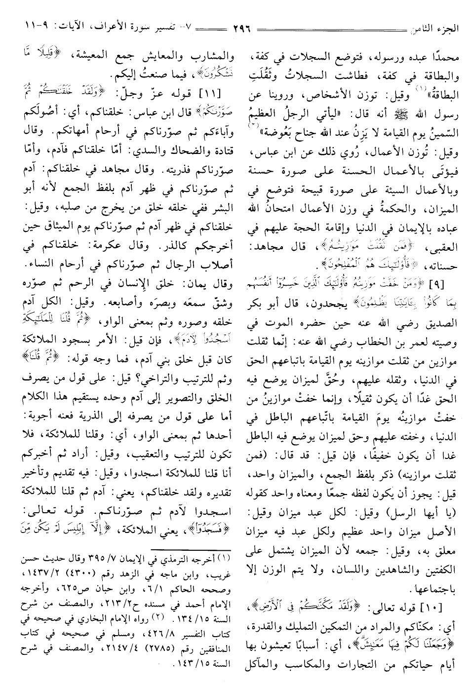 [9] {وَمَنْ خَفَّتْ مَوَازِينُهُ فَأُولَئِكَ الَّذِينَ خَسِرُوا أَنْفُسَهُمْ بِمَا كَانُوا بِآيَاتِنَا يَظْلِمُونَ} [الأعراف: 9] يجحدون، قَالَ أَبُو بَكْرٍ الصَّدِّيقُ رَضِيَ اللَّهُ عَنْهُ حِينَ حَضَرَهُ الْمَوْتُ فِي وَصِيَّتِهِ لِعُمَرَ بْنِ الْخَطَّابِ رَضِيَ اللَّهُ عَنْهُ: إِنَّمَا ثَقُلَتْ مَوَازِينُ مَنْ ثَقُلَتْ مَوَازِينُهُ يَوْمَ الْقِيَامَةِ بِاتِّبَاعِهِمُ الْحَقَّ فِي الدُّنْيَا, وَثِقَلِهِ عَلَيْهِمْ، وَحَقٌّ لِمِيزَانٍ يُوضَعُ فِيهِ الْحَقُّ غَدًا أَنْ يَكُونَ ثَقِيلًا، وَإِنَّمَا خَفَّتْ مَوَازِينُ مَنْ خَفَّتْ مَوَازِينُهُ يَوْمَ الْقِيَامَةِ بِاتِّبَاعِهِمُ الْبَاطِلَ فِي الدُّنْيَا، وَخِفَّتِهِ عَلَيْهِمْ وَحَقٌّ لِمِيزَانٍ يُوضَعُ فِيهِ الْبَاطِلُ غَدًا أَنْ يَكُونَ خَفِيفًا، فَإِنْ قيل: قد قال: (فمن ثَقُلَتْ مَوَازِينُهُ) ذُكِرَ بِلَفْظِ الْجَمْعِ، وَالْمِيزَانُ وَاحِدٌ، قِيلَ: يَجُوزُ أَنْ يَكُونَ لَفْظُهُ جَمْعًا وَمَعْنَاهُ وَاحِدٌ كقوله {يا أَيُّهَا الرُّسُلُ} [المؤمنون: 51] وَقِيلَ: لِكُلِّ عَبْدٍ مِيزَانٌ وَقِيلَ: الْأَصْلُ مِيزَانٌ وَاحِدٌ عَظِيمٌ وَلِكُلِّ عَبْدٍ فِيهِ مِيزَانٌ مُعَلَّقٌ بِهِ، وَقِيلَ: جَمَعَهُ لِأَنَّ الْمِيزَانَ يَشْتَمِلُ عَلَى الْكِفَّتَيْنِ وَالشَّاهِدَيْنِ وَاللِّسَانِ، وَلَا يَتِمُّ الْوَزْنُ إِلَّا بِاجْتِمَاعِهَا.
