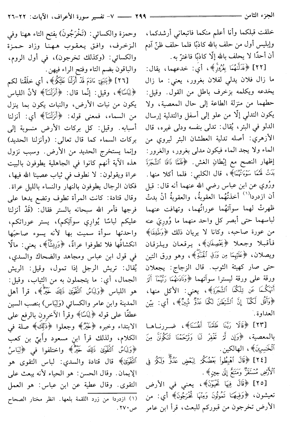 [26] {يَا بَنِي آدَمَ قَدْ أَنْزَلْنَا عَلَيْكُمْ} [الأعراف: 26] أي خلقنا لكم {لِبَاسًا} [الأعراف: 26] وقيل: إنما قال: {أَنْزَلْنَا} [الأعراف: 26] لأن اللباس يَكُونُ مِنْ نَبَاتِ الْأَرْضِ، وَالنَّبَاتُ يَكُونُ بِمَا يَنْزِلُ مِنَ السَّمَاءِ، فمعنى قوله: {أَنْزَلْنَا} [الأعراف: 26] أَيْ: أَنْزَلْنَا أَسْبَابَهُ. وَقِيلَ: كُلُّ بَرَكَاتِ الْأَرْضِ مَنْسُوبَةٌ إِلَى بَرَكَاتِ السَّمَاءِ كَمَا قَالَ تَعَالَى: {وَأَنْزَلْنَا الْحَدِيدَ} [الْحَدِيدِ: 25] وَإِنَّمَا يُسْتَخْرَجُ الْحَدِيدُ مِنَ الْأَرْضِ. وَسَبَبُ نُزُولِ هَذِهِ الْآيَةِ أَنَّهُمْ كَانُوا فِي الْجَاهِلِيَّةِ يَطُوفُونَ بِالْبَيْتِ عُرَاةً وَيَقُولُونَ: لَا نَطُوفُ فِي ثِيَابٍ عَصَيْنَا اللَّهَ فِيهَا، فَكَانَ الرِّجَالُ يَطُوفُونَ بِالنَّهَارِ وَالنِّسَاءُ بِاللَّيْلِ عُرَاةً. وَقَالَ قَتَادَةُ: كَانَتِ الْمَرْأَةُ تَطُوفُ وَتَضَعُ يَدَهَا عَلَى فرجها فَأَمَرَ اللَّهُ سُبْحَانَهُ بِالسَّتْرِ فَقَالَ: {قَدْ أَنْزَلْنَا عَلَيْكُمْ لِبَاسًا يُوَارِي سَوْآتِكُمْ} [الأعراف: 26] يَسْتُرُ عَوْرَاتِكُمْ، وَاحِدَتُهَا سَوْأَةٌ سُمِّيَتْ بِهَا لِأَنَّهُ يَسُوءُ صَاحِبَهَا انْكِشَافُهَا فلا تطوفوا عراة، {وَرِيشًا} [الأعراف: 26] يَعْنِي: مَالًا فِي قَوْلِ ابْنِ عَبَّاسٍ وَمُجَاهِدٍ وَالضَّحَّاكِ وَالسُّدِّيِّ، يُقَالُ: تَرَيَّشَ الرَّجُلُ إِذَا تَمَوَّلَ، وَقِيلَ: الرِّيشُ الْجَمَالُ، أَيْ: مَا يَتَجَمَّلُونَ بِهِ مِنَ الثِّيَابِ، وَقِيلَ: هُوَ اللِّبَاسُ {وَلِبَاسُ التَّقْوَى ذَلِكَ خَيْرٌ} [الأعراف: 26] قَرَأَ أَهْلُ الْمَدِينَةِ وَابْنُ عَامِرٍ وَالْكِسَائِيُّ (وَلِبَاسُ) بِنَصْبِ السِّينِ عَطْفًا على قوله {لِبَاسًا} [الأعراف: 26] وَقَرَأَ الْآخَرُونَ بِالرَّفْعِ عَلَى الِابْتِدَاءِ وخبره {خَيْرٌ} [الأعراف: 26] وَجَعَلُوا ذَلِكَ صِلَةً فِي الْكَلَامِ، وَلِذَلِكَ قَرَأَ ابْنُ مَسْعُودٍ وَأُبَيُّ بن كعب {وَلِبَاسُ التَّقْوَى ذَلِكَ خَيْرٌ} [الأعراف: 26] واختلفوا في (لِبَاسُ التَّقْوَى) قَالَ قَتَادَةُ وَالسُّدِّيُّ: لِبَاسُ التَّقْوَى هُوَ الْإِيمَانُ. وَقَالَ الْحَسَنُ: هُوَ الْحَيَاءُ لِأَنَّهُ يَبْعَثُ عَلَى التَّقْوَى. وَقَالَ عَطِيَّةُ عَنِ ابْنِ عباس: هو العمل