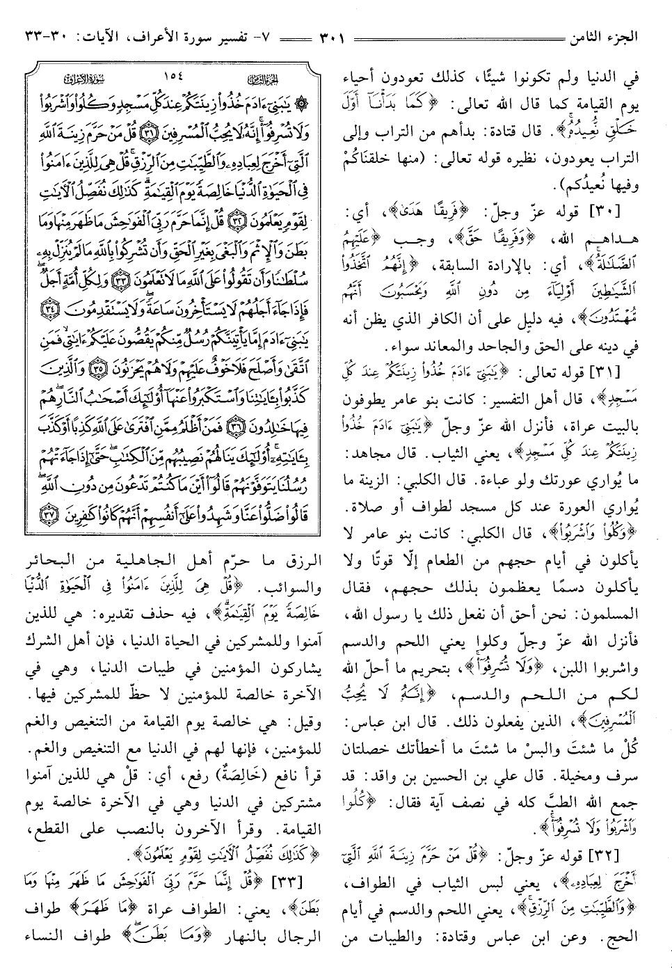 [31] قَوْلُهُ تَعَالَى: {يَا بَنِي آدَمَ خُذُوا زِينَتَكُمْ عِنْدَ كُلِّ مَسْجِدٍ} [الْأَعْرَافِ: 31] قَالَ أَهْلُ التَّفْسِيرِ: كَانَتْ بَنُو عَامِرٍ يَطُوفُونَ بِالْبَيْتِ عُرَاةً، فَأَنْزَلَ اللَّهُ عَزَّ وَجَلَّ {يَا بَنِي آدَمَ خُذُوا زِينَتَكُمْ عِنْدَ كُلِّ مَسْجِدٍ} [الأعراف: 31] يَعْنِي الثِّيَابَ. قَالَ مُجَاهِدٌ: مَا يُوَارِي عَوْرَتَكَ وَلَوْ عَبَاءَةٌ. قَالَ الْكَلْبِيُّ: الزِّينَةُ مَا يُوَارِي الْعَوْرَةَ عِنْدَ كُلِّ مَسْجِدٍ لِطَوَافٍ أَوْ صلاة. {وَكُلُوا وَاشْرَبُوا} [الأعراف: 31] قَالَ الْكَلْبِيُّ: كَانَتْ بَنُو عَامِرٍ لَا يَأْكُلُونَ فِي أَيَّامِ حَجِّهِمْ مِنَ الطَّعَامِ إِلَّا قُوتًا وَلَا يَأْكُلُونَ دَسَمًا يُعَظِّمُونَ بِذَلِكَ حَجَّهُمْ، فَقَالَ الْمُسْلِمُونَ: نَحْنُ أَحَقُّ أَنْ نَفْعَلَ ذَلِكَ يَا رَسُولَ اللَّهِ، فَأَنْزَلَ اللَّهُ عَزَّ وَجَلَّ وَكُلُوا يَعْنِي اللَّحْمَ وَالدَّسَمَ وَاشْرَبُوا اللَّبَنَ، {وَلَا تُسْرِفُوا} [الأعراف: 31] بِتَحْرِيمِ مَا أَحِلَّ اللَّهُ لَكُمْ مِنَ اللَّحْمِ وَالدَّسَمِ، {إِنَّهُ لَا يُحِبُّ الْمُسْرِفِينَ} [الأعراف: 31] الَّذِينَ يَفْعَلُونَ ذَلِكَ. قَالَ ابْنُ عَبَّاسٍ: كُلْ مَا شِئْتَ وَالْبَسْ مَا شِئْتَ مَا أَخْطَأَتْكَ خَصْلَتَانِ سَرَفٌ وَمَخِيلَةٌ. قَالَ عَلِيُّ بْنُ الْحُسَيْنِ بْنِ وَاقَدٍ: قَدْ جَمَعَ اللَّهُ الطِّبَّ كُلَّهُ فِي نِصْفِ آيَةٍ فَقَالَ: {وَكُلُوا وَاشْرَبُوا وَلَا تُسْرِفُوا} [الأعراف: 31]