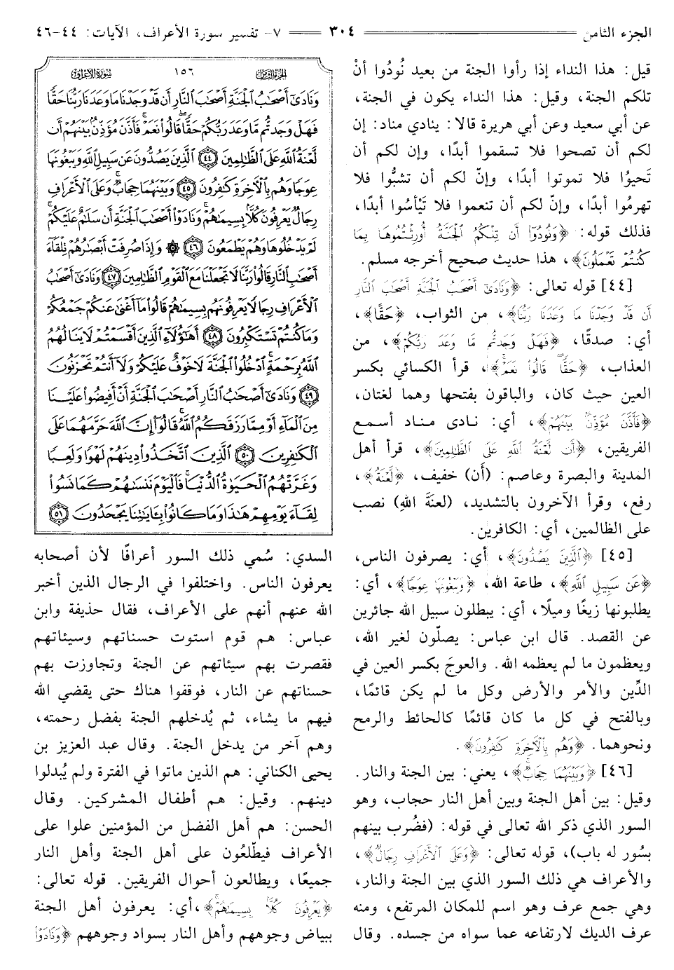 [46] {وَبَيْنَهُمَا حِجَابٌ} [الأعراف: 46] يَعْنِي: بَيْنَ الْجَنَّةِ وَالنَّارِ. وَقِيلَ. بَيْنَ أَهْلِ الْجَنَّةِ وَبَيْنَ أَهْلِ النَّارِ حِجَابٌ، وَهُوَ السُّورُ الَّذِي ذَكَرَ اللَّهُ تَعَالَى فِي قَوْلِهِ: {فَضُرِبَ بَيْنَهُمْ بِسُورٍ لَهُ بَابٌ} [الْحَدِيدِ: 13] قَوْلُهُ تَعَالَى: {وَعَلَى الْأَعْرَافِ رِجَالٌ} [الأعراف: 46] وَالْأَعْرَافُ هِيَ ذَلِكَ السُّورُ الَّذِي بَيْنَ الْجَنَّةِ وَالنَّارِ، وَهِيَ جَمْعُ عُرْفٍ وَهُوَ اسْمٌ لِلْمَكَانِ الْمُرْتَفِعِ، وَمِنْهُ عُرْفُ الدِّيكِ لِارْتِفَاعِهِ عَمَّا سِوَاهُ مِنْ جَسَدِهِ. وَقَالَ السُّدِّيُّ: سُمِّيَ ذَلِكَ السُّورُ أَعْرَافًا لِأَنَّ أَصْحَابَهُ يَعْرِفُونَ النَّاسَ. وَاخْتَلَفُوا فِي الرِّجَالِ الَّذِينَ أَخْبَرَ اللَّهُ عَنْهُمْ أَنَّهُمْ عَلَى الْأَعْرَافِ، فَقَالَ حُذَيْفَةُ وَابْنُ عَبَّاسٍ: هُمْ قَوْمٌ اسْتَوَتْ حَسَنَاتُهُمْ وَسَيِّئَاتُهُمْ فَقَصَّرَتْ بِهِمْ سَيِّئَاتُهُمْ عَنِ الْجَنَّةِ وَتَجَاوَزَتْ بِهِمْ حَسَنَاتُهُمْ عَنِ النَّارِ، فَوَقَفُوا هُنَاكَ حَتَّى يَقْضِيَ اللَّهُ فِيهِمْ مَا يَشَاءُ، ثم يدخلهما الْجَنَّةَ بِفَضْلِ رَحْمَتِهِ، وَهُمْ آخِرُ من يدخل الْجَنَّةَ. وَقَالَ عَبْدُ الْعَزِيزِ بْنُ يَحْيَى الْكِنَانِيُّ: هُمُ الَّذِينَ مَاتُوا فِي الْفَتْرَةِ وَلَمْ يُبَدِّلُوا دِينَهُمْ. وَقِيلَ. هُمْ أَطْفَالُ الْمُشْرِكِينَ. وَقَالَ الْحَسَنُ: هُمْ أَهْلُ الْفَضْلِ مِنَ الْمُؤْمِنِينَ عَلَوْا عَلَى الْأَعْرَافِ فَيَطَّلِعُونَ عَلَى أَهْلِ الْجَنَّةِ وَأَهْلِ النَّارِ جَمِيعًا، وَيُطَالِعُونَ أَحْوَالَ الْفَرِيقَيْنِ. قَوْلُهُ تعالى: {يَعْرِفُونَ كُلًّا بِسِيمَاهُمْ} [الأعراف: 46] أَيْ: يَعْرِفُونَ أَهْلَ الْجَنَّةِ بِبَيَاضِ وُجُوهِهِمْ وَأَهْلَ النَّارِ بِسَوَادِ وُجُوهِهِمْ {وَنَادَوْا أَصْحَابَ الْجَنَّةِ أَنْ سَلَامٌ عَلَيْكُمْ} [الأعراف: 46]