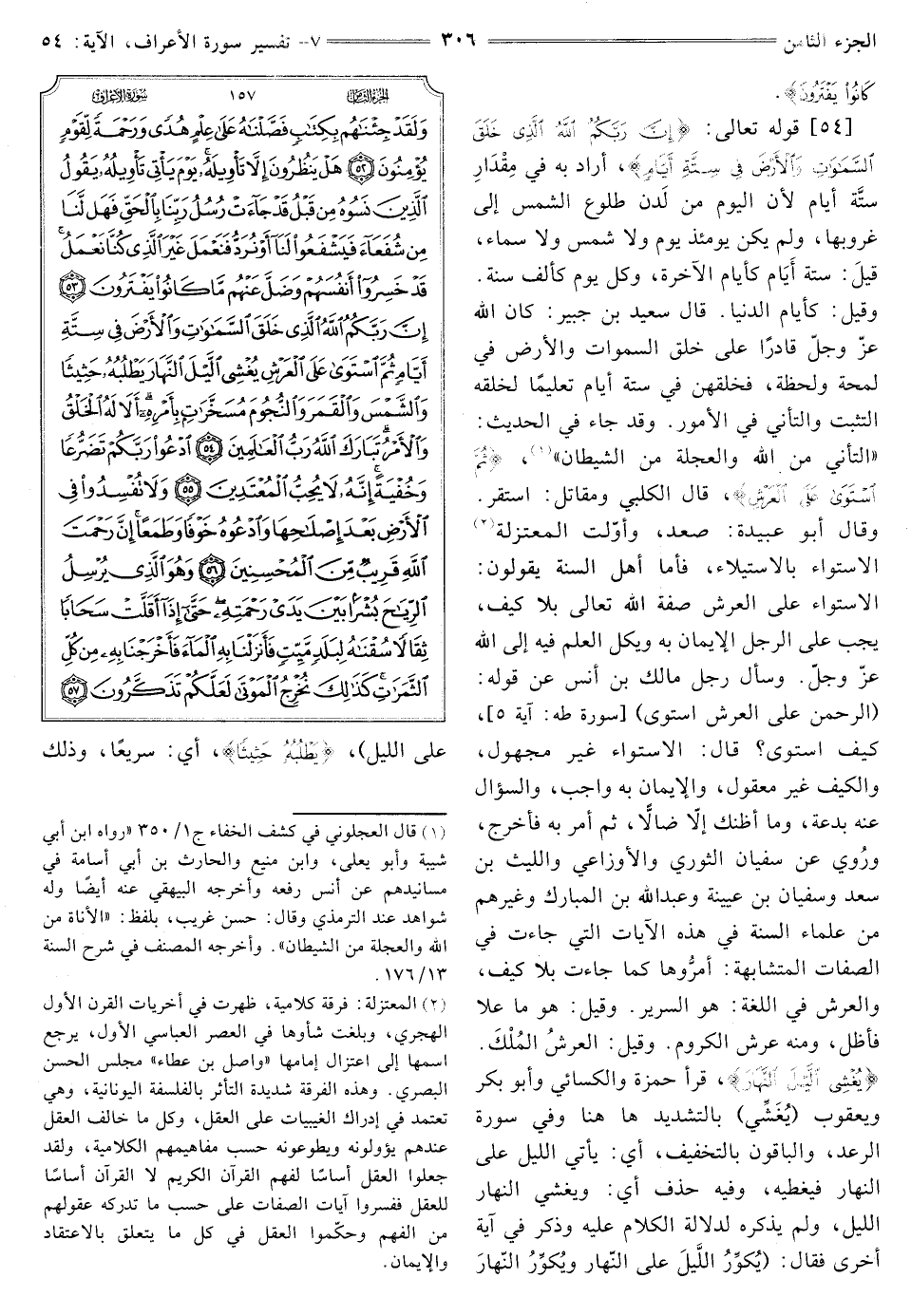 [54] قَوْلُهُ تَعَالَى: {إِنَّ رَبَّكُمُ اللَّهُ الَّذِي خَلَقَ السَّمَاوَاتِ وَالْأَرْضَ فِي سِتَّةِ أَيَّامٍ} [الأعراف: 54] أَرَادَ بِهِ فِي مِقْدَارِ سِتَّةِ أَيَّامٍ لِأَنَّ الْيَوْمَ مِنْ لَدُنْ طُلُوعِ الشَّمْسِ إِلَى غُرُوبِهَا، وَلَمْ يَكُنْ يَوْمَئِذٍ يَوْمٌ وَلَا شَمْسٌ وَلَا سَمَاءٌ، قِيلَ: سِتَّةُ أَيَّامٍ كَأَيَّامِ الْآخِرَةِ، وَكُلُّ يَوْمٍ كَأَلْفِ سَنَةٍ. وَقِيلَ: كَأَيَّامِ الدُّنْيَا. قَالَ سَعِيدُ بْنُ جُبَيْرٍ: كَانَ اللَّهُ عَزَّ وَجَلَّ قَادِرًا عَلَى خَلْقِ السموات وَالْأَرْضِ فِي لَمْحَةٍ وَلَحْظَةٍ، فَخَلَقَهُنَّ فِي سِتَّةِ أَيَّامٍ تَعْلِيمًا لِخَلْقِهِ التَّثَبُّتَ وَالتَّأَنِّي فِي الْأُمُورِ. وَقَدْ جَاءَ فِي الْحَدِيثِ: «التَّأَنِّي مِنَ اللَّهِ وَالْعَجَلَةُ مِنَ الشَّيْطَانِ» (¬1) {ثُمَّ اسْتَوَى عَلَى الْعَرْشِ} [الأعراف: 54] قَالَ الْكَلْبِيُّ وَمُقَاتِلٌ: اسْتَقَرَّ. وَقَالَ أَبُو عُبَيْدَةَ: صَعَدَ، وَأَوَّلَتِ الْمُعْتَزِلَةُ (¬2) الاستواء بالاستيلاء، فأما أهل السنة يقولون: الاستواء على العرش صفة الله تَعَالَى بِلَا كَيْفٍ، يَجِبُ عَلَى الرَّجُلِ الْإِيمَانُ بِهِ وَيَكِلُ الْعِلْمَ فِيهِ إِلَى اللَّهِ عَزَّ وَجَلَّ. وَسَأَلَ رَجُلٌ مَالِكَ بْنَ أَنَسٍ عَنْ قَوْلِهِ: {الرَّحْمَنُ عَلَى الْعَرْشِ اسْتَوَى} [طه: 5] كيف استوى؟ قَالَ: الِاسْتِوَاءُ غَيْرُ مَجْهُولٍ، وَالْكَيْفُ غَيْرُ مَعْقُولٍ، وَالْإِيمَانُ بِهِ وَاجِبٌ، وَالسُّؤَالُ عَنْهُ بِدْعَةٌ، وَمَا أَظُنُّكَ إِلَّا ضَالًّا، ثُمَّ أَمَرَ بِهِ فَأُخْرِجَ، وَرُوِيَ عَنْ سُفْيَانَ الثَّوْرِيِّ وَالْأَوْزَاعِيِّ وَاللَّيْثِ بْنِ سَعْدٍ وَسُفْيَانَ بْنِ عُيَيْنَةَ وَعَبْدِ اللَّهِ بْنِ الْمُبَارَكِ وَغَيْرِهِمْ مِنْ عُلَمَاءِ السُّنَّةِ فِي هَذِهِ الْآيَاتِ الَّتِي جَاءَتْ فِي الصِّفَاتِ الْمُتَشَابِهَةِ: أَمَرُّوهَا كَمَا جَاءَتْ بِلَا كَيْفٍ، وَالْعَرْشُ فِي اللُّغَةِ: هُوَ السَّرِيرُ. وَقِيلَ: هُوَ مَا عَلَا فَأَظَلَّ، وَمِنْهُ عَرْشُ الْكُرُومُ. وَقِيلَ: الْعَرْشُ الْمُلْكُ. {يُغْشِي اللَّيْلَ النَّهَارَ} [الأعراف: 54] قَرَأَ حَمْزَةُ وَالْكِسَائِيُّ وَأَبُو بَكْرٍ ويعقوب (يغشي) بالتشديد ها هنا وَفِي سُورَةِ الرَّعْدِ، وَالْبَاقُونَ بِالتَّخْفِيفِ، أَيْ: يَأْتِي اللَّيْلُ عَلَى النَّهَارِ فَيُغَطِّيهِ، وَفِيهِ حَذْفٌ أَيْ: وَيُغْشِي النَّهَارُ اللَّيْلَ، وَلَمْ يَذْكُرْهُ لِدَلَالَةِ الْكَلَامِ عَلَيْهِ وَذَكَرَ فِي آيَةٍ أُخْرَى فَقَالَ: {يُكَوِّرُ اللَّيْلَ عَلَى النَّهَارِ وَيُكَوِّرُ النَّهَارَ عَلَى اللَّيْلِ} [الزمر: 5] {يَطْلُبُهُ حَثِيثًا} [الأعراف: 54] أي: سريعا، وذلك