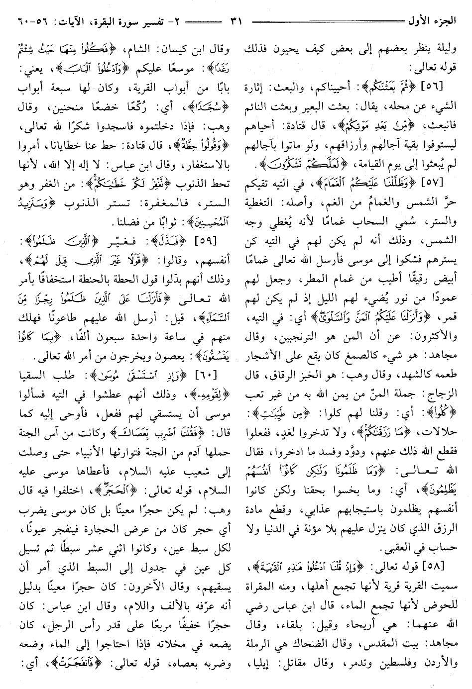 [58] ، قوله تعالى: {وَإِذْ قُلْنَا ادْخُلُوا هَذِهِ الْقَرْيَةَ} [البقرة: 58] سُمِّيَتِ الْقَرْيَةُ قَرْيَةً لِأَنَّهَا تَجْمَعُ أَهْلَهَا، وَمِنْهُ الْمِقْرَاةُ لِلْحَوْضِ لِأَنَّهَا تَجْمَعُ الْمَاءَ، قَالَ ابْنُ عَبَّاسٍ رَضِيَ اللَّهُ عَنْهُمَا: هِيَ أَرِيحَاءُ وَقِيلَ: بَلْقَاءُ، وَقَالَ مُجَاهِدٌ: بَيْتُ الْمَقْدِسِ، وَقَالَ الضَّحَّاكُ: هِيَ الرَّمْلَةُ وَالْأُرْدُنُّ وَفِلَسْطِينُ وَتَدْمُرُ، وَقَالَ مُقَاتِلٌ: إِيلِيَا، وَقَالَ ابْنُ كَيْسَانَ: الشَّامُ، {فَكُلُوا مِنْهَا حَيْثُ شِئْتُمْ رَغَدًا} [البقرة: 58] موسعًا عليكم {وَادْخُلُوا الْبَابَ} [البقرة: 58] يَعْنِي: بَابًا مِنْ أَبْوَابِ الْقَرْيَةِ، وَكَانَ لَهَا سَبْعَةُ أَبْوَابٍ {سُجَّدًا} [البقرة: 58] أَيْ: رُكّعًا خُضَّعًا مُنْحَنِينَ، وَقَالَ وَهْبٌ: فَإِذَا دَخَلْتُمُوهُ فَاسْجُدُوا شُكْرًا لله تعالى، {وَقُولُوا حِطَّةٌ} [البقرة: 58] قَالَ قَتَادَةُ: حُطَّ عَنَّا خَطَايَانَا، أمروا بالاستغفار، وقال ابْنُ عَبَّاسٍ: لَا إِلَهَ إِلَّا الله، لأنها تحط الذنوب {نَغْفِرْ لَكُمْ خَطَايَاكُمْ} [البقرة: 58] مِنَ الْغَفْرِ وَهُوَ السَّتْرُ، فَالْمَغْفِرَةُ: تستر الذنوب {وَسَنَزِيدُ الْمُحْسِنِينَ} [البقرة: 58] ثوابًا من فضلنا.