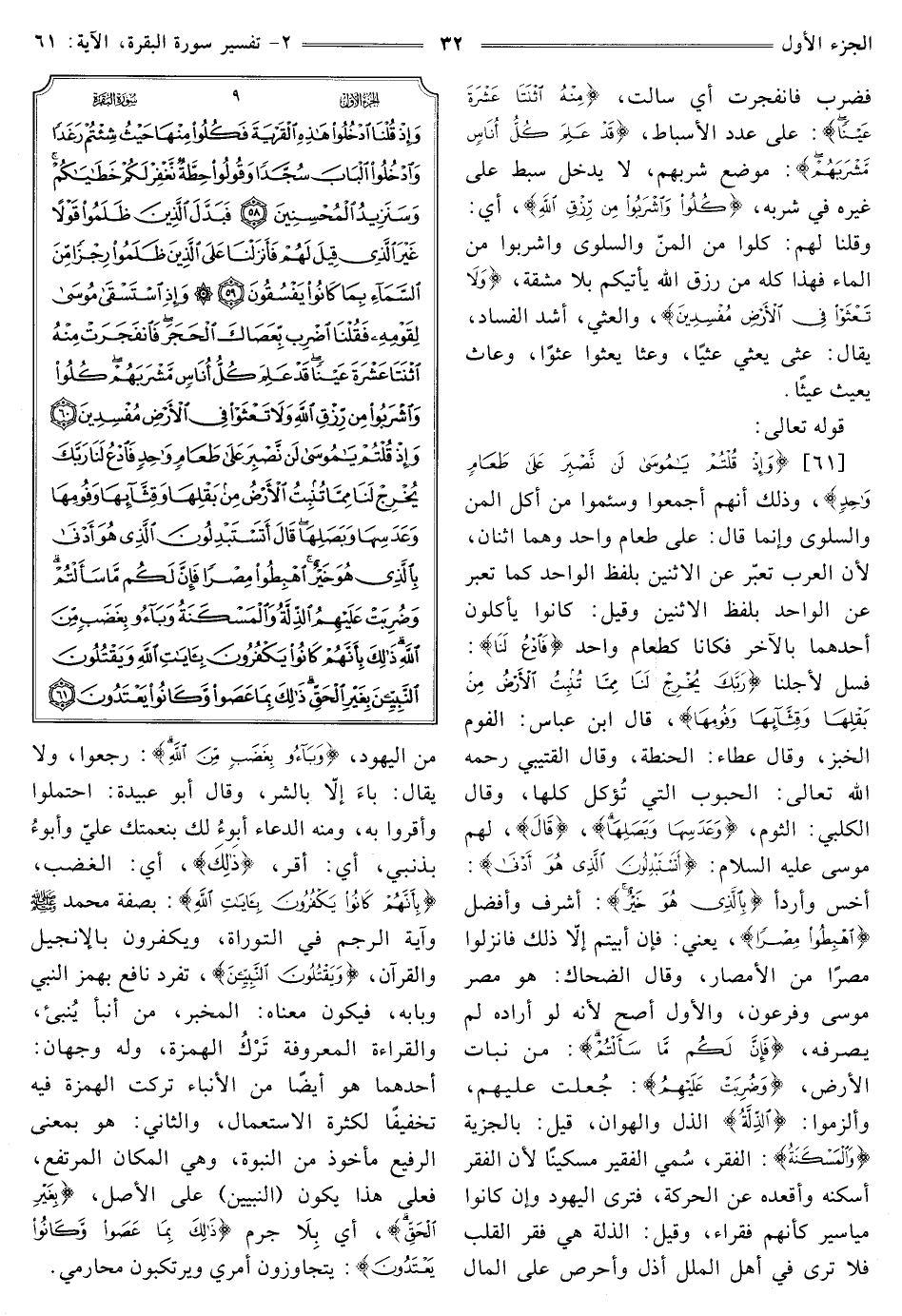 [61] {وَإِذْ قُلْتُمْ يَا مُوسَى لَنْ نَصْبِرَ عَلَى طَعَامٍ وَاحِدٍ} [البقرة: 61] وَذَلِكَ أَنَّهُمْ أَجْمَعُوا وَسَئِمُوا مِنْ أَكْلِ الْمَنِّ وَالسَّلْوَى وَإِنَّمَا قَالَ: عَلَى طَعَامٍ وَاحِدٍ وَهُمَا اثْنَانِ، لِأَنَّ الْعَرَبَ تُعَبِّرُ عَنِ الِاثْنَيْنِ بِلَفْظِ الْوَاحِدِ كَمَا تُعَبِّرُ عَنِ الواحد بلفظ الاثنين وَقِيلَ: كَانُوا يَأْكُلُونَ أَحَدَهُمَا بِالْآخَرِ فكانا كطعام واحد {فَادْعُ لَنَا} [البقرة: 61] فسل لِأَجْلِنَا {رَبَّكَ يُخْرِجْ لَنَا مِمَّا تُنْبِتُ الْأَرْضُ مِنْ بَقْلِهَا وَقِثَّائِهَا وَفُومِهَا} [البقرة: 61] قال ابن عباس: الفوم الْخُبْزُ، وَقَالَ عَطَاءٌ: الْحِنْطَةُ، وَقَالَ الْقُتَيْبِيُّ رَحِمَهُ اللَّهُ تَعَالَى: الْحُبُوبُ الَّتِي تُؤكل كُلُّهَا، وَقَالَ الْكَلْبِيُّ: الثوم، {وَعَدَسِهَا وَبَصَلِهَا قَالَ} [البقرة: 61] لَهُمْ مُوسَى عَلَيْهِ السَّلَامُ: {أَتَسْتَبْدِلُونَ الَّذِي هُوَ أَدْنَى} [البقرة: 61] أخس وأردأ {بِالَّذِي هُوَ خَيْرٌ} [البقرة: 61] أشرف وأفضل {اهْبِطُوا مِصْرًا} [البقرة: 61] يَعْنِي: فَإِنْ أَبَيْتُمْ إِلَّا ذَلِكَ فَانْزِلُوا مِصْرًا مِنَ الْأَمْصَارِ، وَقَالَ الضَّحَّاكُ: هُوَ مِصْرُ مُوسَى وَفِرْعَوْنَ، وَالْأَوَّلُ أَصَحُّ لِأَنَّهُ لَوْ أَرَادَهُ لَمْ يَصْرِفْهُ، {فَإِنَّ لَكُمْ مَا سَأَلْتُمْ} [البقرة: 61] من نبات الأرض، {وَضُرِبَتْ عَلَيْهِمُ} [البقرة: 61] جُعلت عليهم، وألزموا: {الذِّلَّةُ} [البقرة: 61] والذل والهوان، قيل: بالجزية {وَالْمَسْكَنَةُ} [البقرة: 61] الْفَقْرُ، سُمي الْفَقِيرُ مِسْكِينًا لِأَنَّ الْفَقْرَ أَسْكَنَهُ وَأَقْعَدَهُ عَنِ الْحَرَكَةِ، فَتَرَى الْيَهُودَ وَإِنْ كَانُوا مَيَاسِيرَ كَأَنَّهُمْ فُقَرَاءُ، وَقِيلَ: الذِّلَّةُ هِيَ فَقْرُ الْقَلْبِ فَلَا تَرَى فِي أَهْلِ الْمِلَلِ أَذَلَّ وَأَحْرَصَ عَلَى الْمَالِ مِنَ الْيَهُودِ، {وَبَاءُوا بِغَضَبٍ مِنَ اللَّهِ} [البقرة: 61] رجعوا، ولا يقال: باءَ إلّا بالشر، وَقَالَ أَبُو عُبَيْدَةَ: احْتَمَلُوا وَأَقَرُّوا بِهِ، وَمِنْهُ الدُّعَاءُ أبوءُ لَكَ بِنِعْمَتِكَ عَلَيَّ وأبوءُ بِذَنْبِي، أَيْ: أقر، {ذَلِكَ} [البقرة: 61] أَيِ: الْغَضَبُ، {بِأَنَّهُمْ كَانُوا يَكْفُرُونَ بِآيَاتِ اللَّهِ} [البقرة: 61] بِصِفَةِ مُحَمَّدٍ صَلَّى اللَّهُ عَلَيْهِ وَسَلَّمَ وَآيَةِ الرَّجْمِ فِي التَّوْرَاةِ، وَيَكْفُرُونَ بِالْإِنْجِيلِ وَالْقُرْآنِ، {وَيَقْتُلُونَ النَّبِيِّينَ} [البقرة: 61] تَفَرَّدَ نَافِعٌ بِهَمْزِ النَّبِيِّ وَبَابِهِ، فَيَكُونُ مَعْنَاهُ: الْمُخْبِرُ، مِنْ أَنْبَأَ يُنبئ، وَالْقِرَاءَةُ الْمَعْرُوفَةُ تَرْكُ الْهَمْزَةِ، وَلَهُ وَجْهَانِ: أَحَدُهُمَا هُوَ أَيْضًا مِنَ الْإِنْبَاءِ تُرِكَتِ الْهَمْزَةُ فِيهِ تَخْفِيفًا لِكَثْرَةِ الِاسْتِعْمَالِ، وَالثَّانِي: هُوَ بِمَعْنَى الرَّفِيعِ مَأْخُوذٌ مِنَ النُّبُوَّةِ، وَهِيَ الْمَكَانُ الْمُرْتَفِعُ، فَعَلَى هَذَا يَكُونُ (النَّبِيِّينَ) عَلَى الْأَصْلِ، {بِغَيْرِ الْحَقِّ} [البقرة: 61] أي بلا جرم {ذَلِكَ بِمَا عَصَوْا وَكَانُوا يَعْتَدُونَ} [البقرة: 61] يَتَجَاوَزُونَ أَمْرِي وَيَرْتَكِبُونَ مَحَارِمِي.